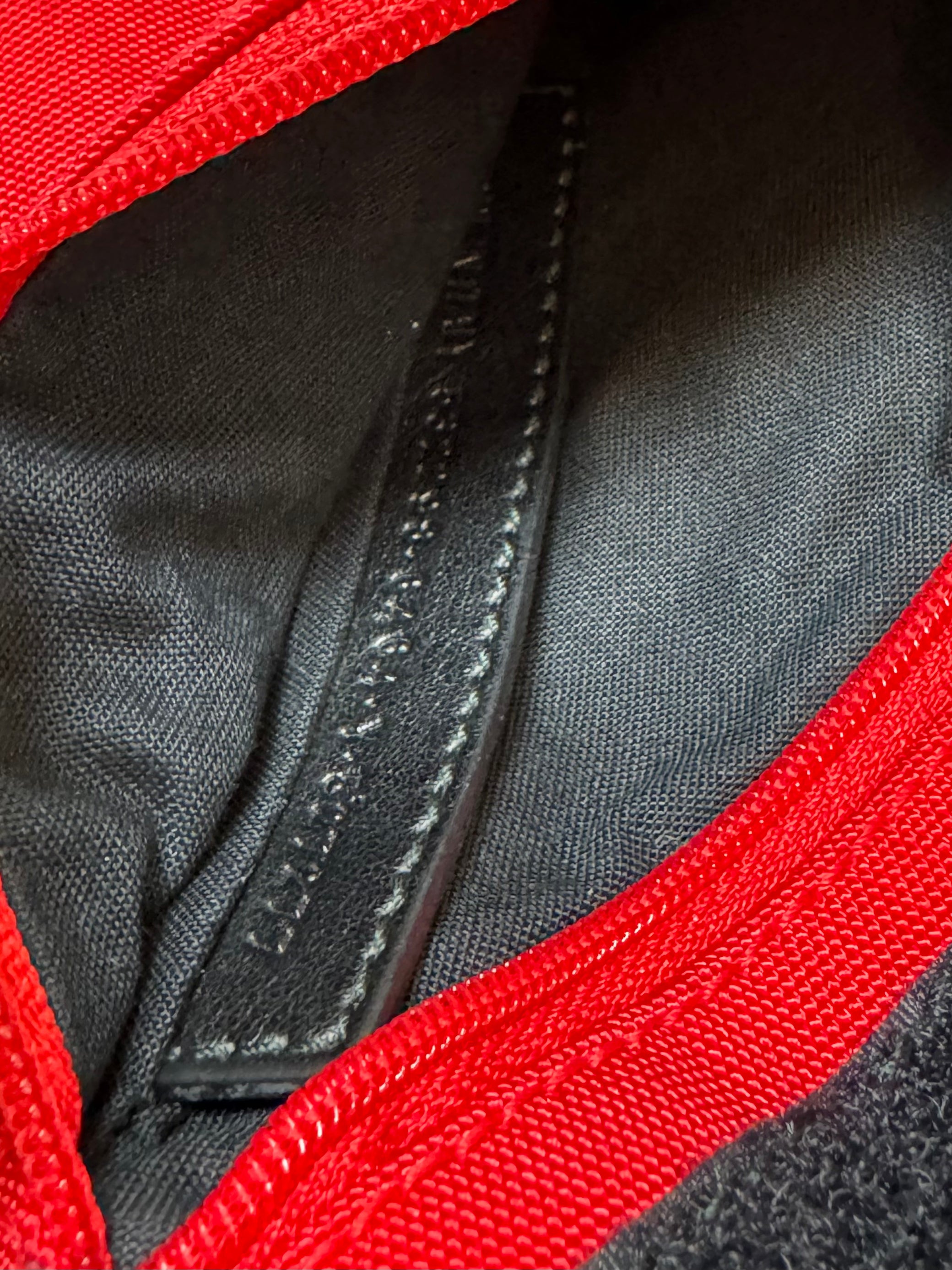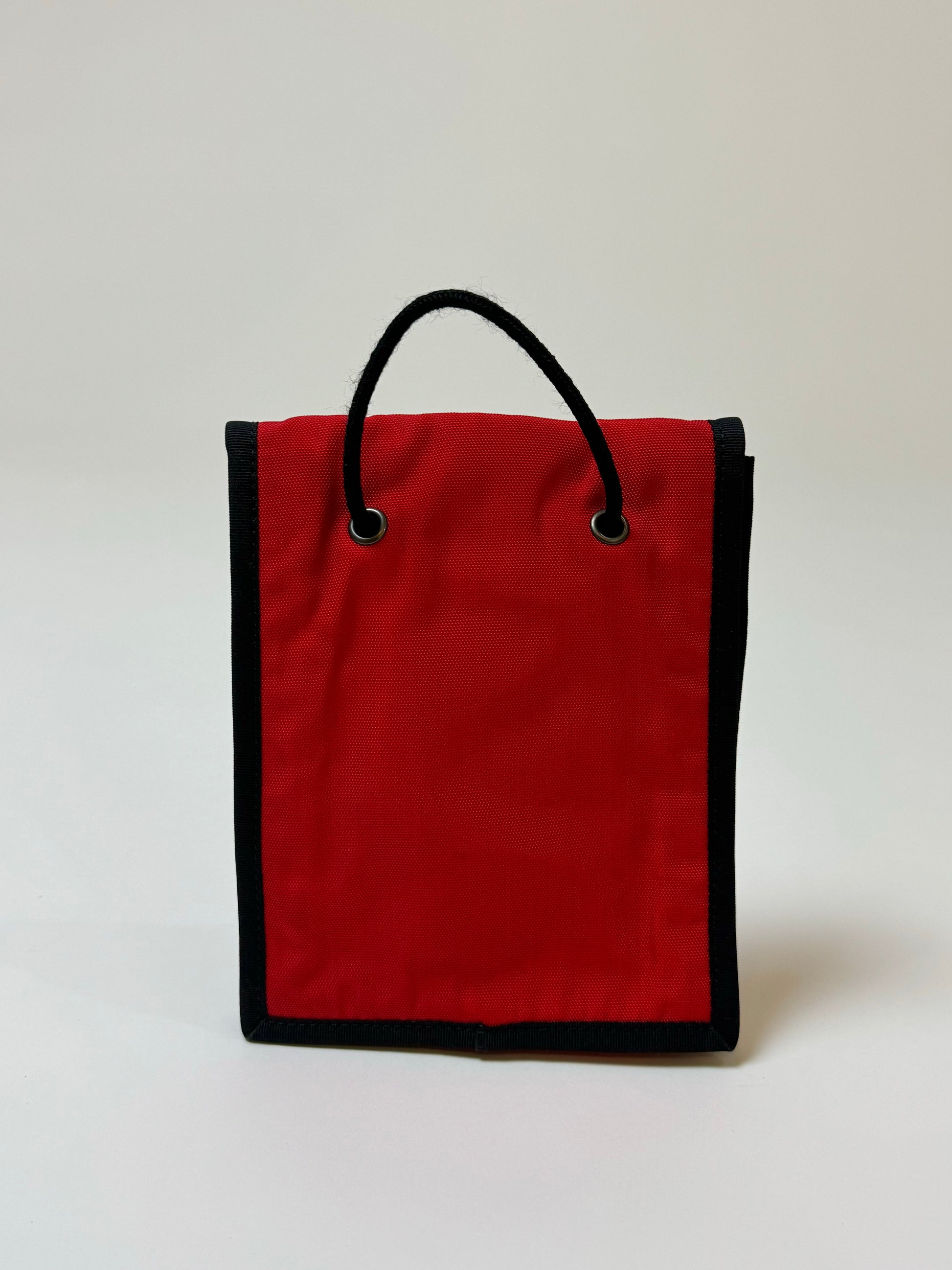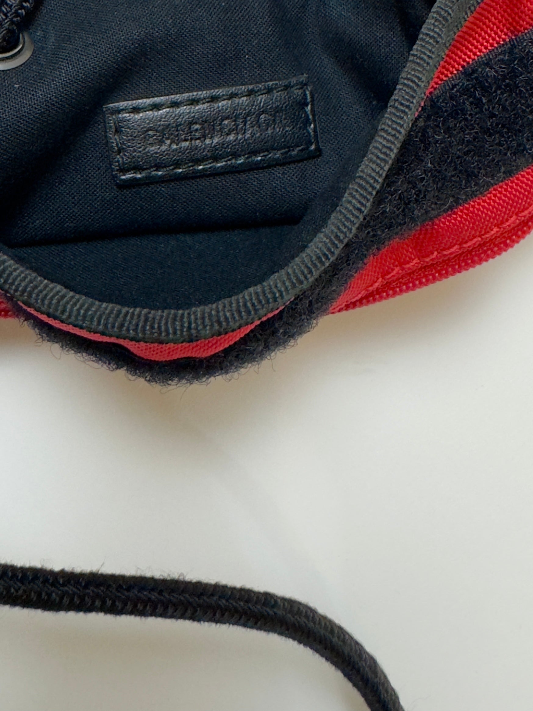 Nylon canvas pouch in red. Grosgrain trim in black throughout. Drawstring shoulder strap. Textile logo patch and zippered pocket at face.