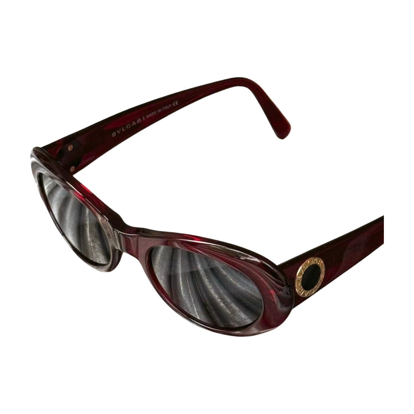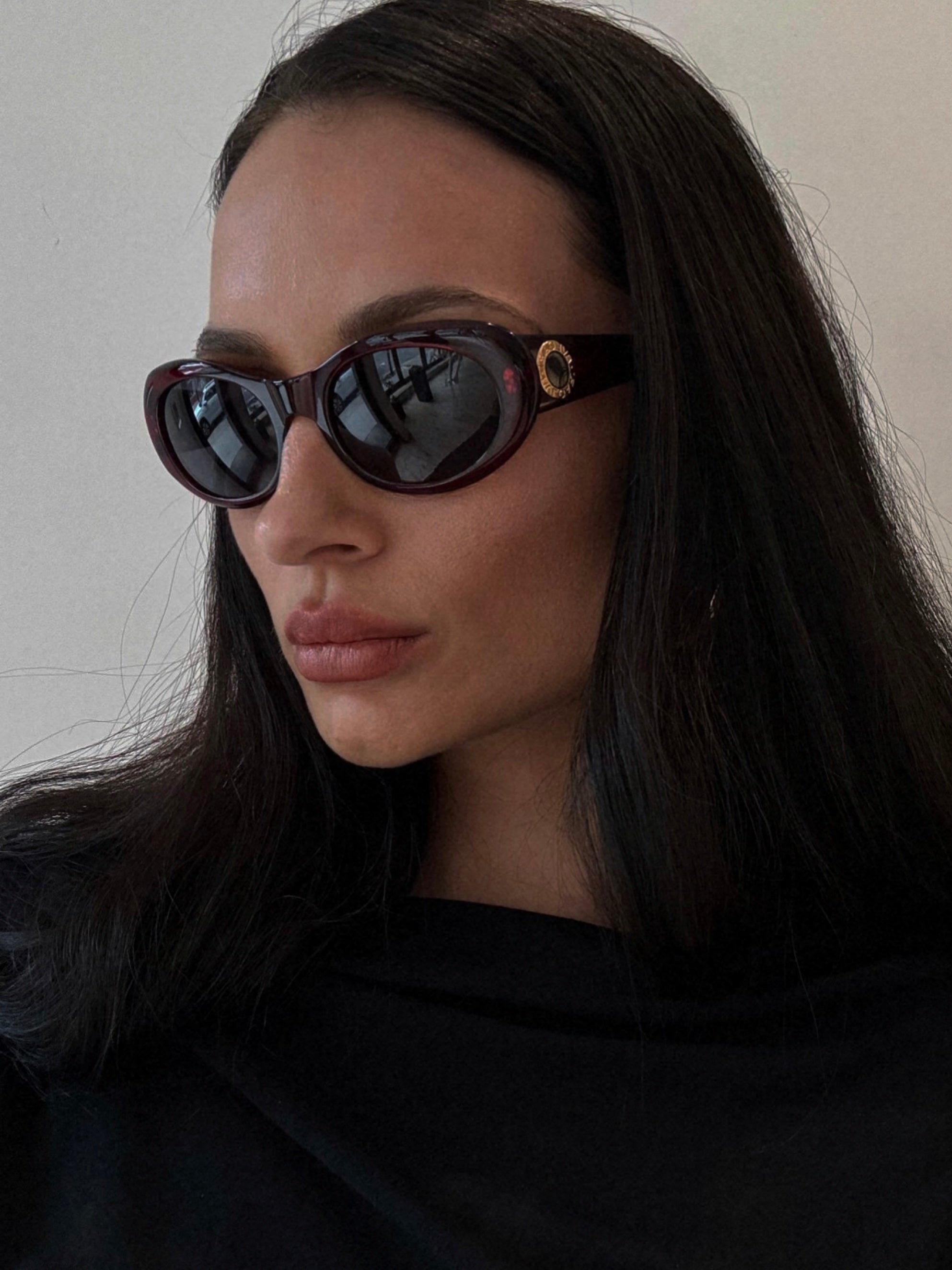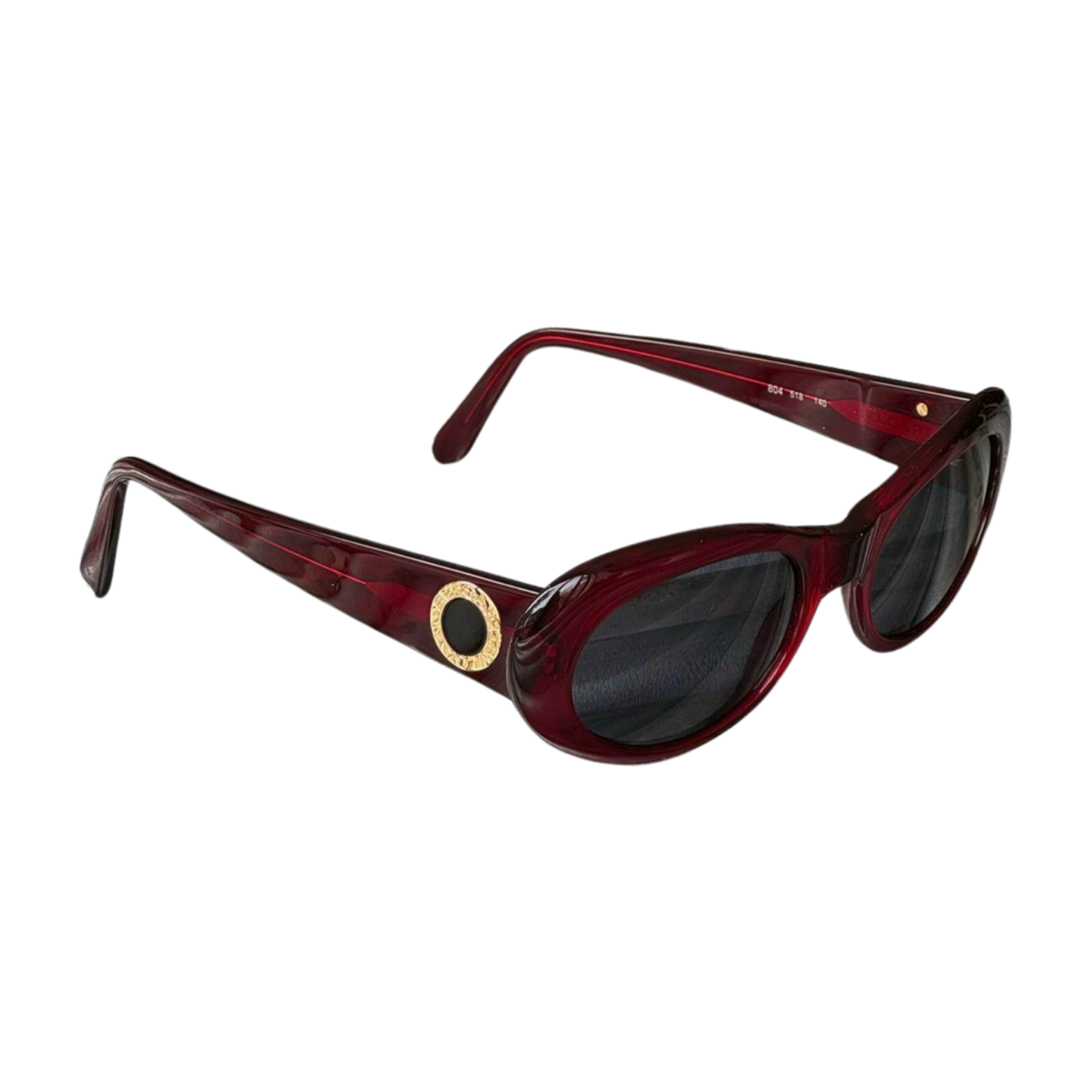 + Round sunglasses featuring gold detailing with logo at each side and thick acetate framing. Color red/burgundy.