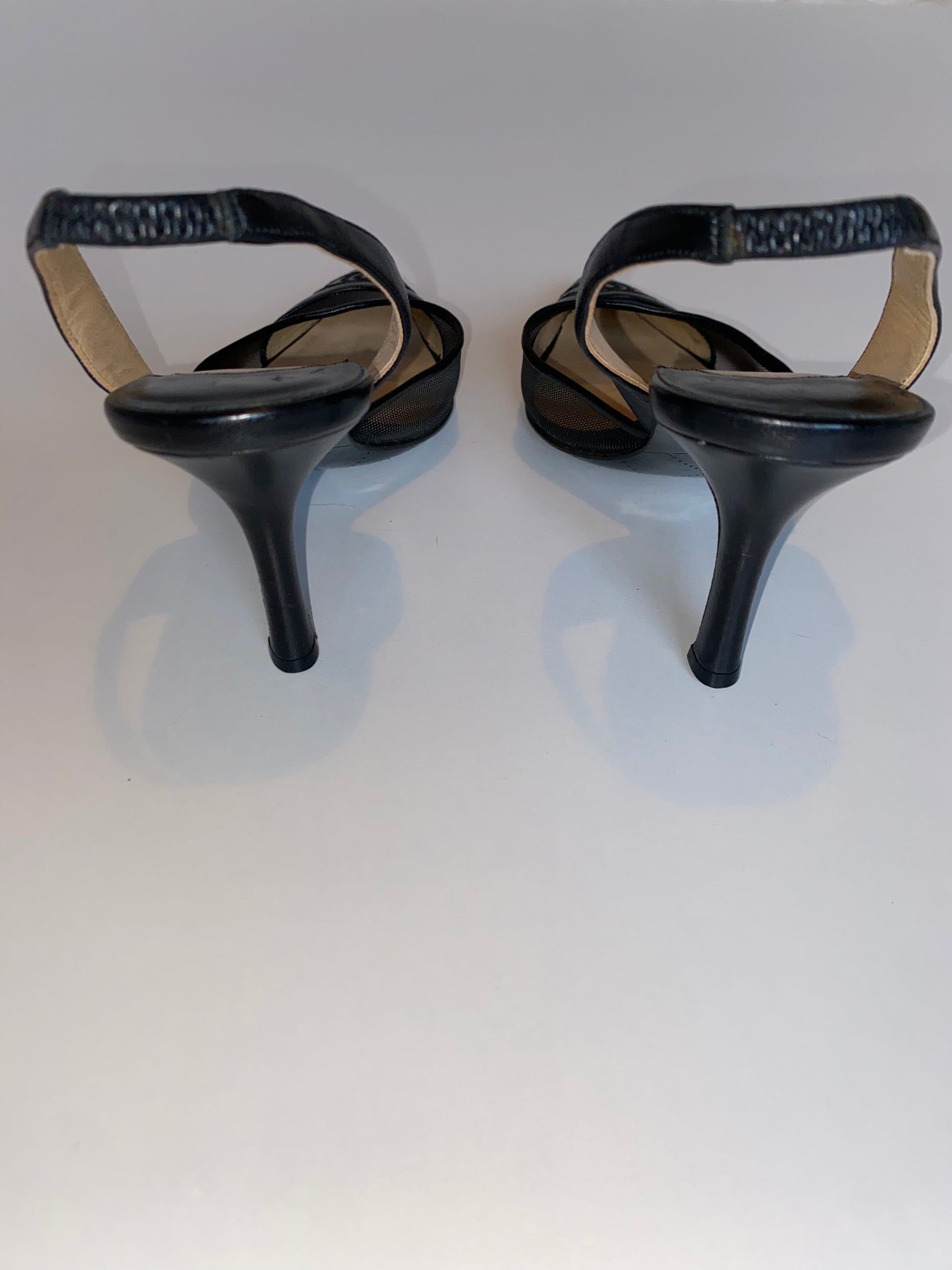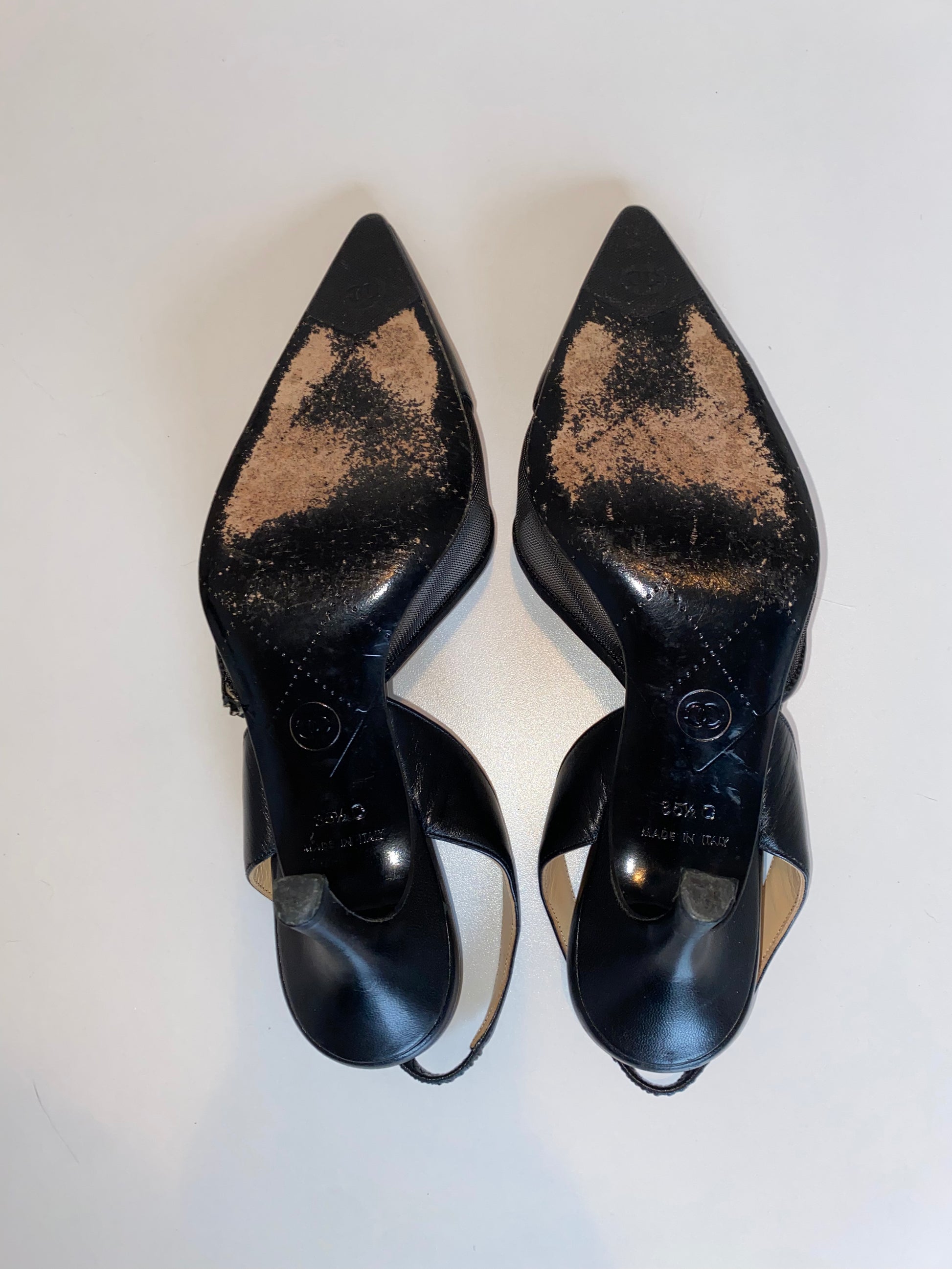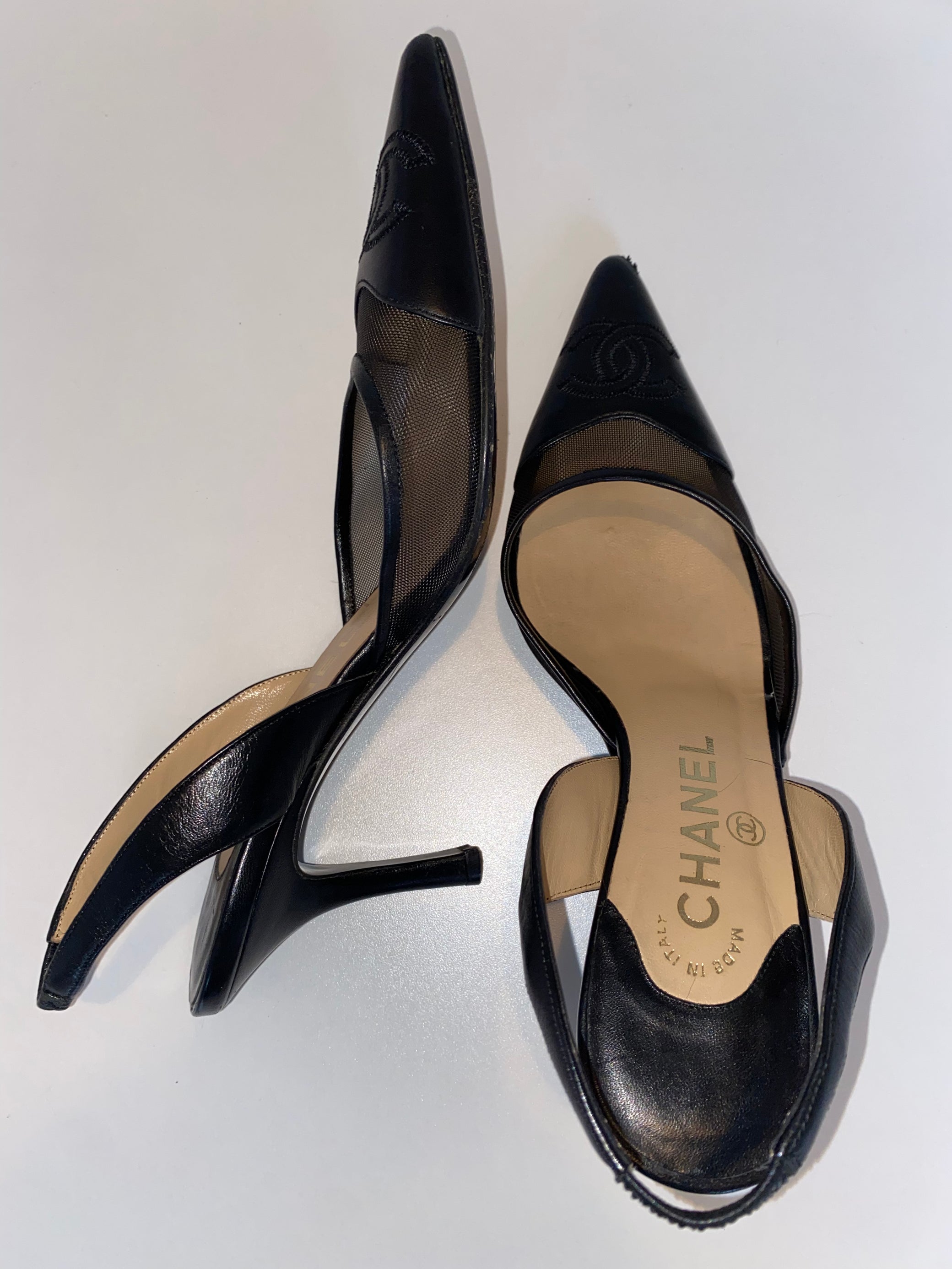 + Mid heel stilleto in leather, featuring mesh detailing and CC logo at toe point