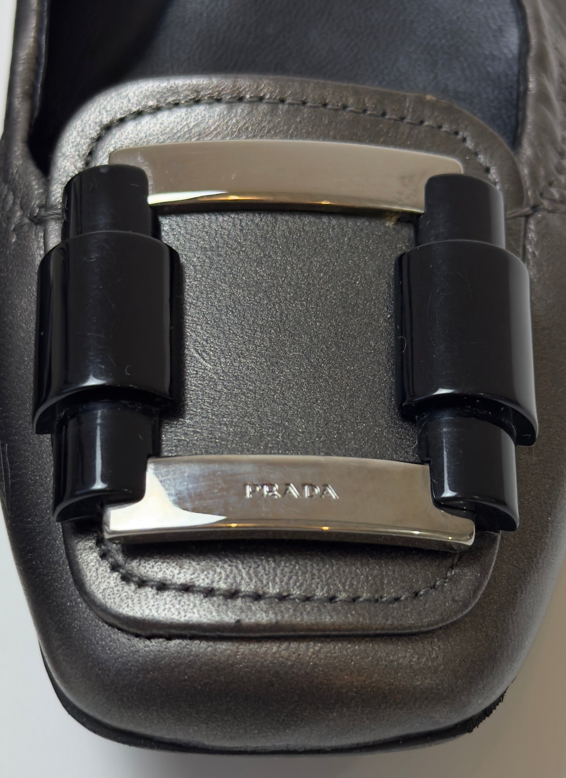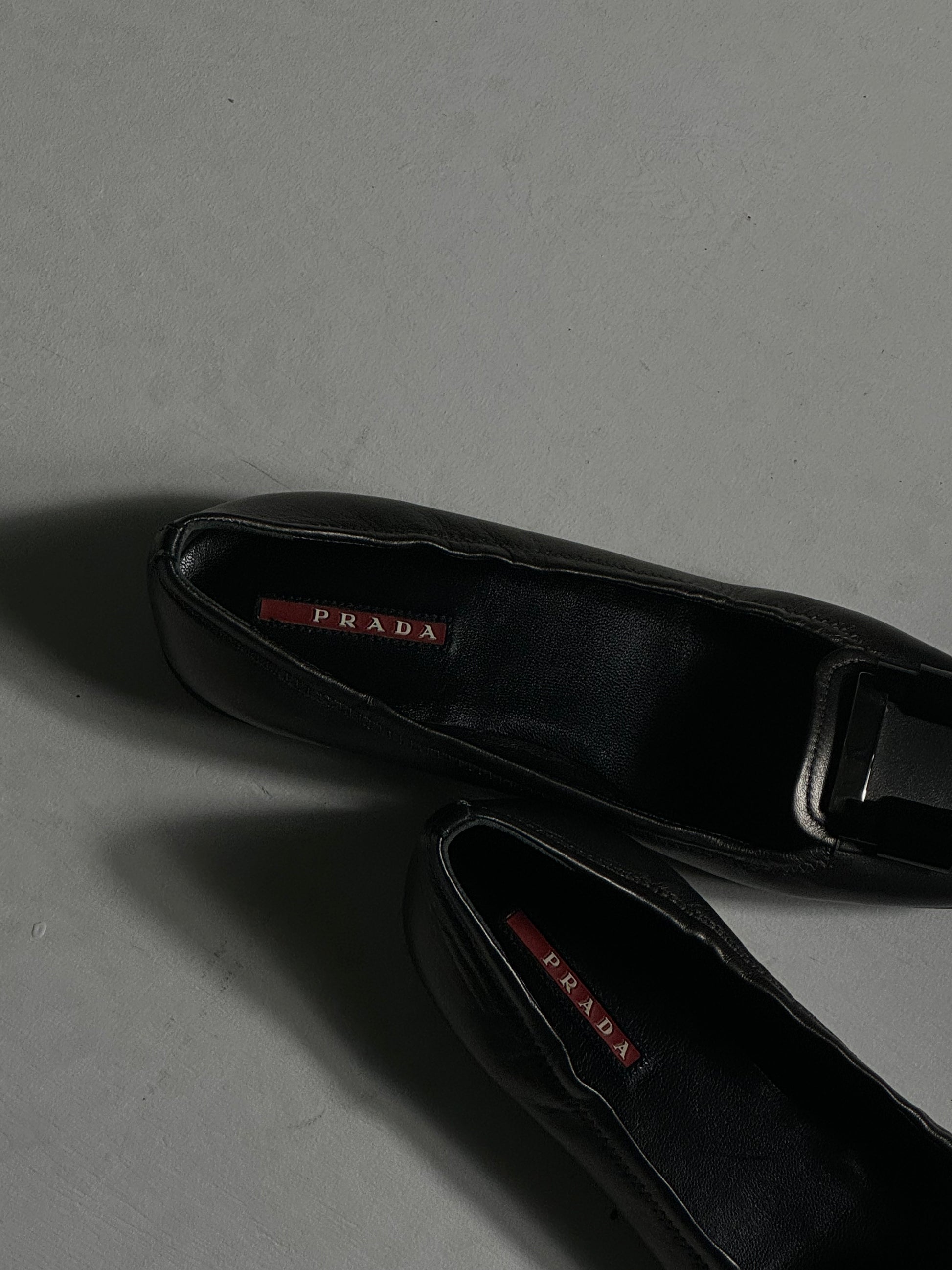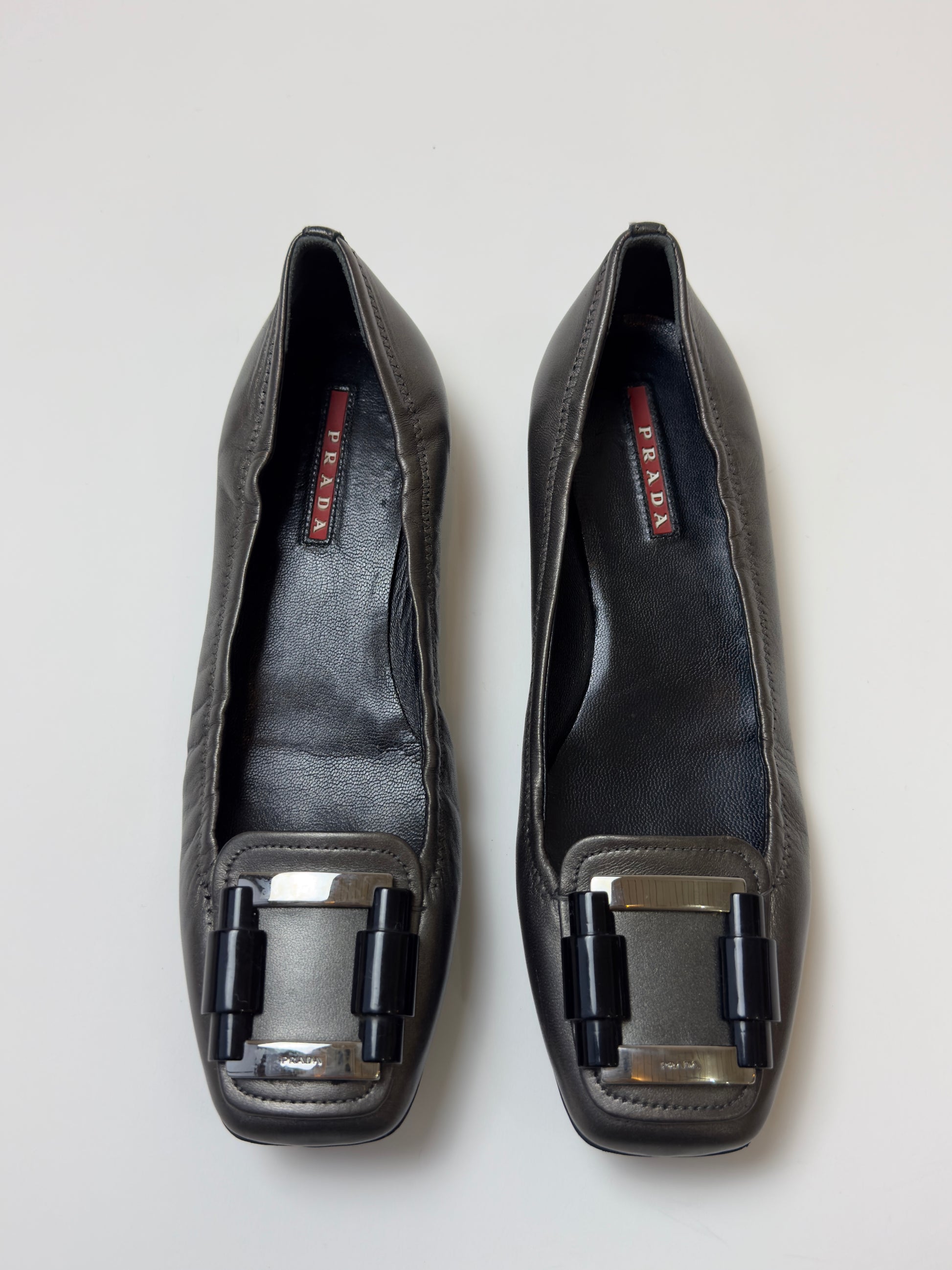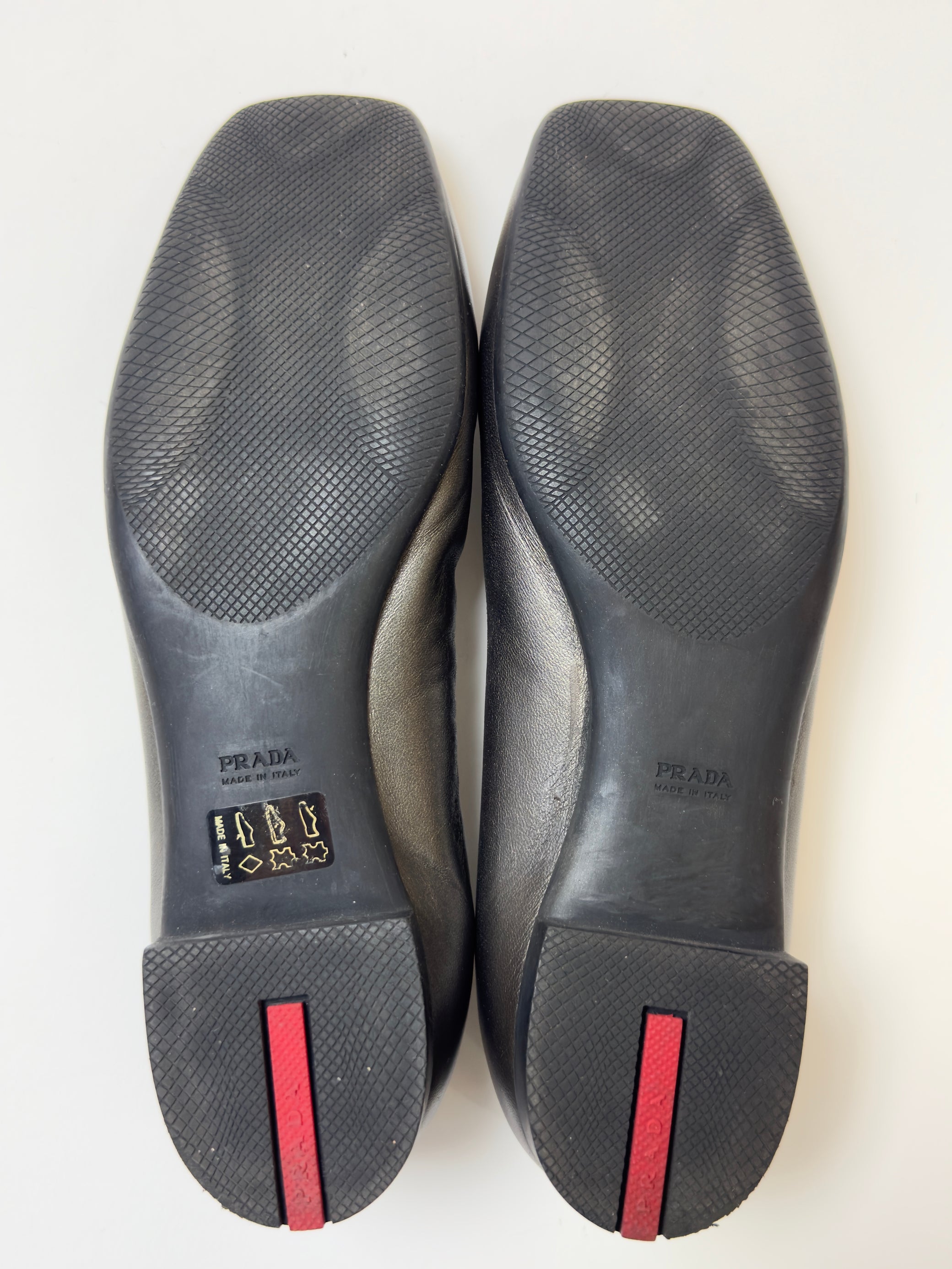 Prada square toe ballerina shoes, featuring logo engraved silver hardware plaque and elastic scrunch back.