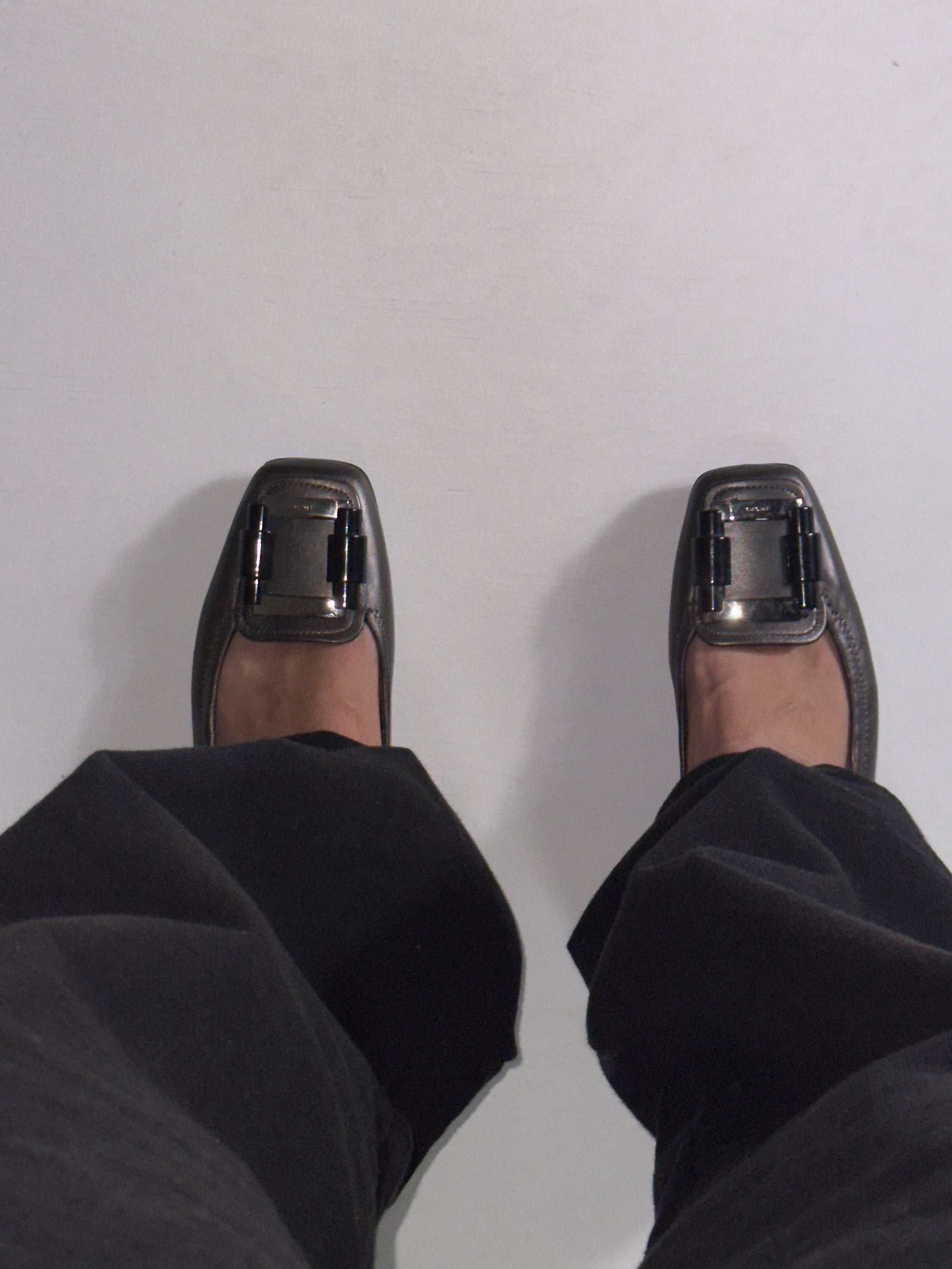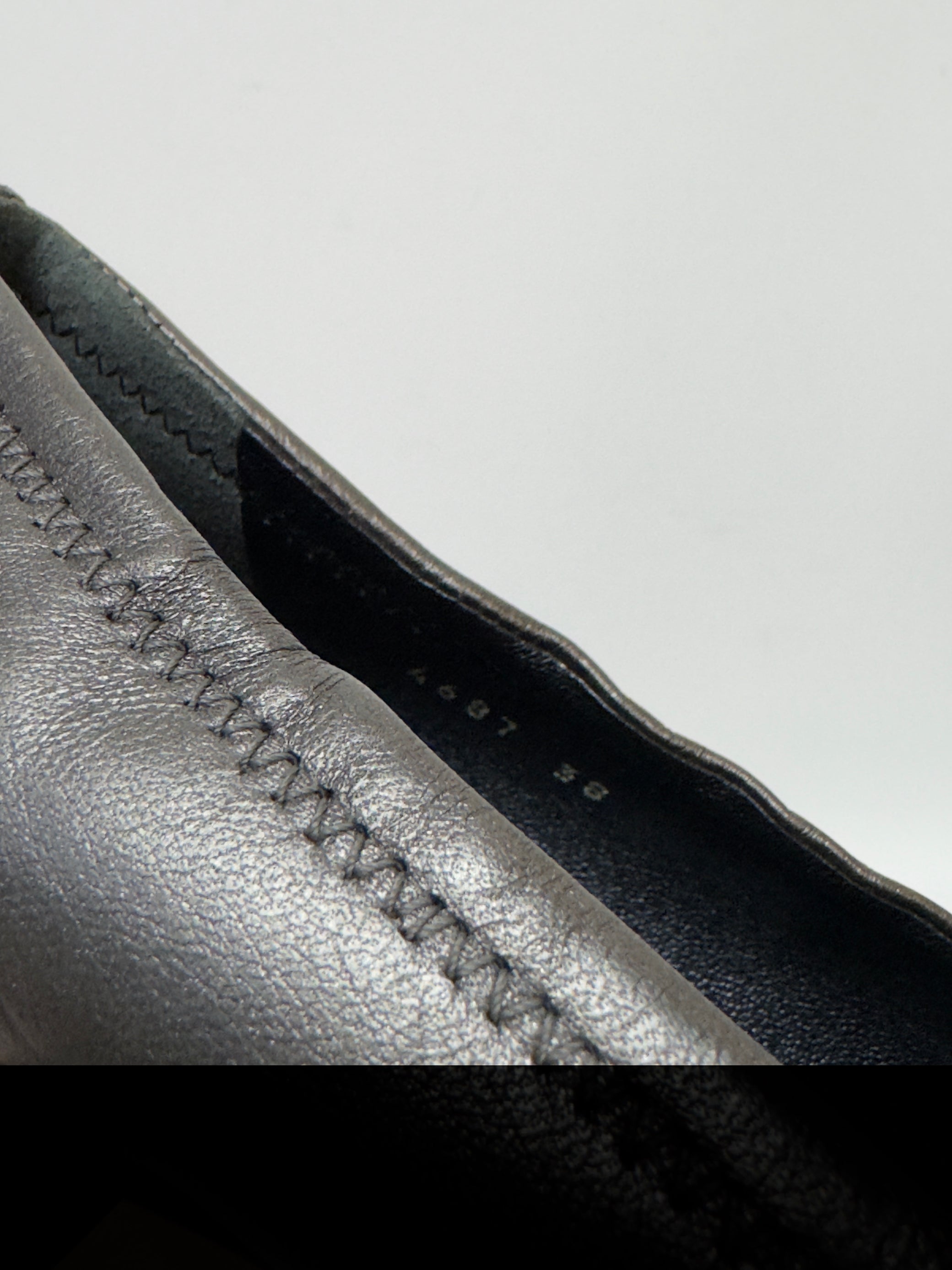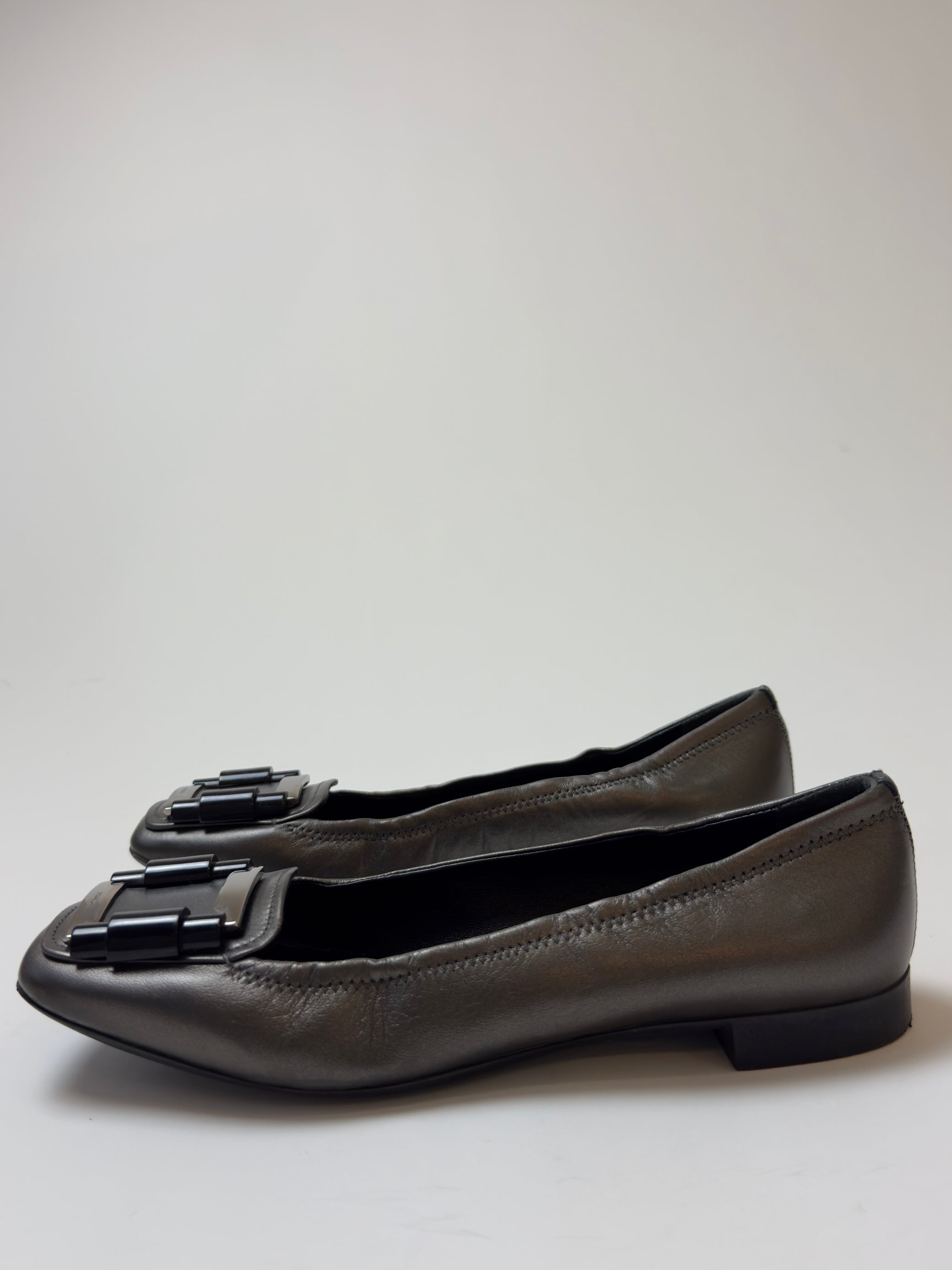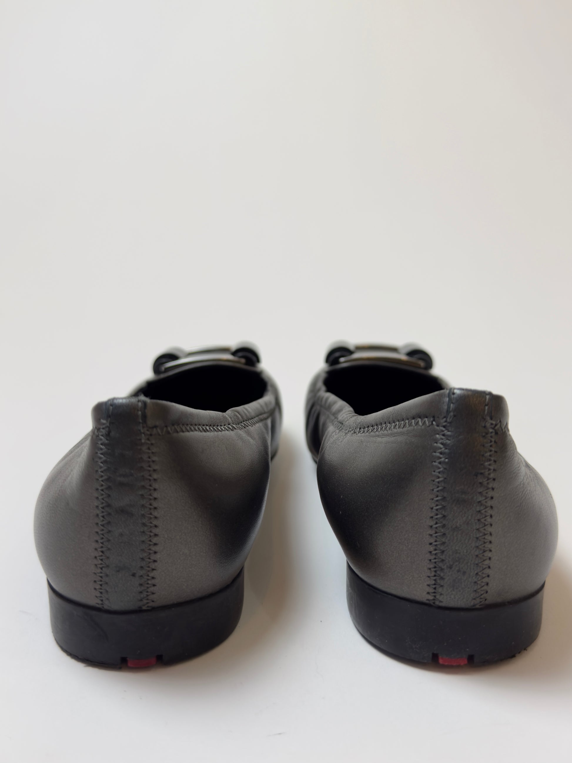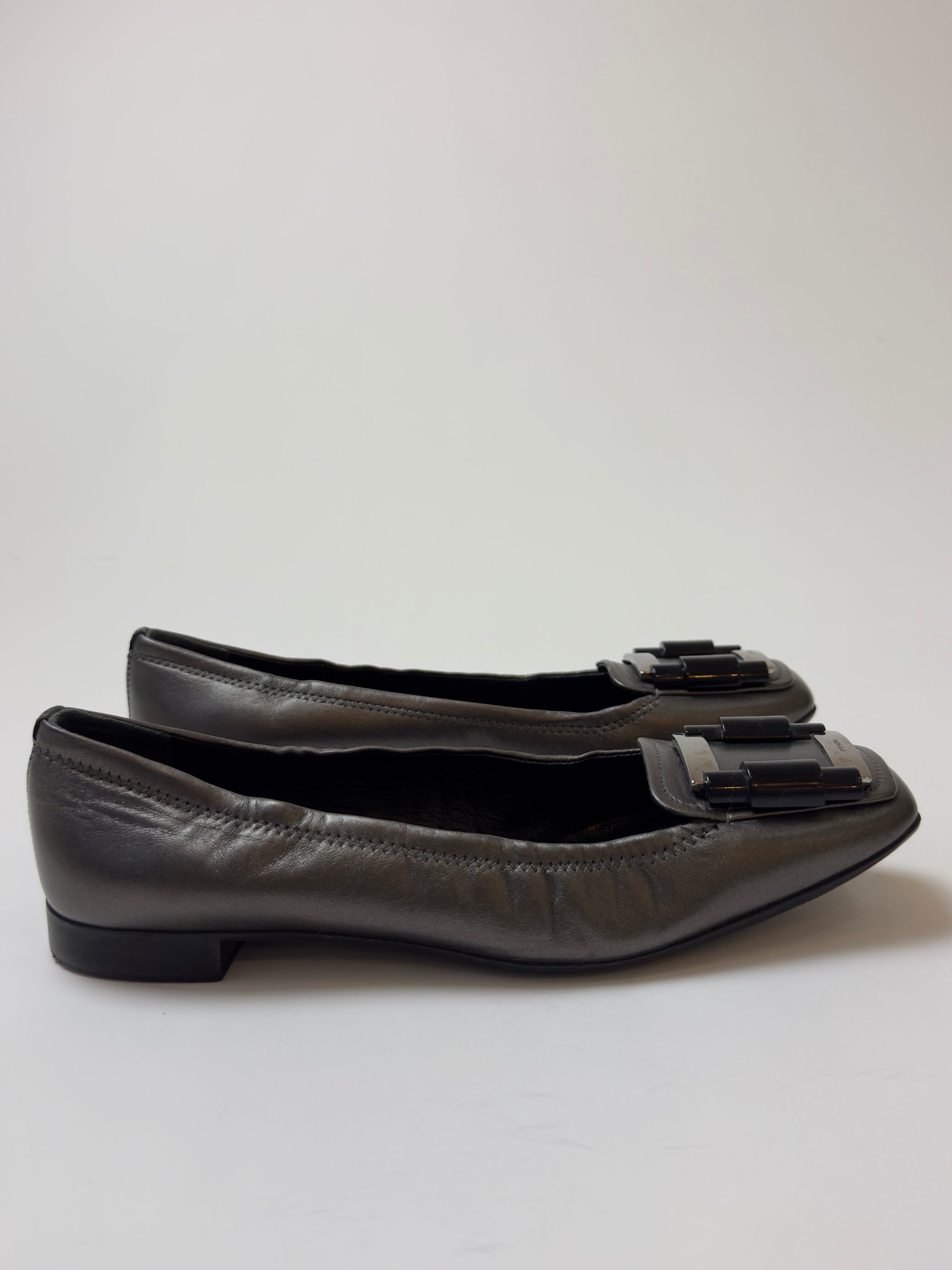 Prada square toe ballerina shoes, featuring logo engraved silver hardware plaque and elastic scrunch back.