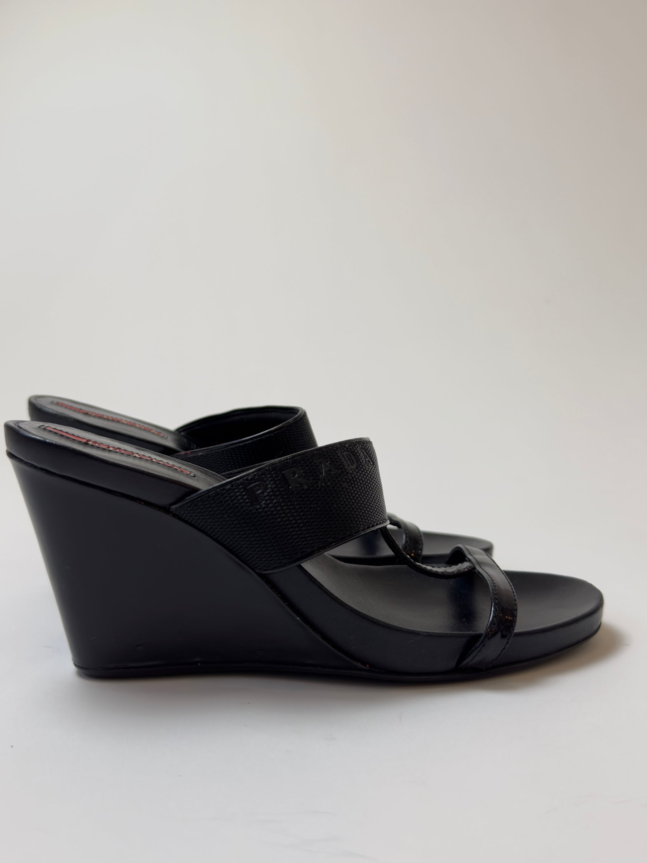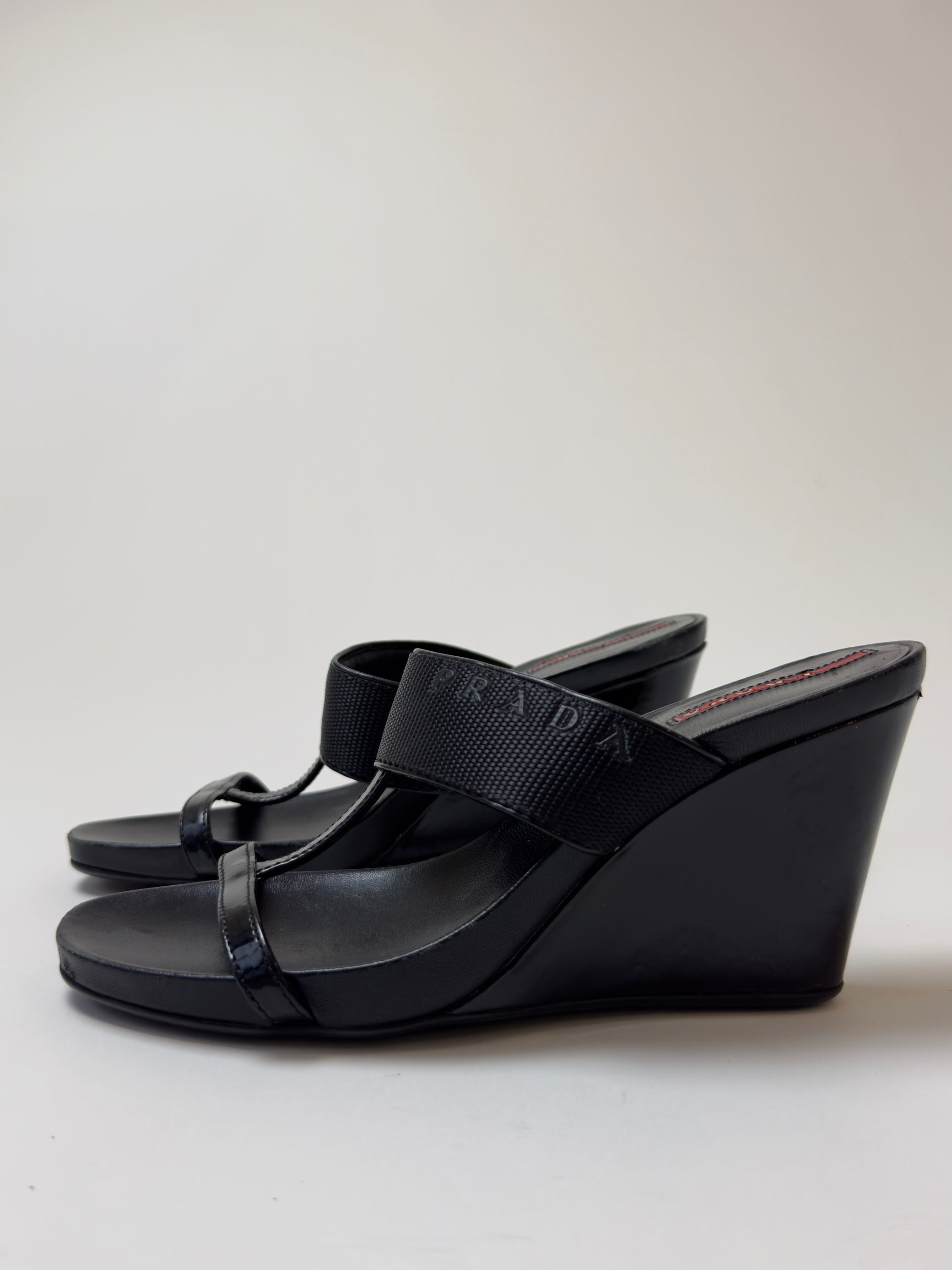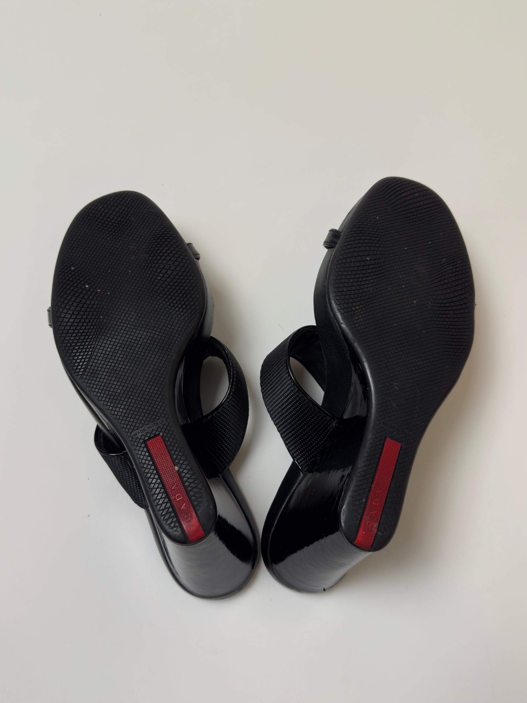 90s Prada Linea Rossa wedge sandals, featuring Prada logo on nylon strap. Top strap has extra hidden padding for extra comfort.