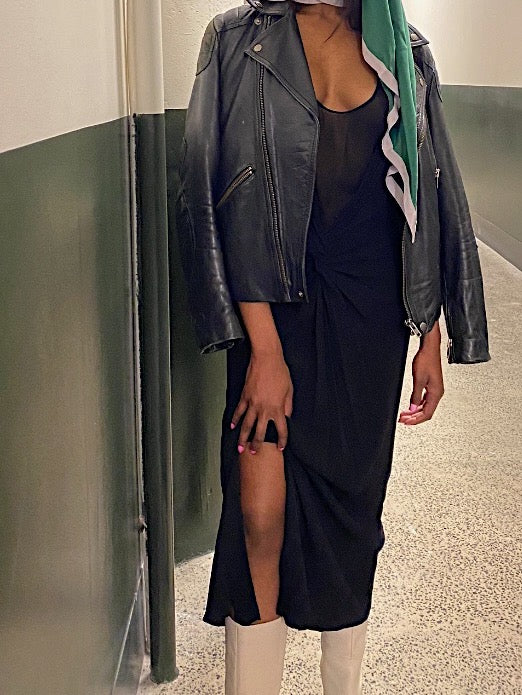+ Full lining, bottom slit with front pleated ruching and see thru chest detail.