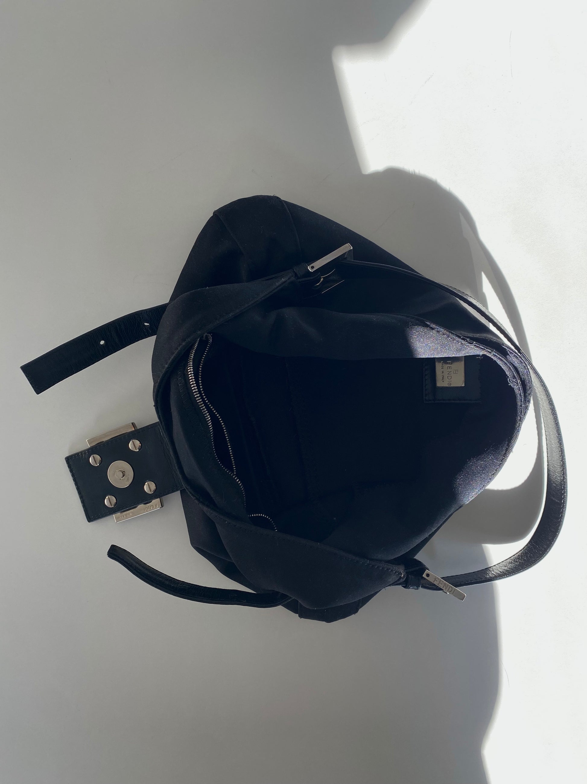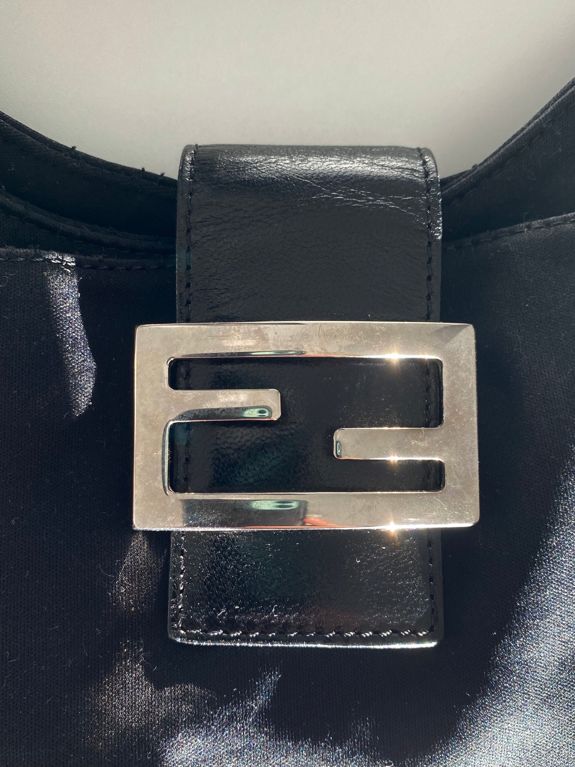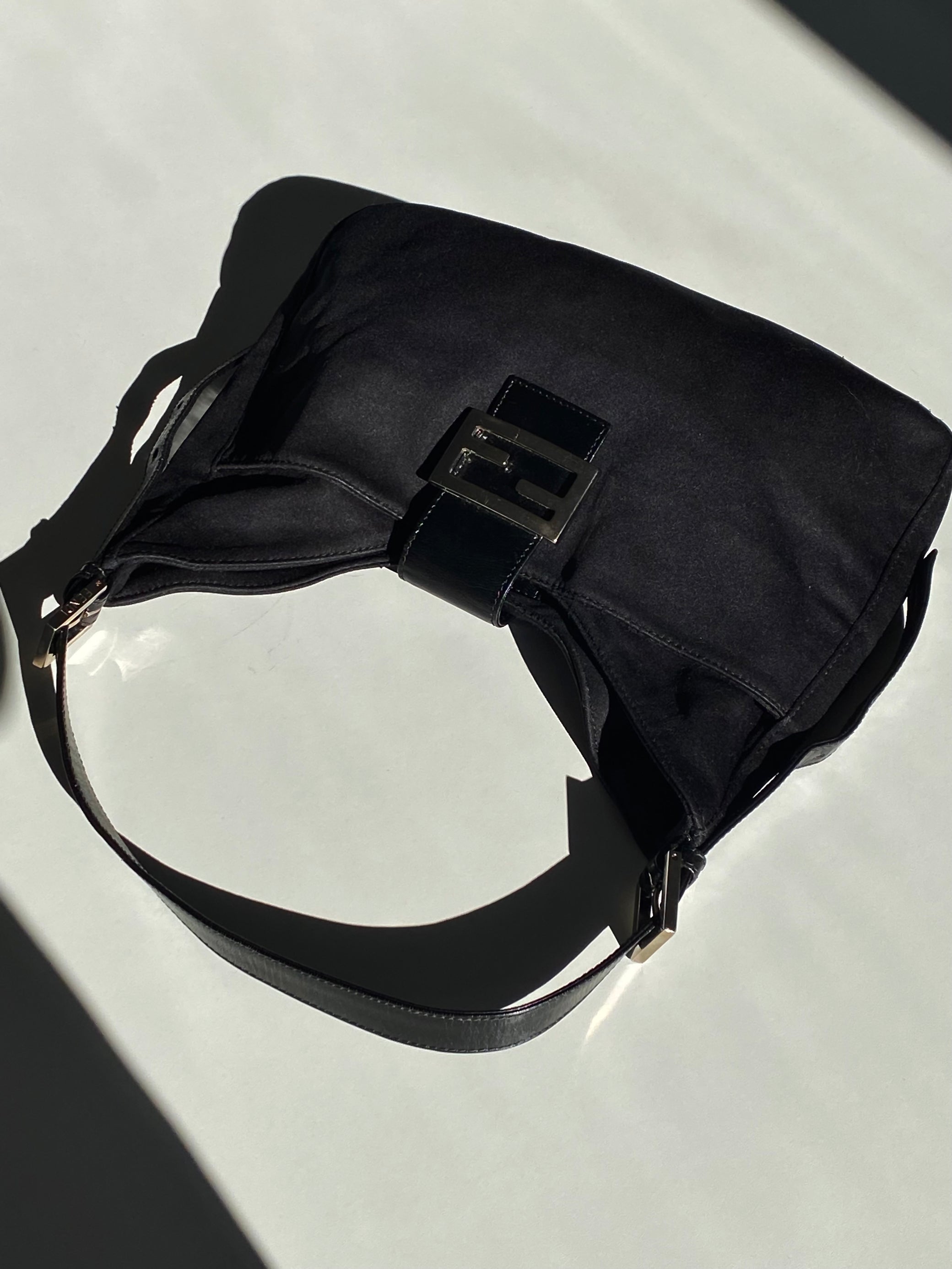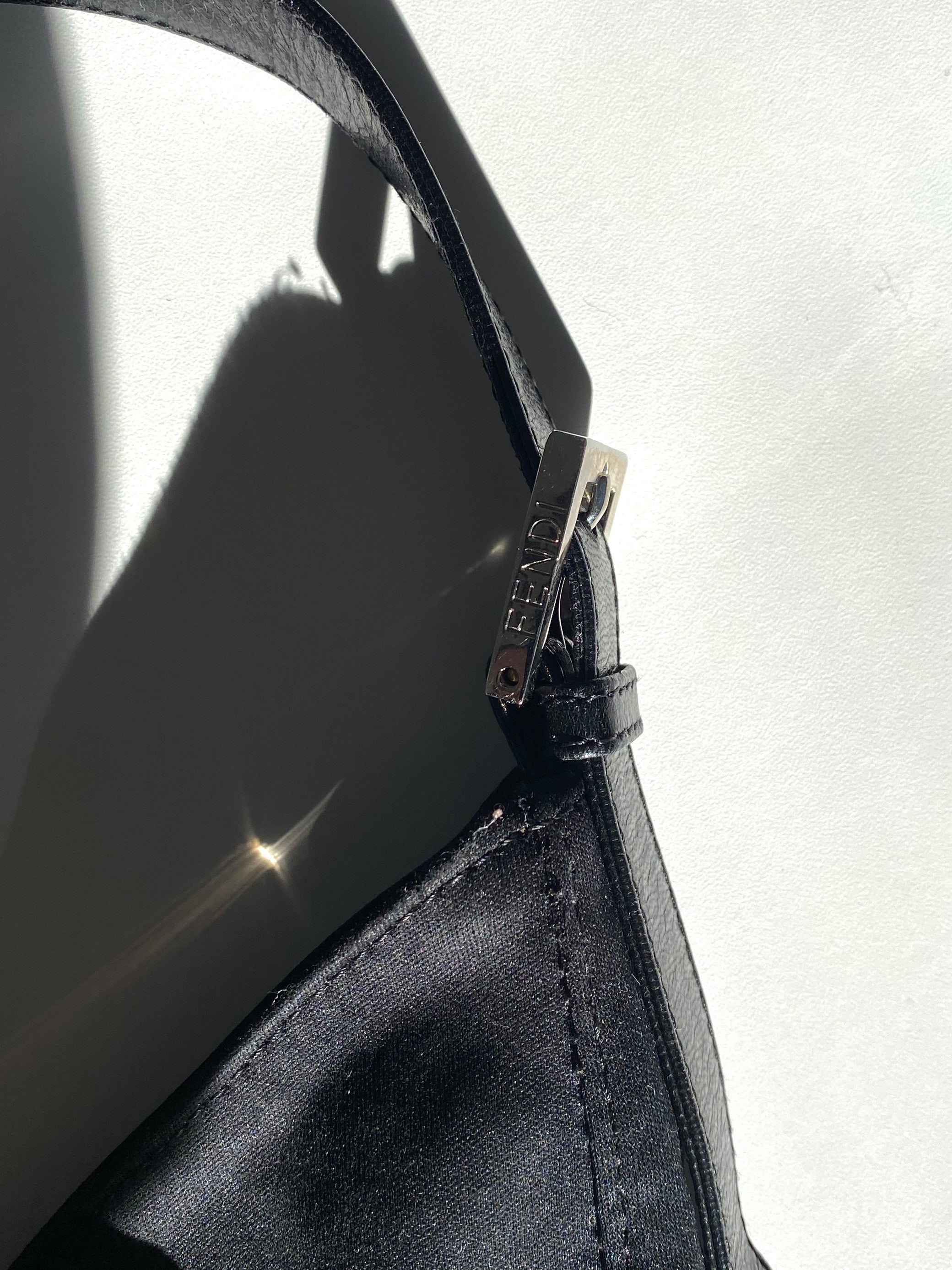 + Iconic Mamma Baguette in smooth cotton material with a light sheen. Silver-tone hardware, leather shoulder strap and interior zip pocket.