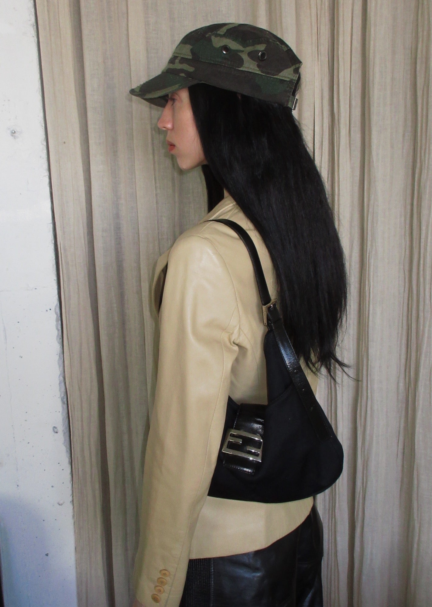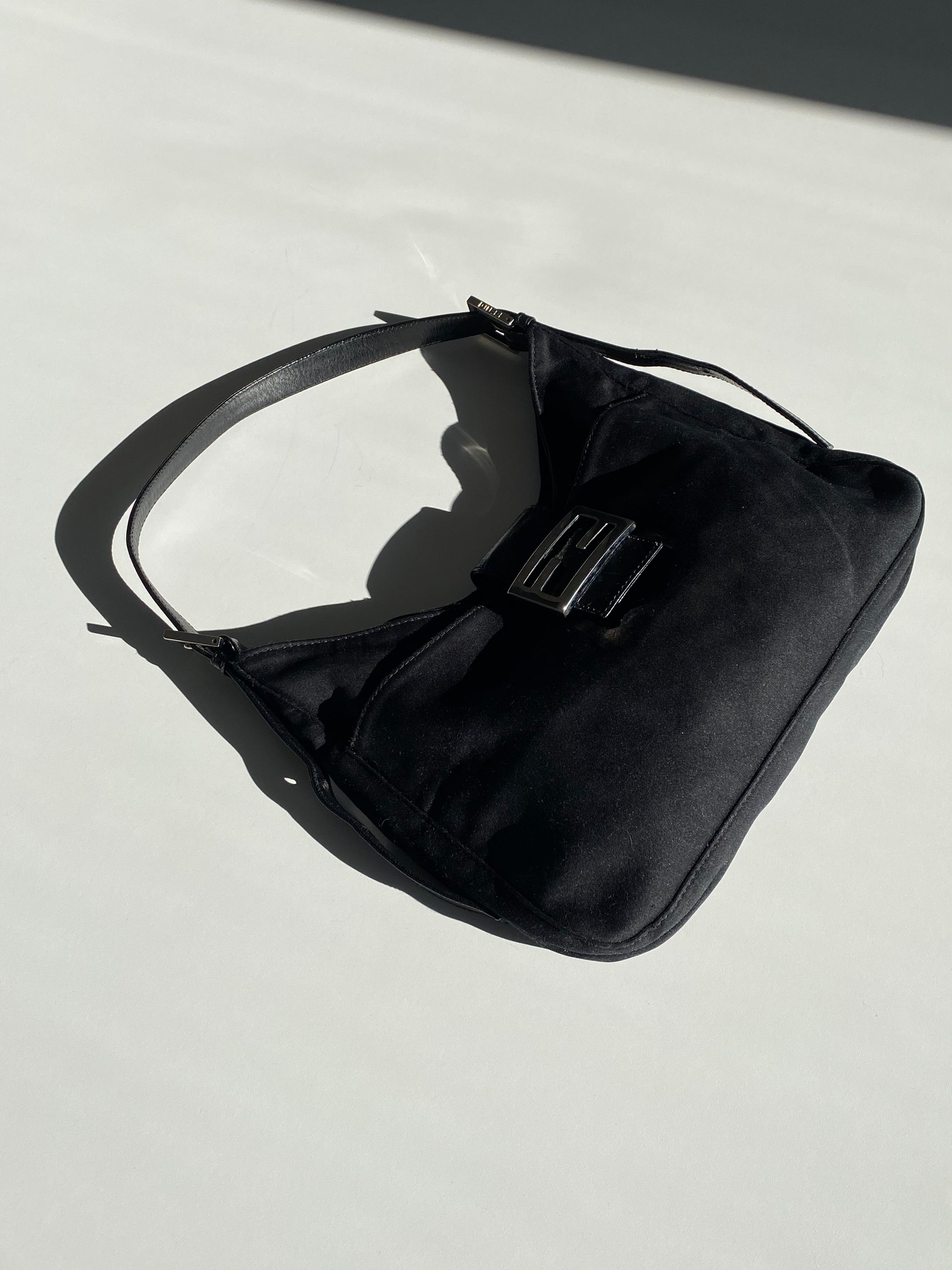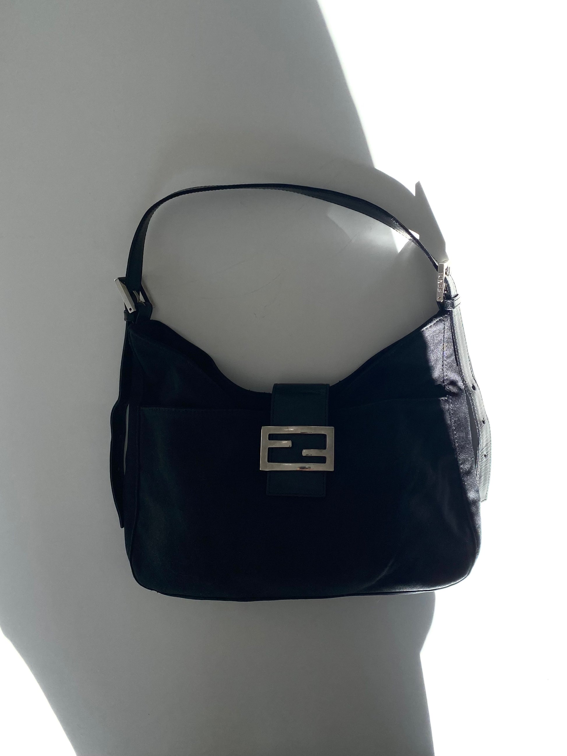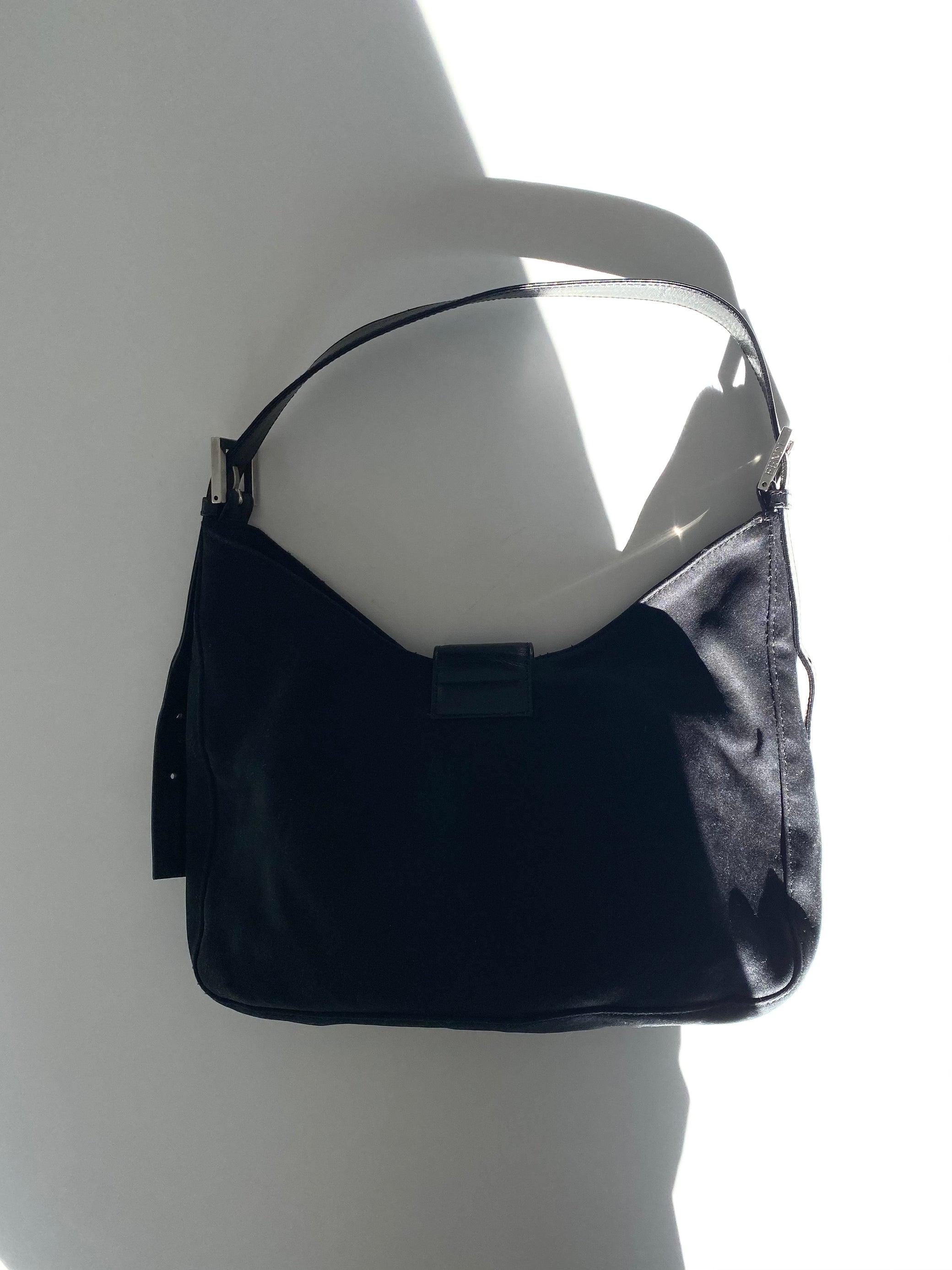 + Iconic Mamma Baguette in smooth cotton material with a light sheen. Silver-tone hardware, leather shoulder strap and interior zip pocket.