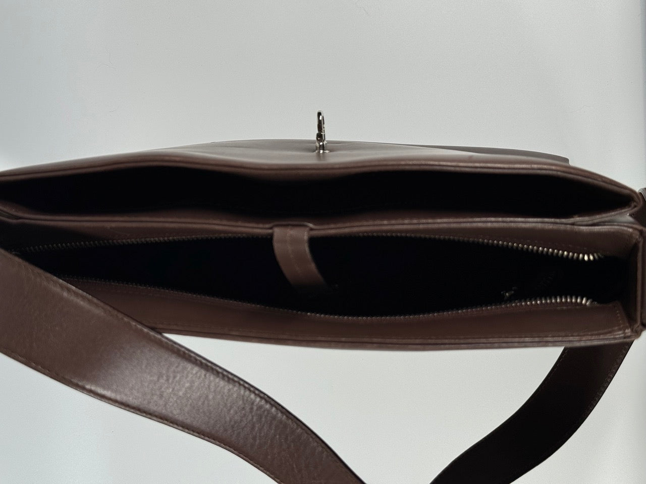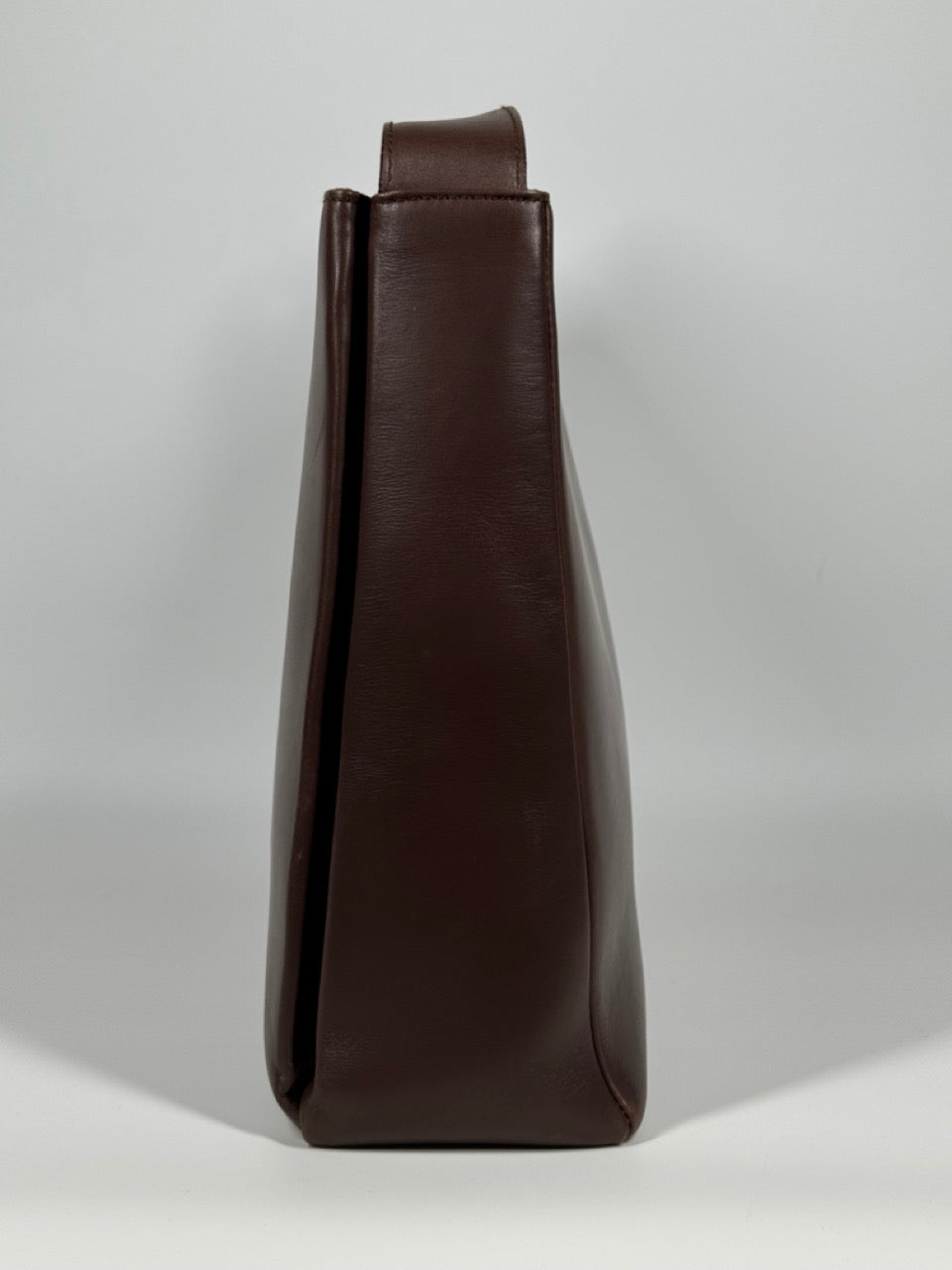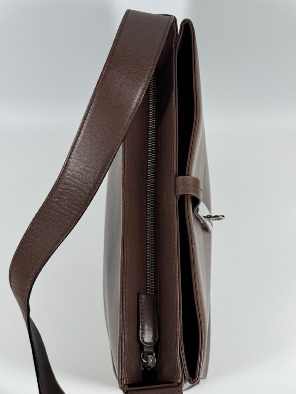 Dark brown smooth leather with a sleek, structured silhouette. Features a silver-tone Gancini logo clasp detail on the front. Single shoulder strap. Timeless design suitable for both formal and casual occasions.
