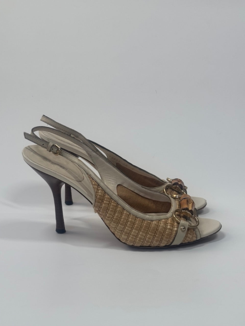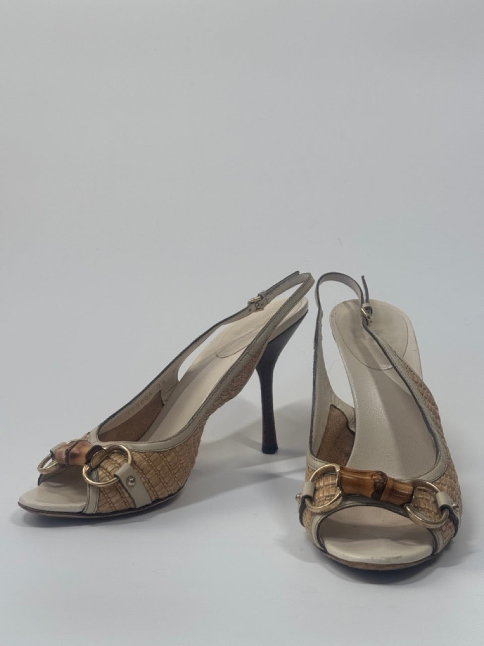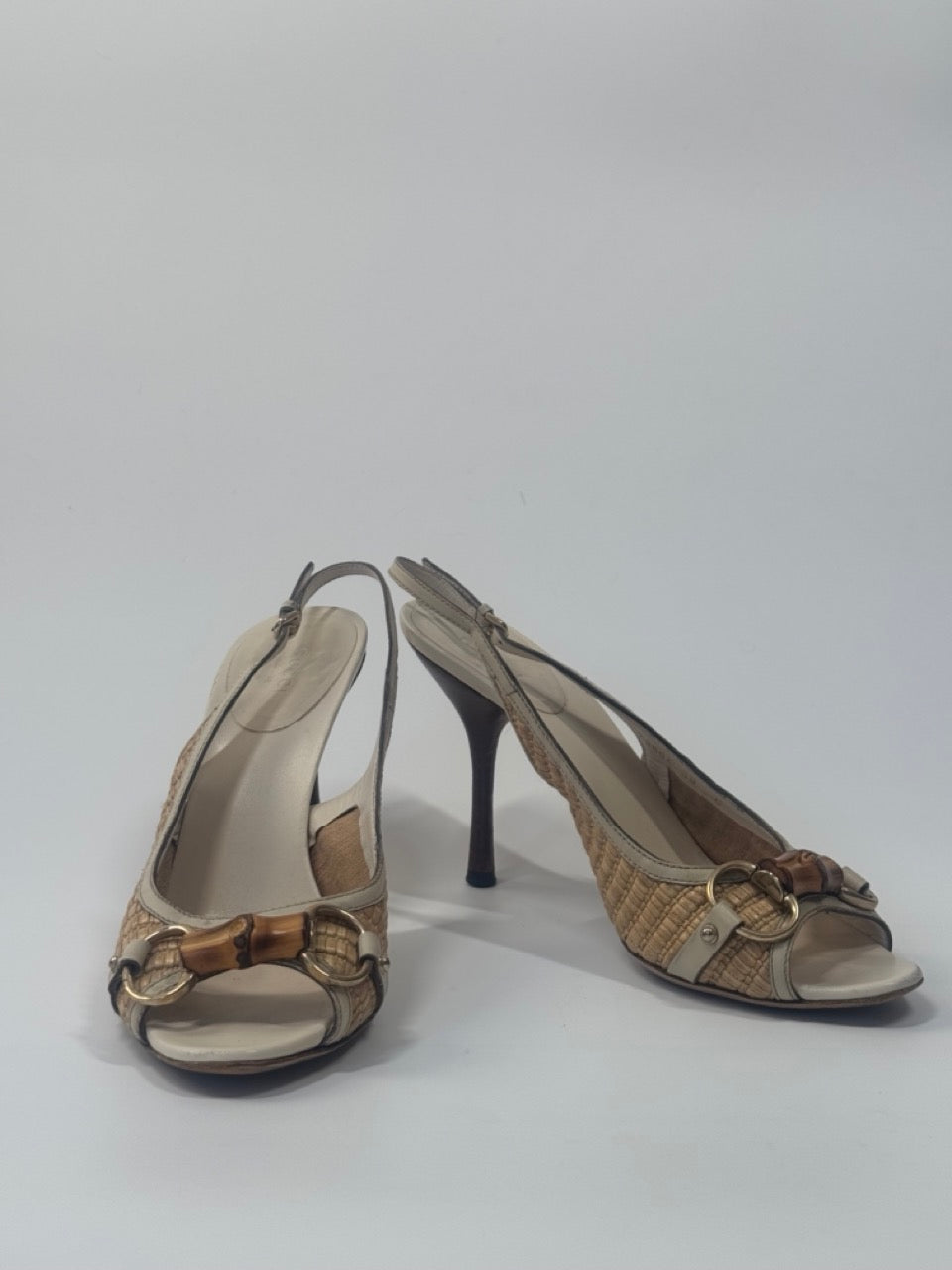 Gucci open-toe slingback heels in beige raffia and cream leather, featuring signature bamboo horsebit detail at the vamp and tapered stiletto heels.