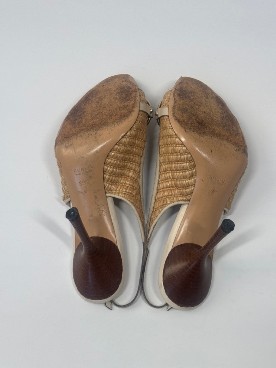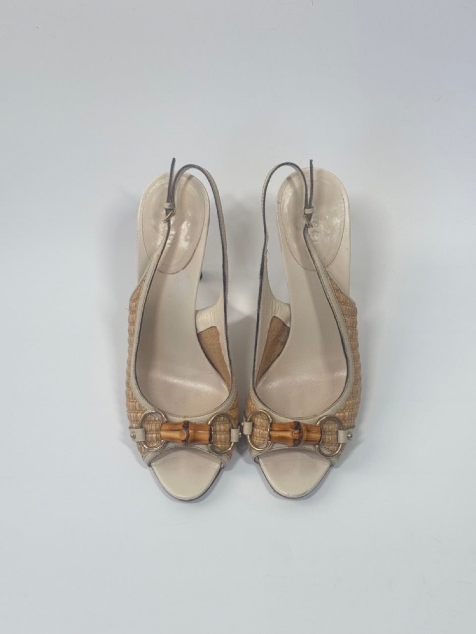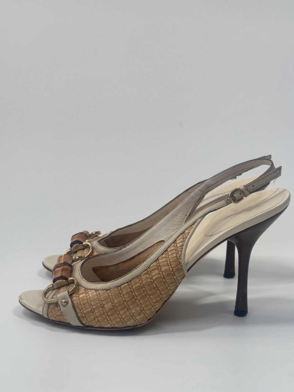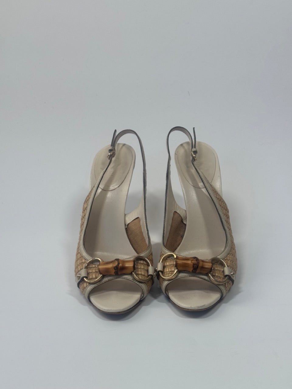 Gucci open-toe slingback heels in beige raffia and cream leather, featuring signature bamboo horsebit detail at the vamp and tapered stiletto heels.