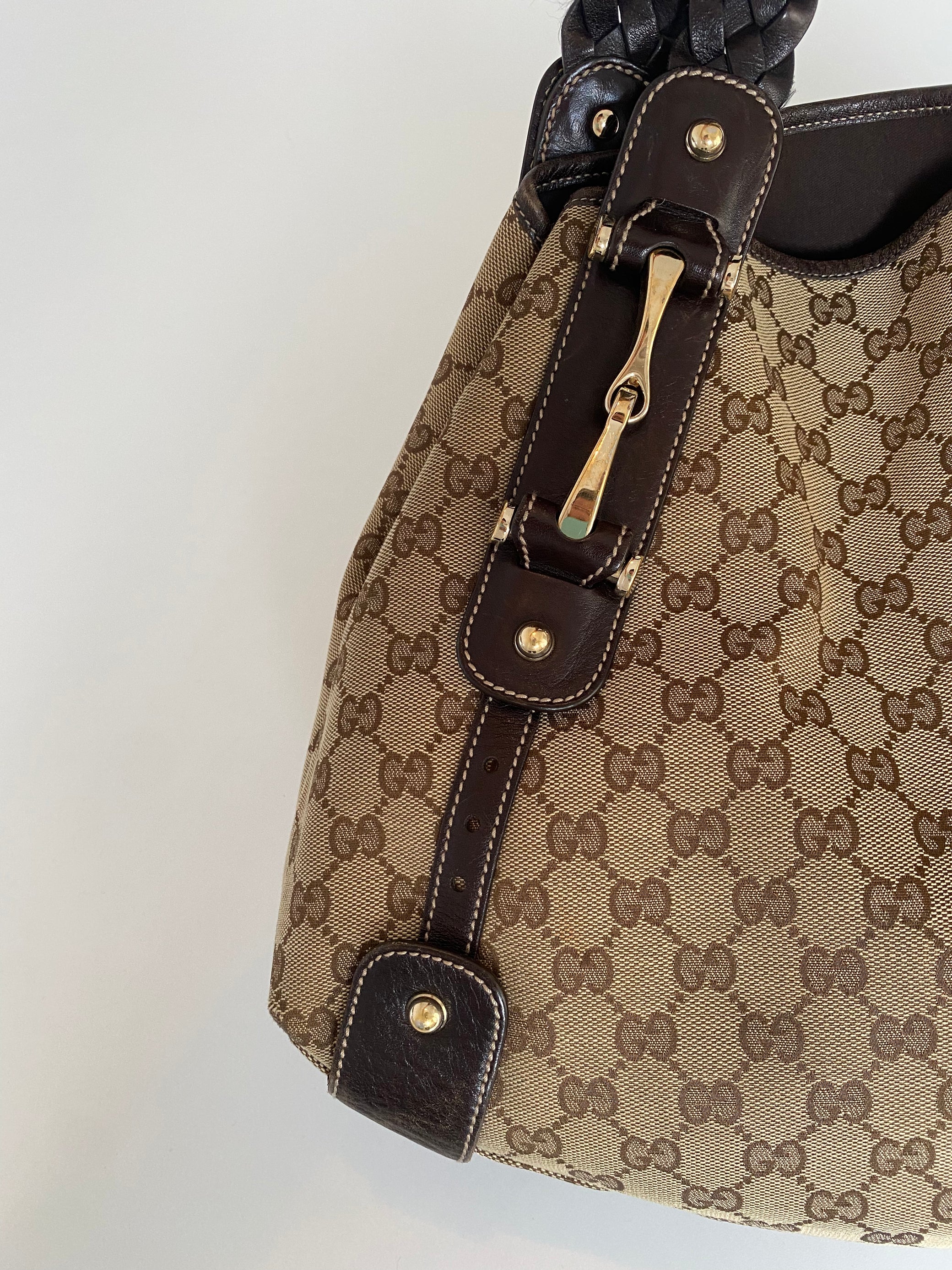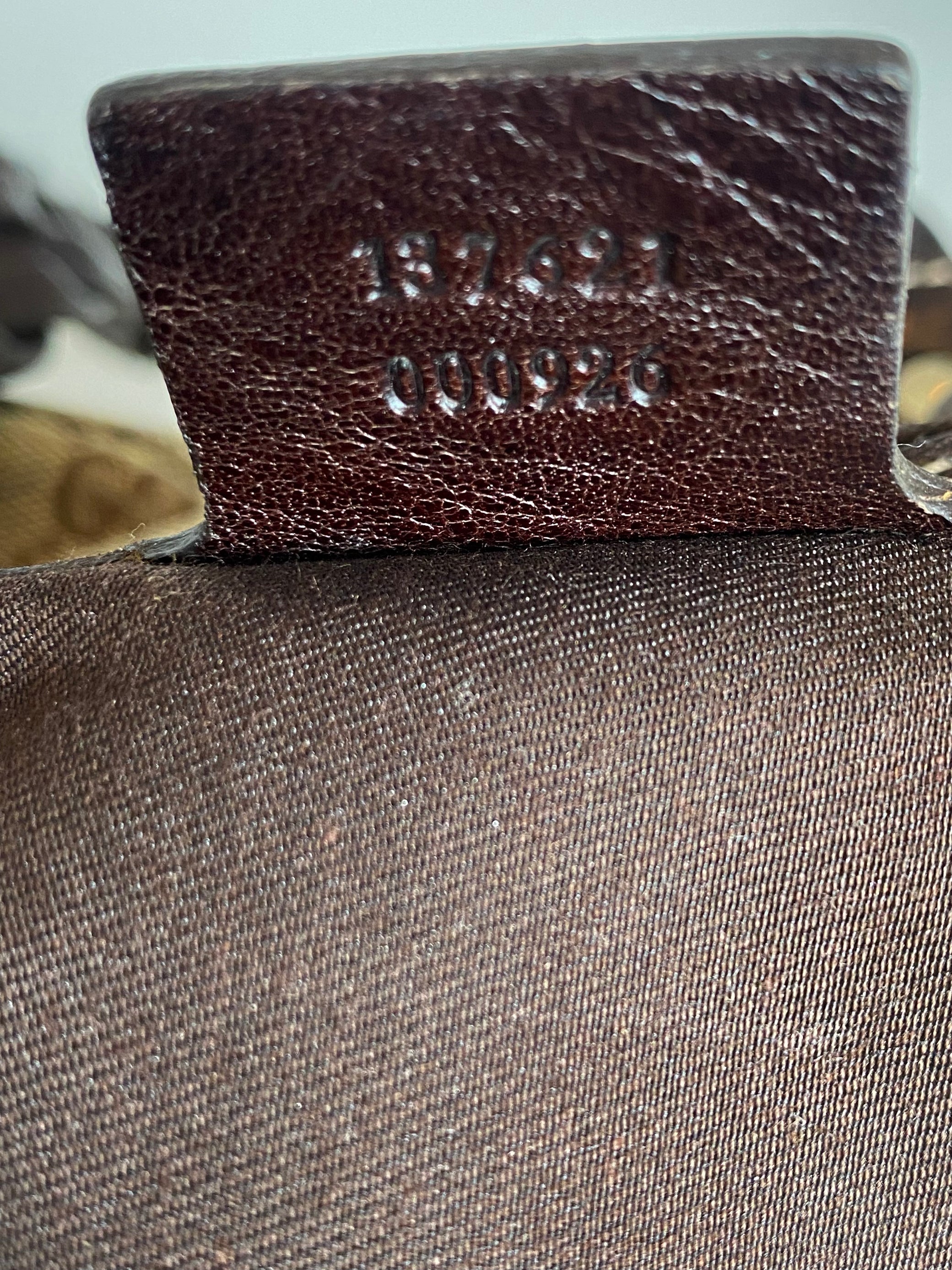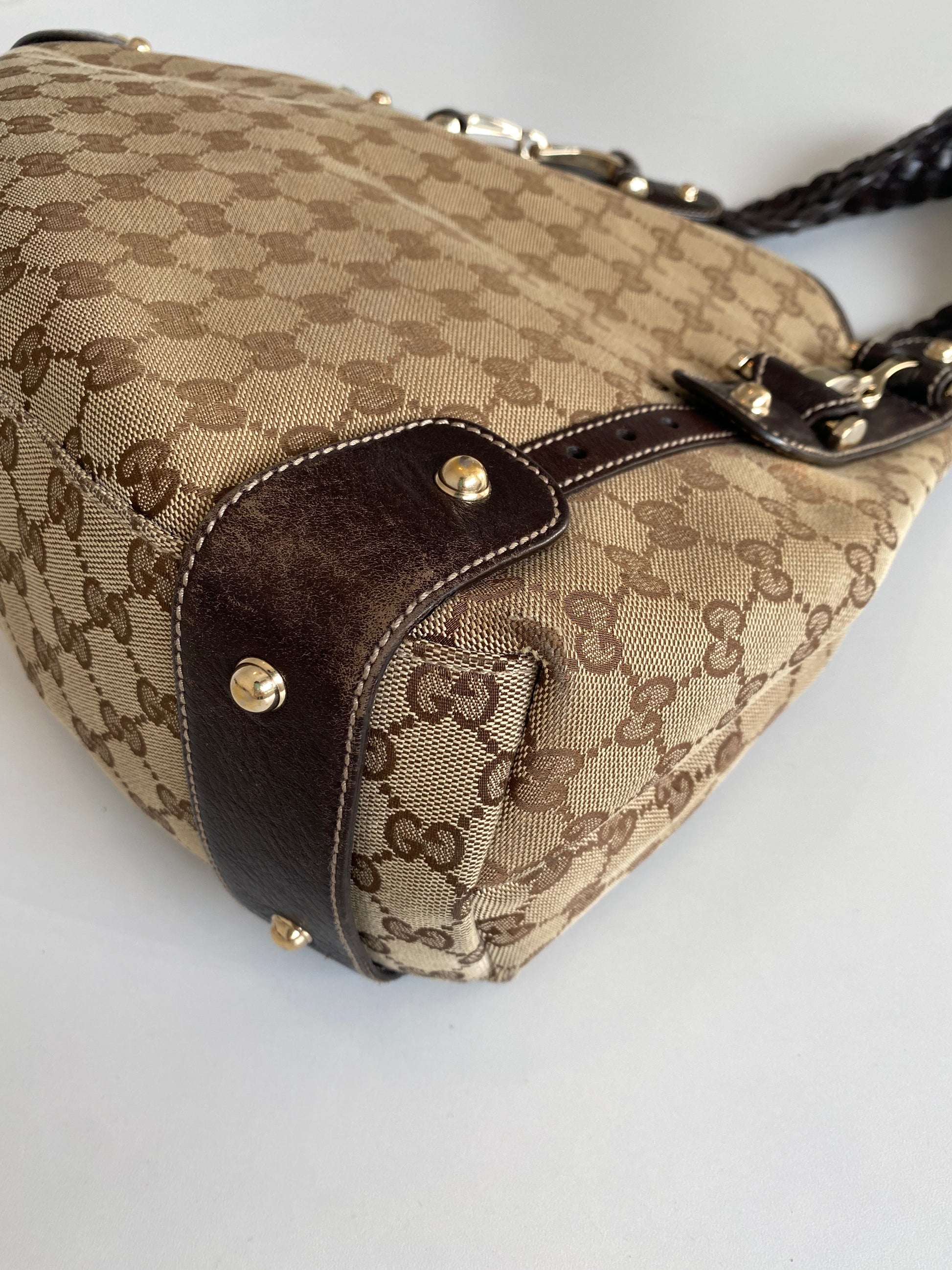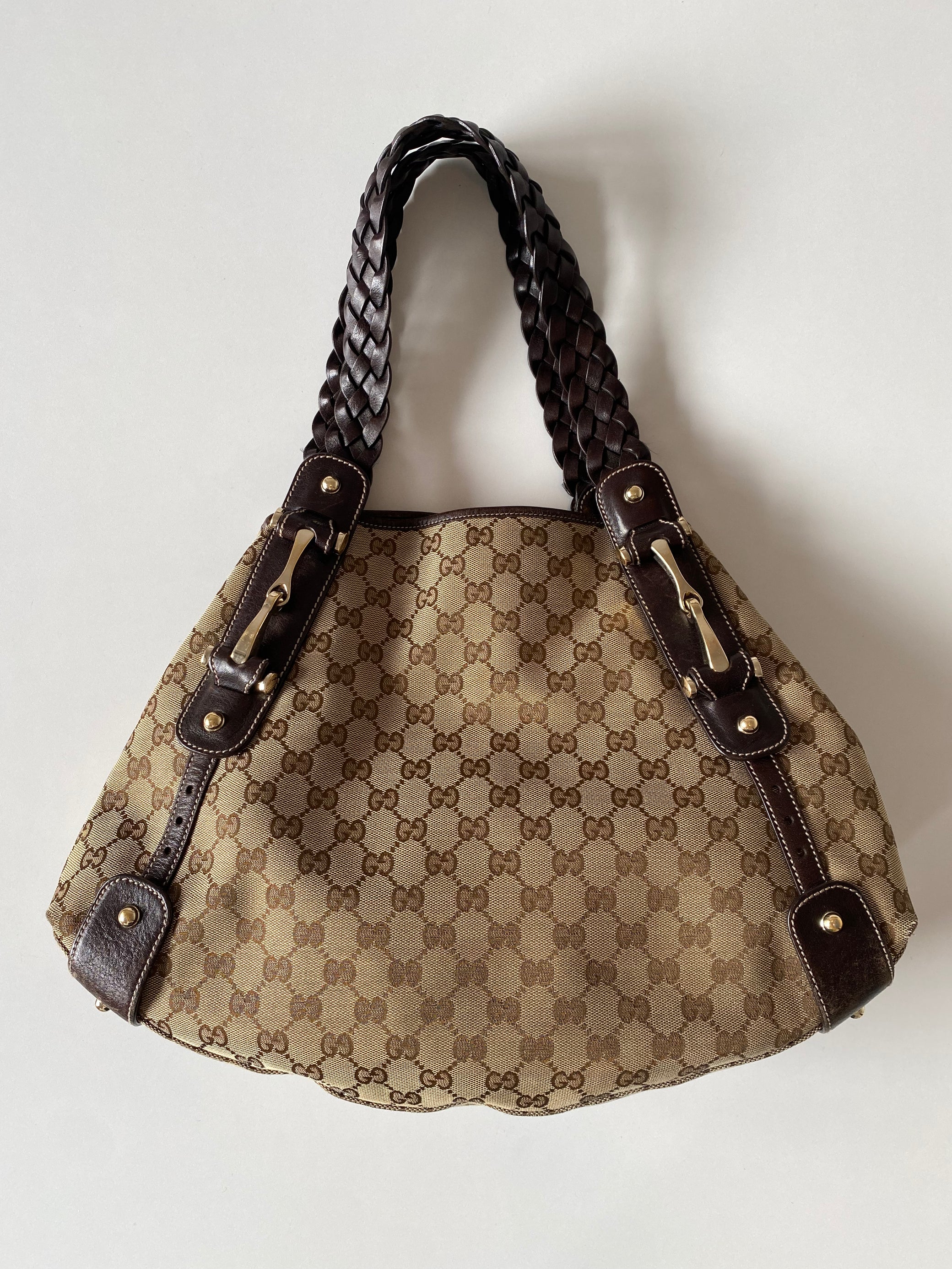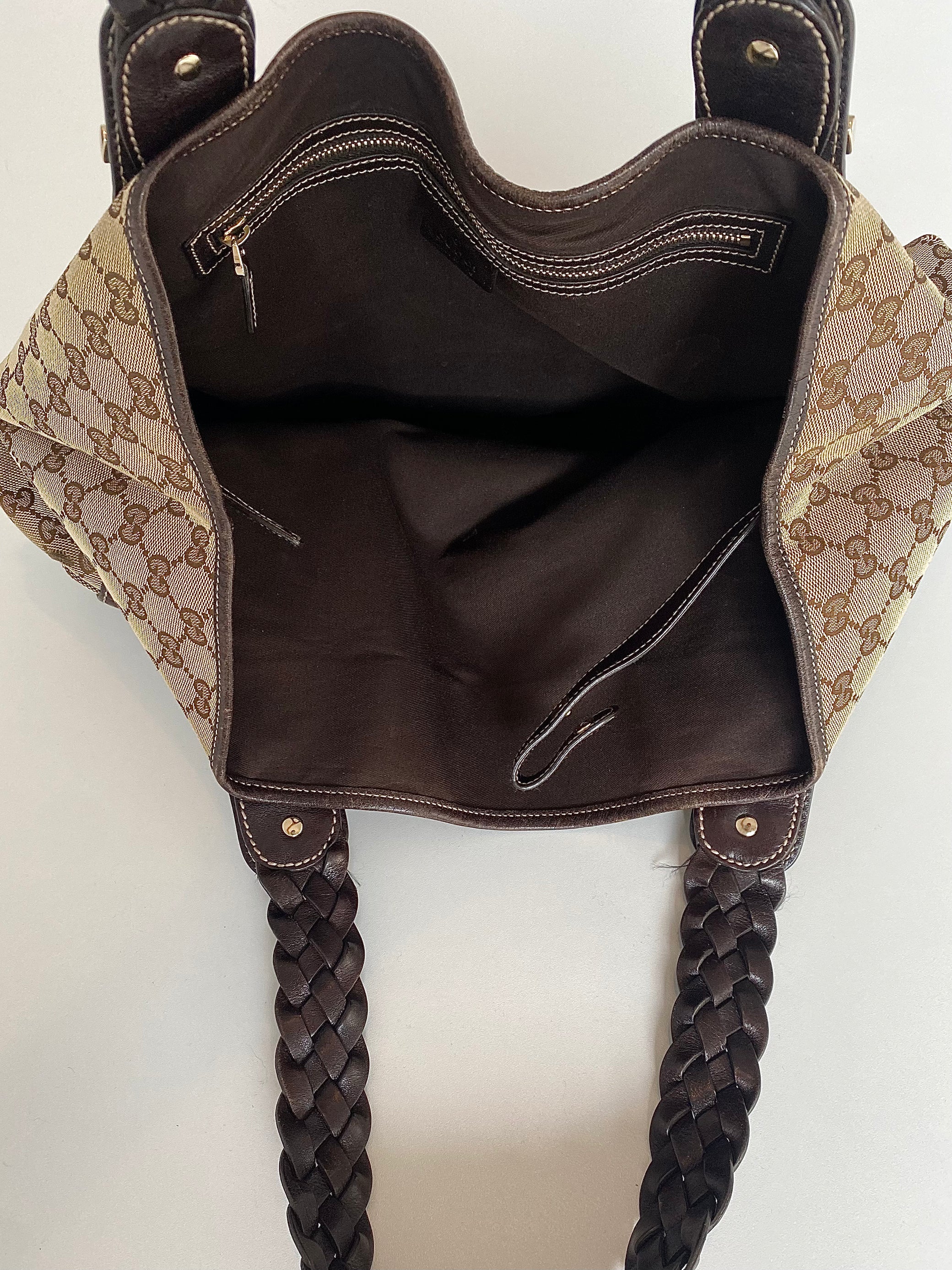 + Featuring GG monogram on canvas, leather braid shoulder straps, gold tone hardware. Gucci dust back included.