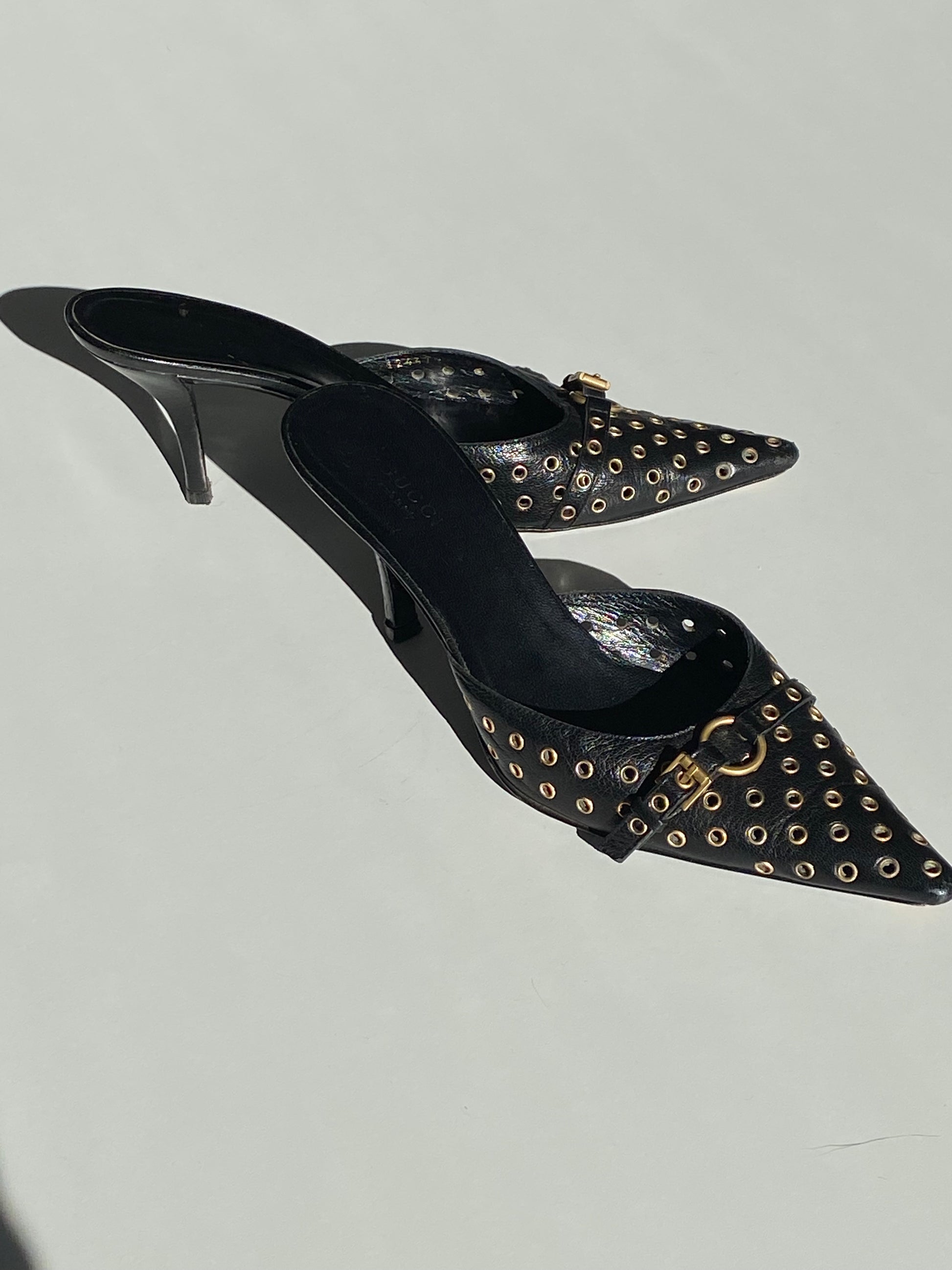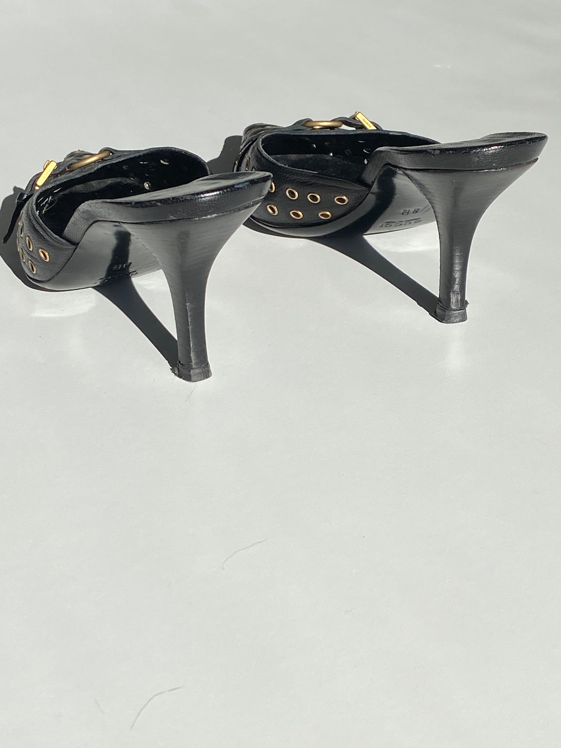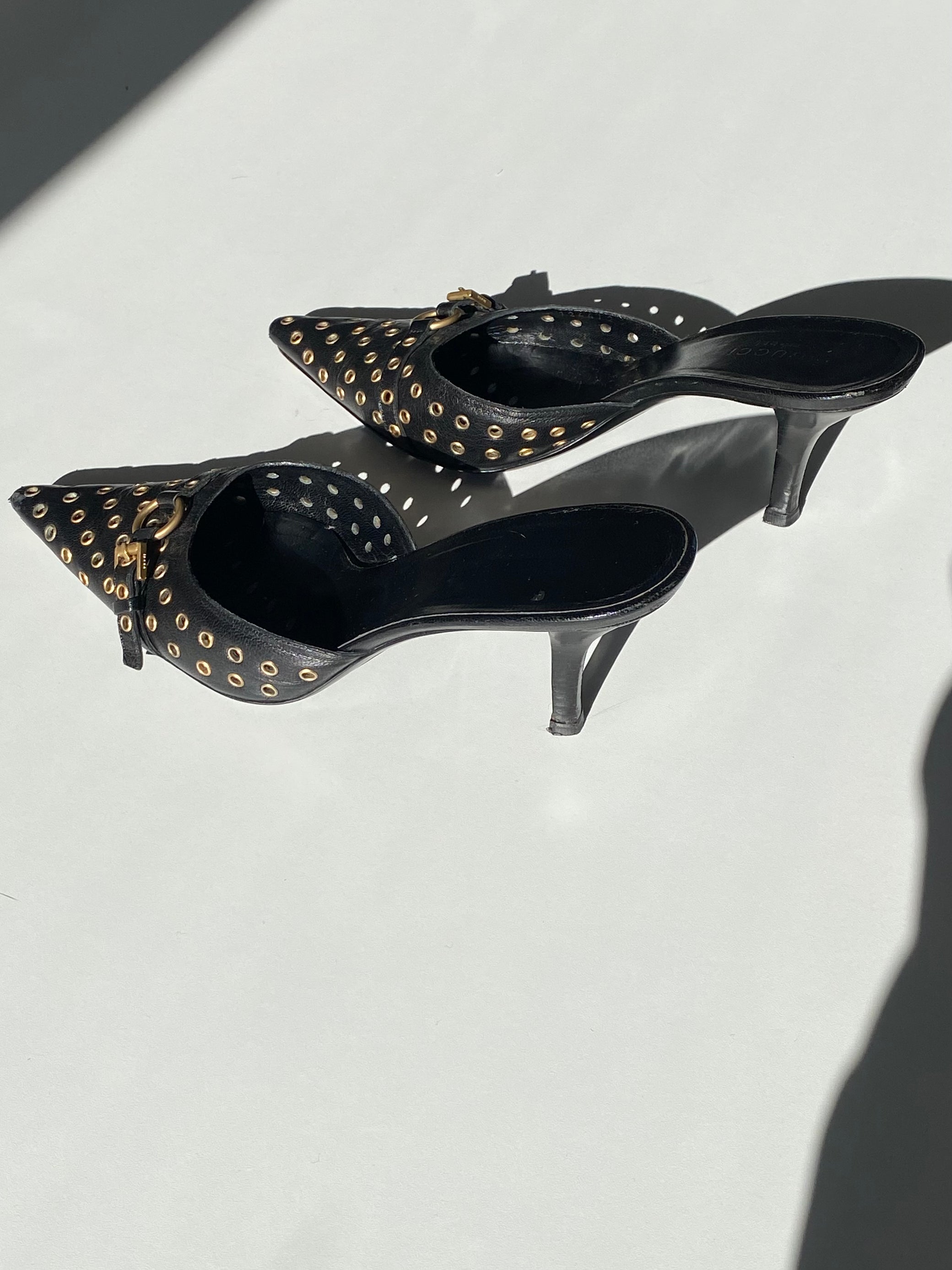 + Vintage 90's era perforated Gucci slip on heels with gold tone hardware in black leather.