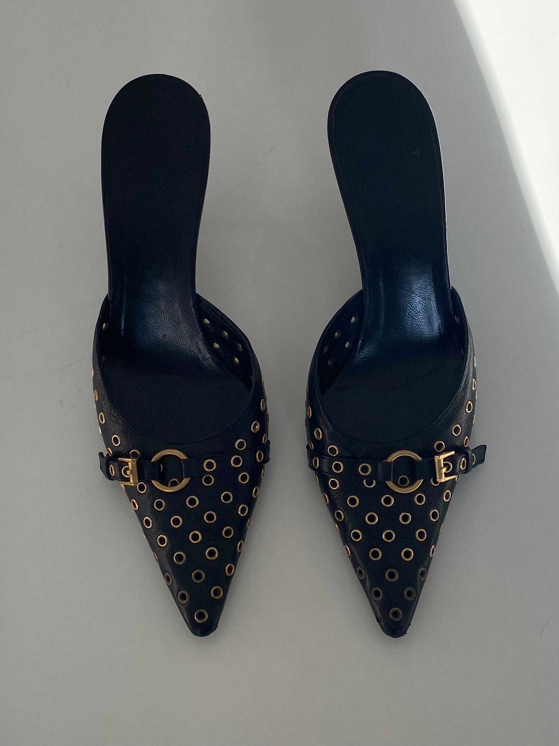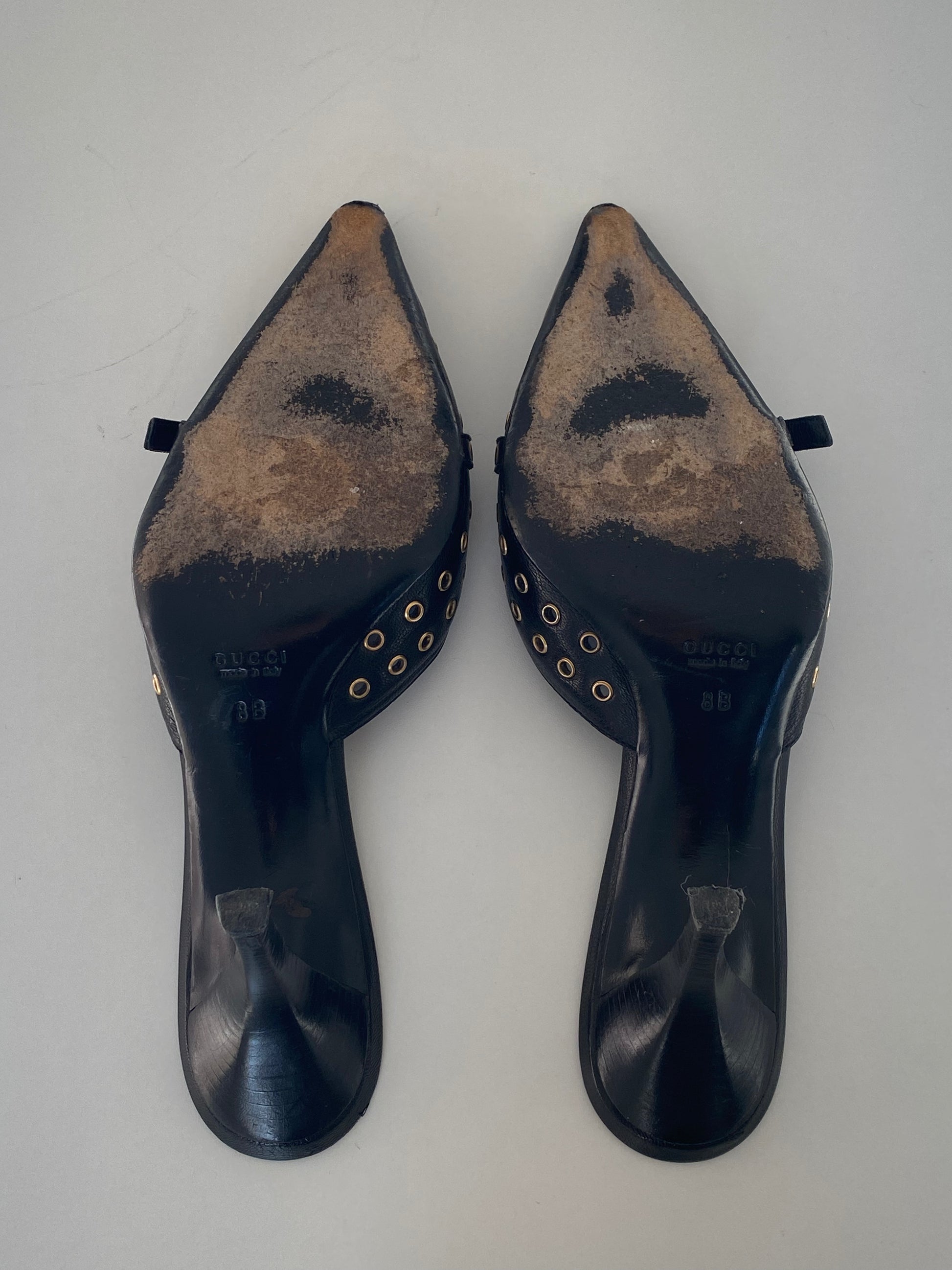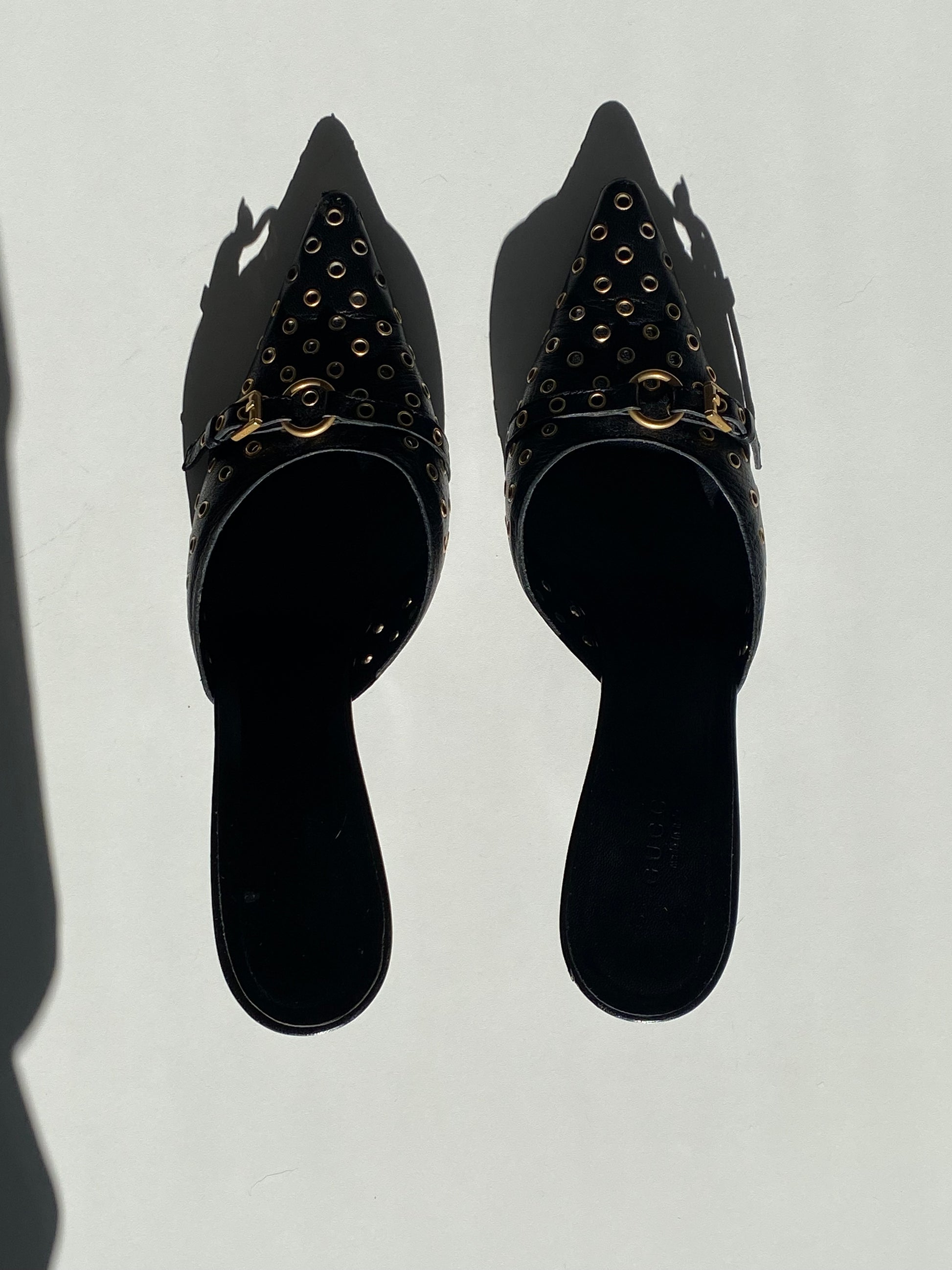 + Vintage 90's era perforated Gucci slip on heels with gold tone hardware in black leather.