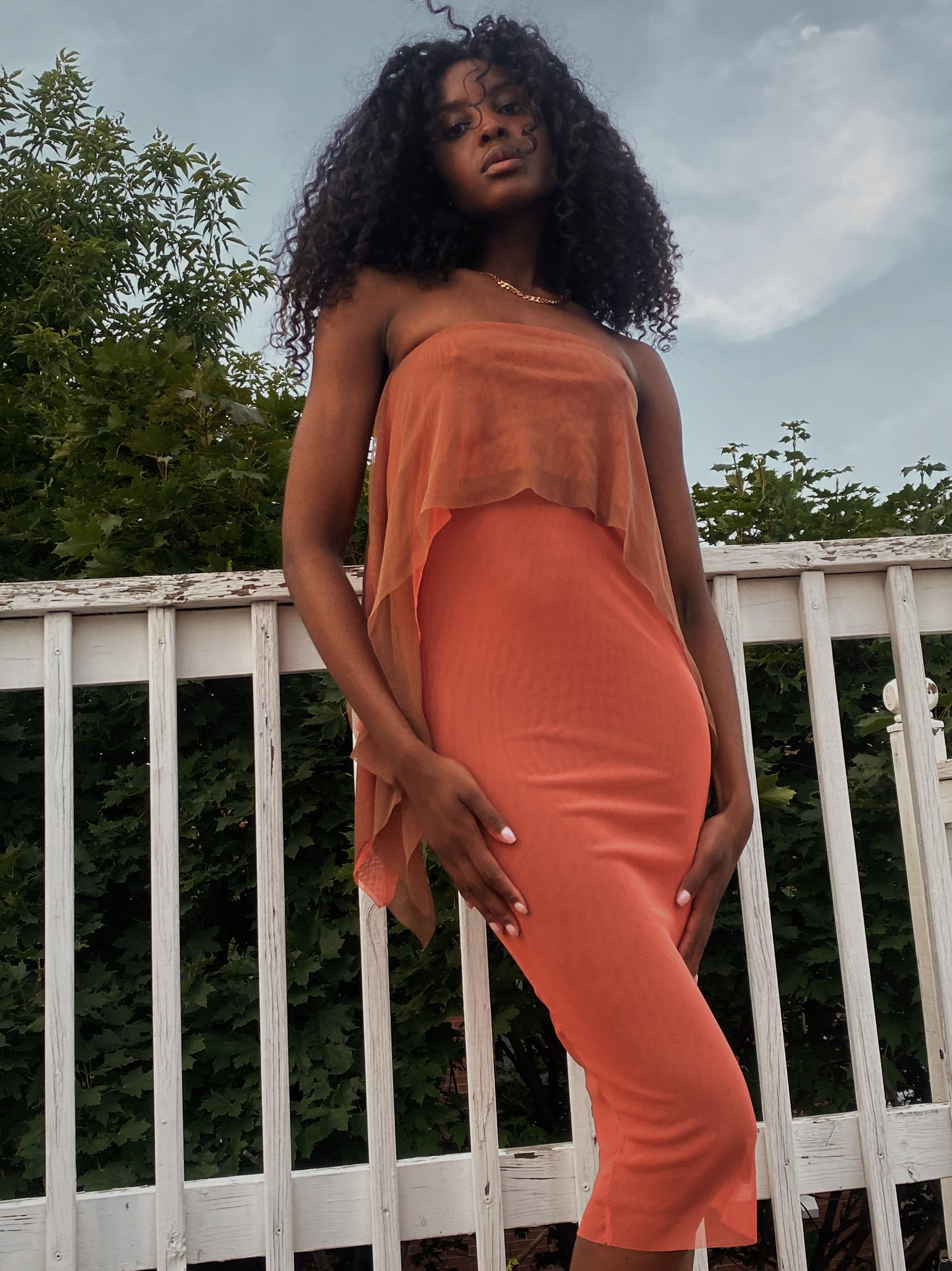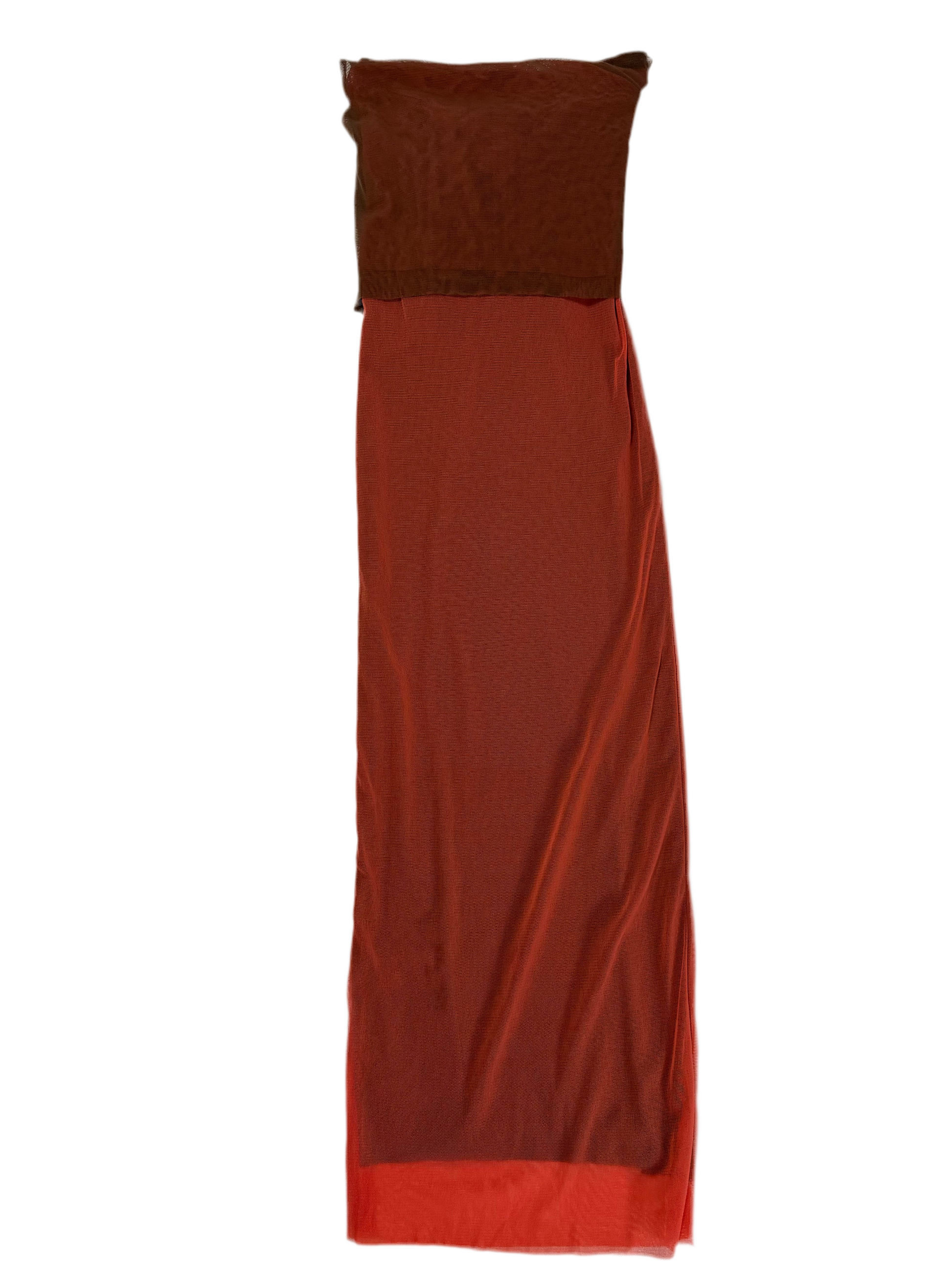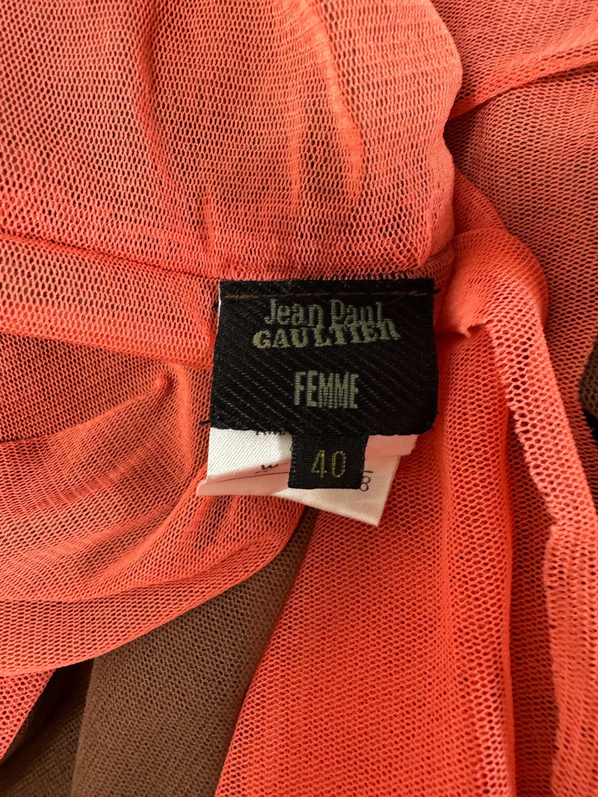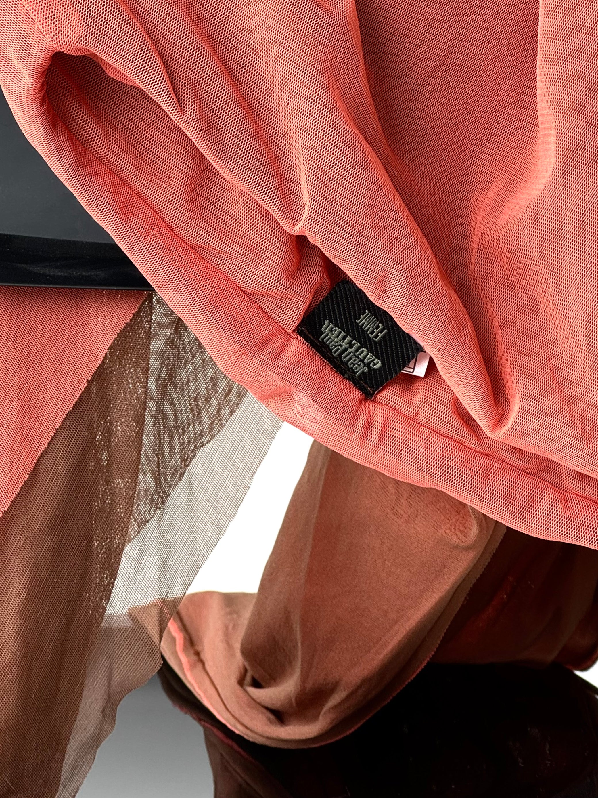 1990s JPG from mesh stretch material featuring draping at chest. Can be tied or left untied. Option to also wear this dress as a long skirt.