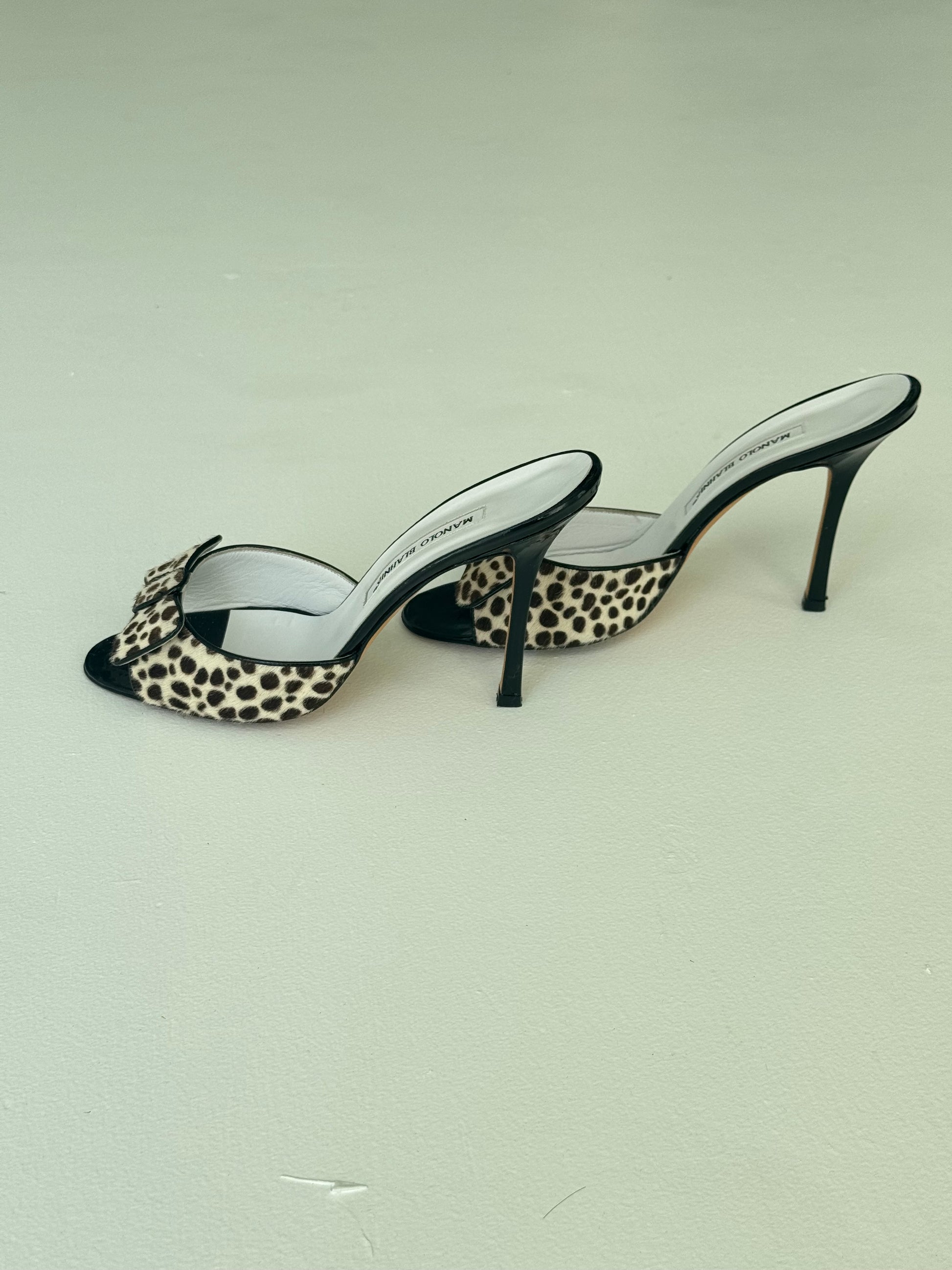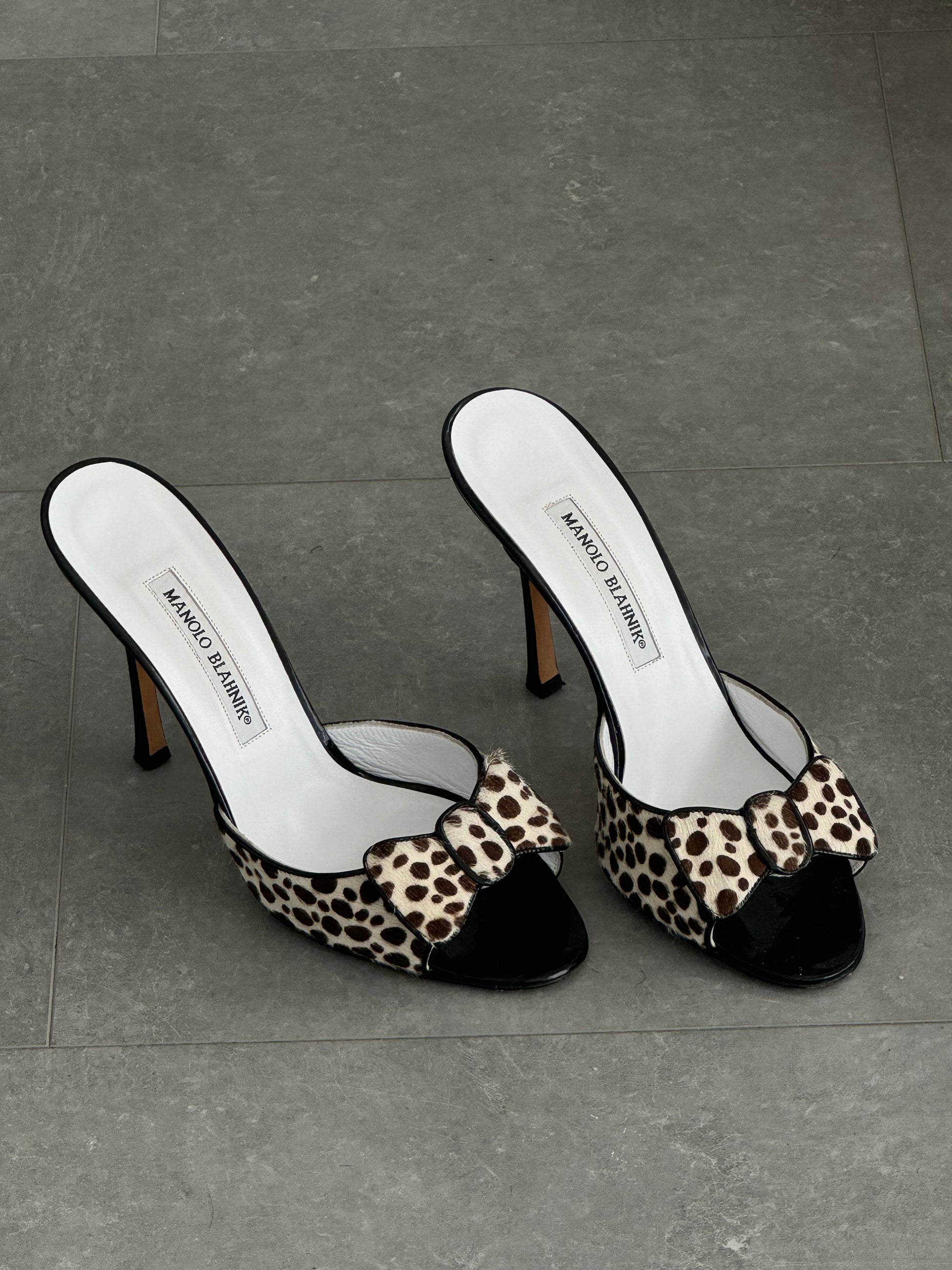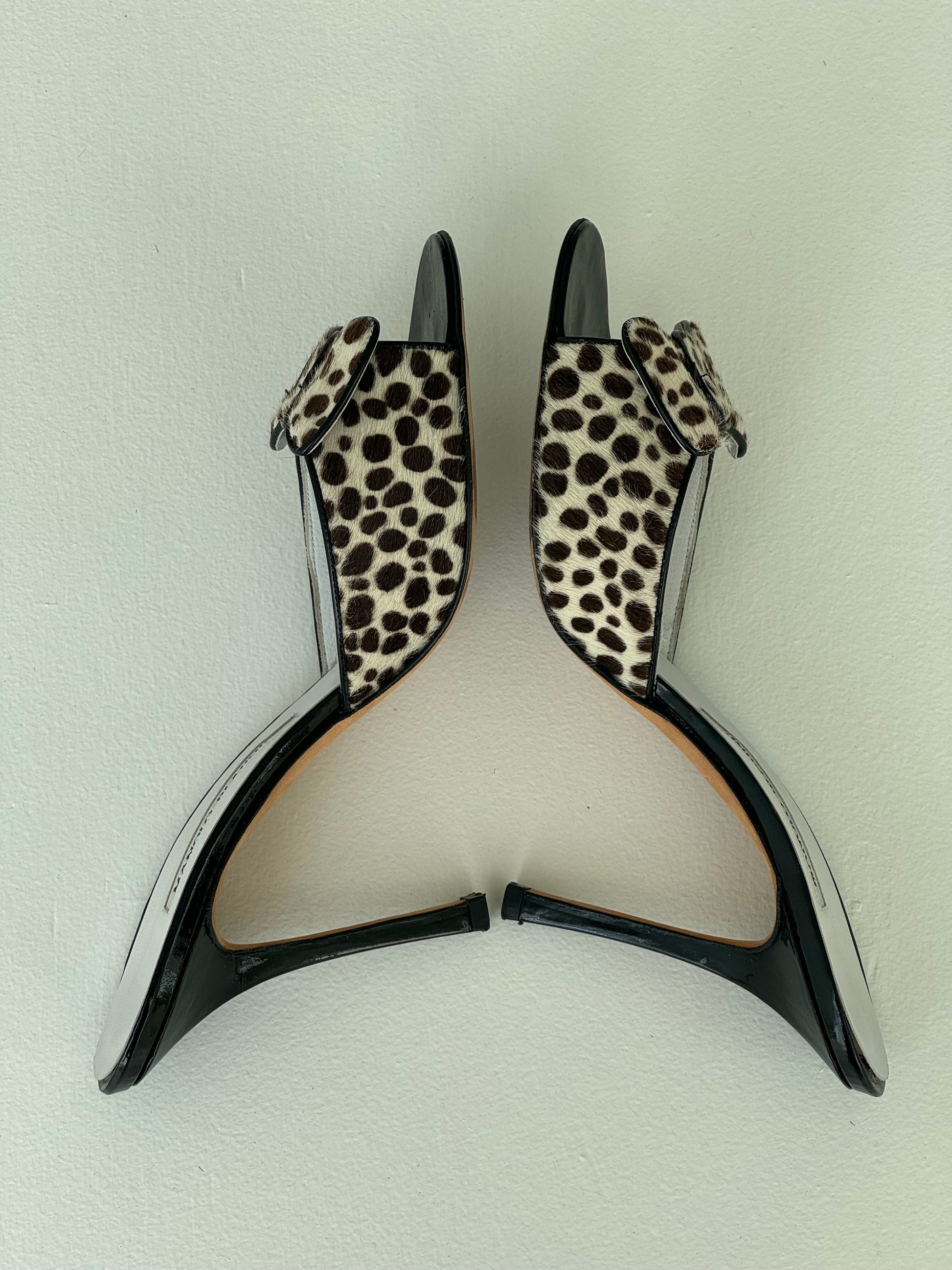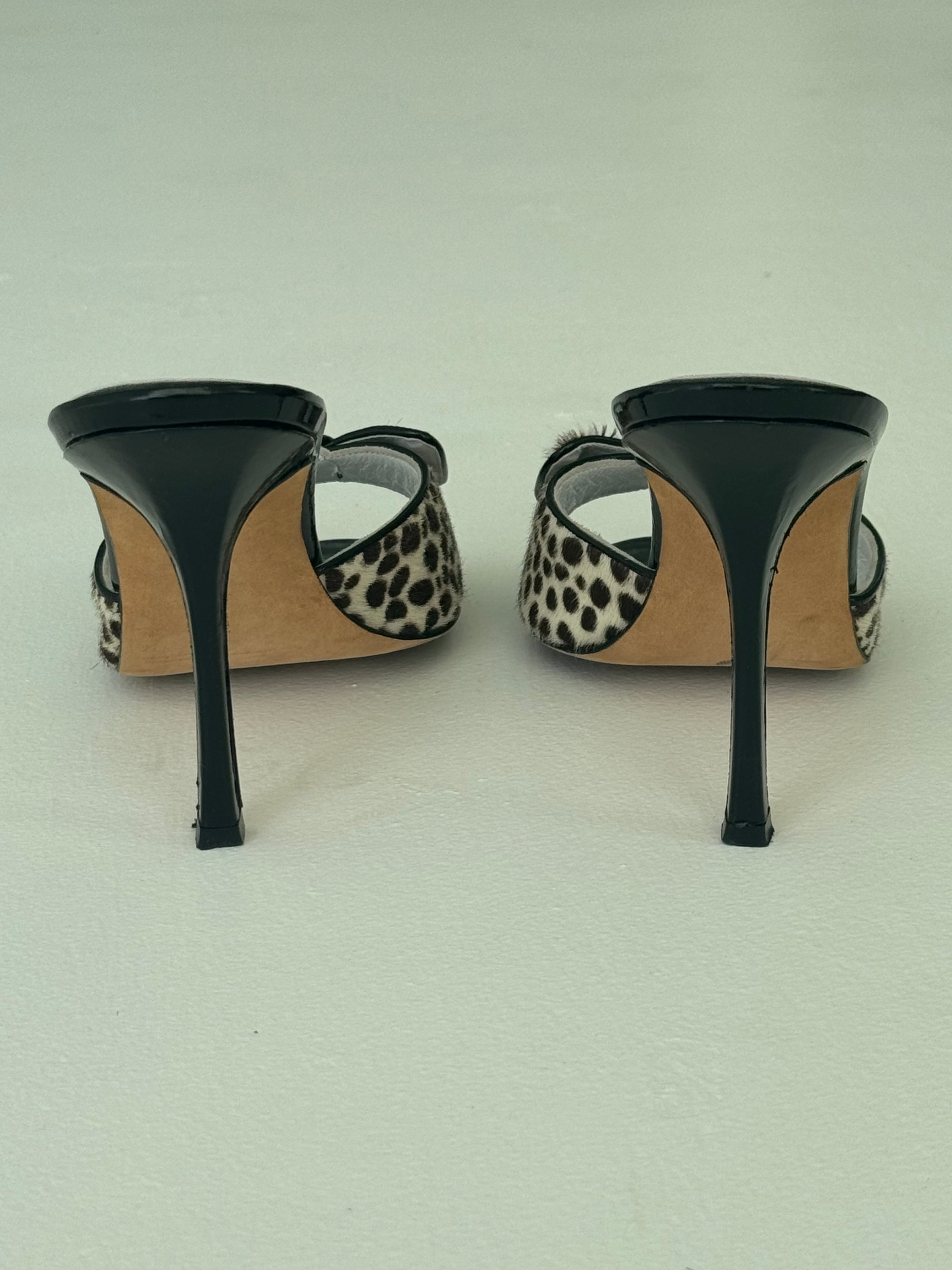 + “Pony hair” mules with bow and polka dot animal print. featuring patent leather coated high heel. Come with original dust bag.