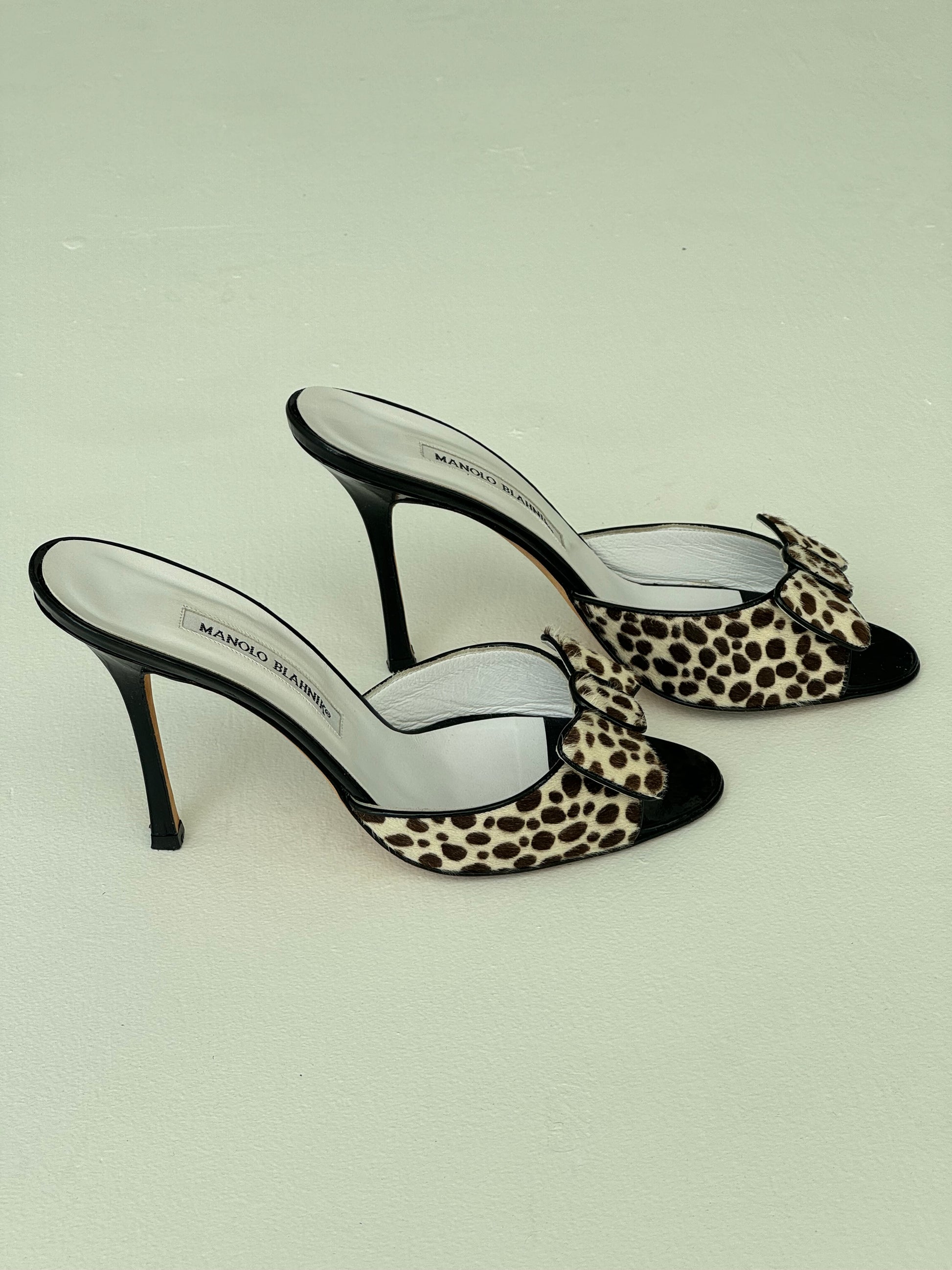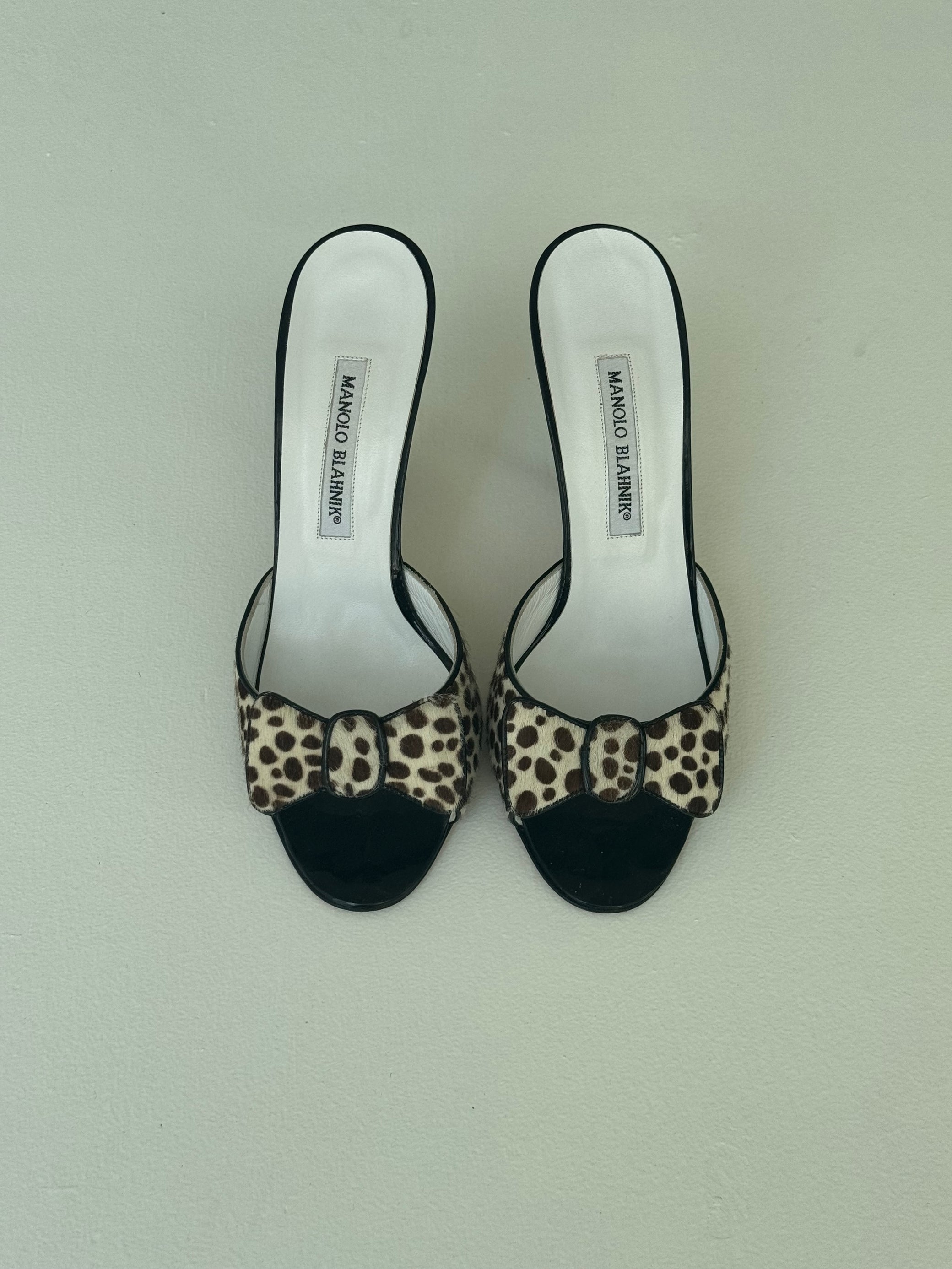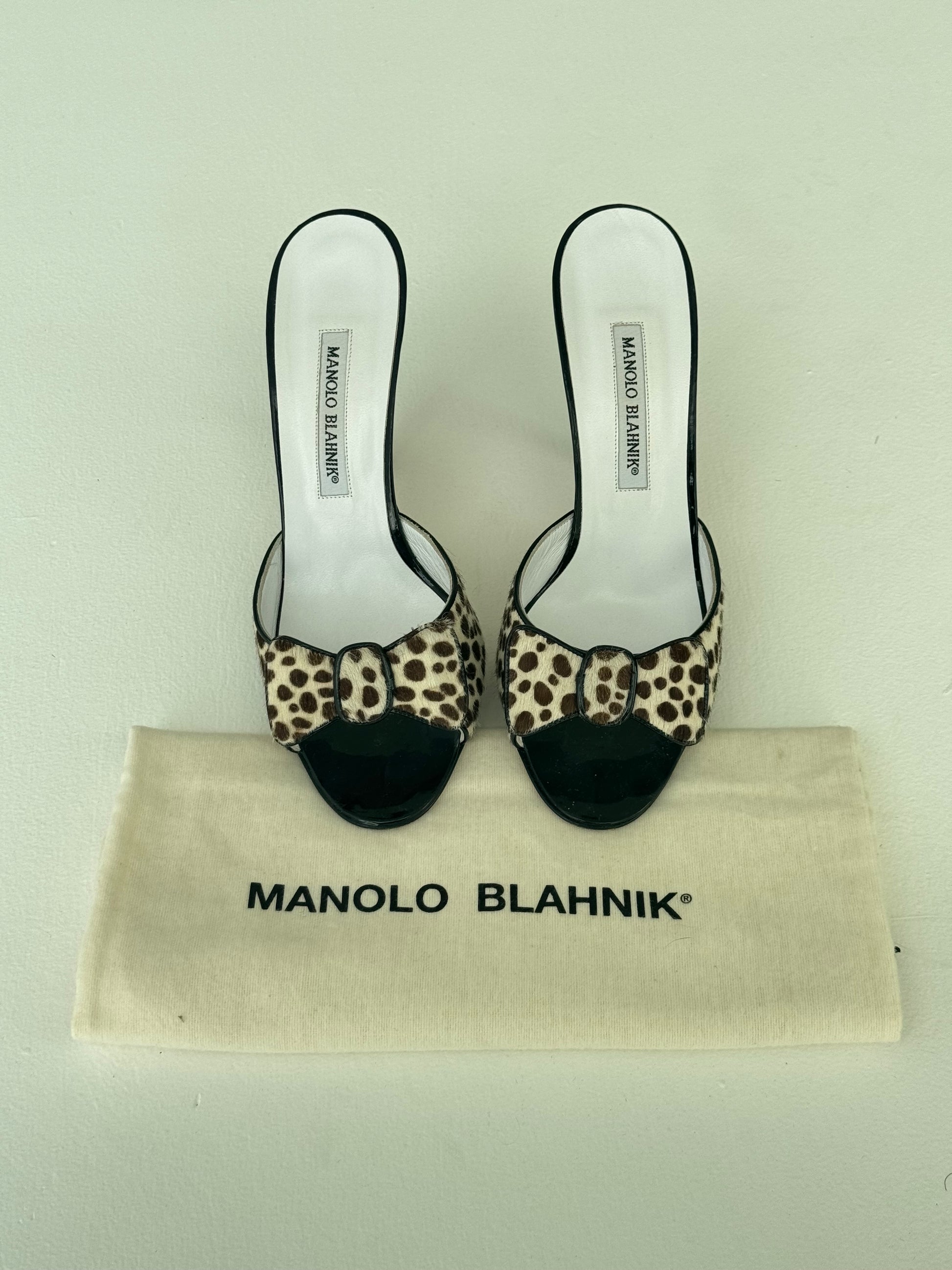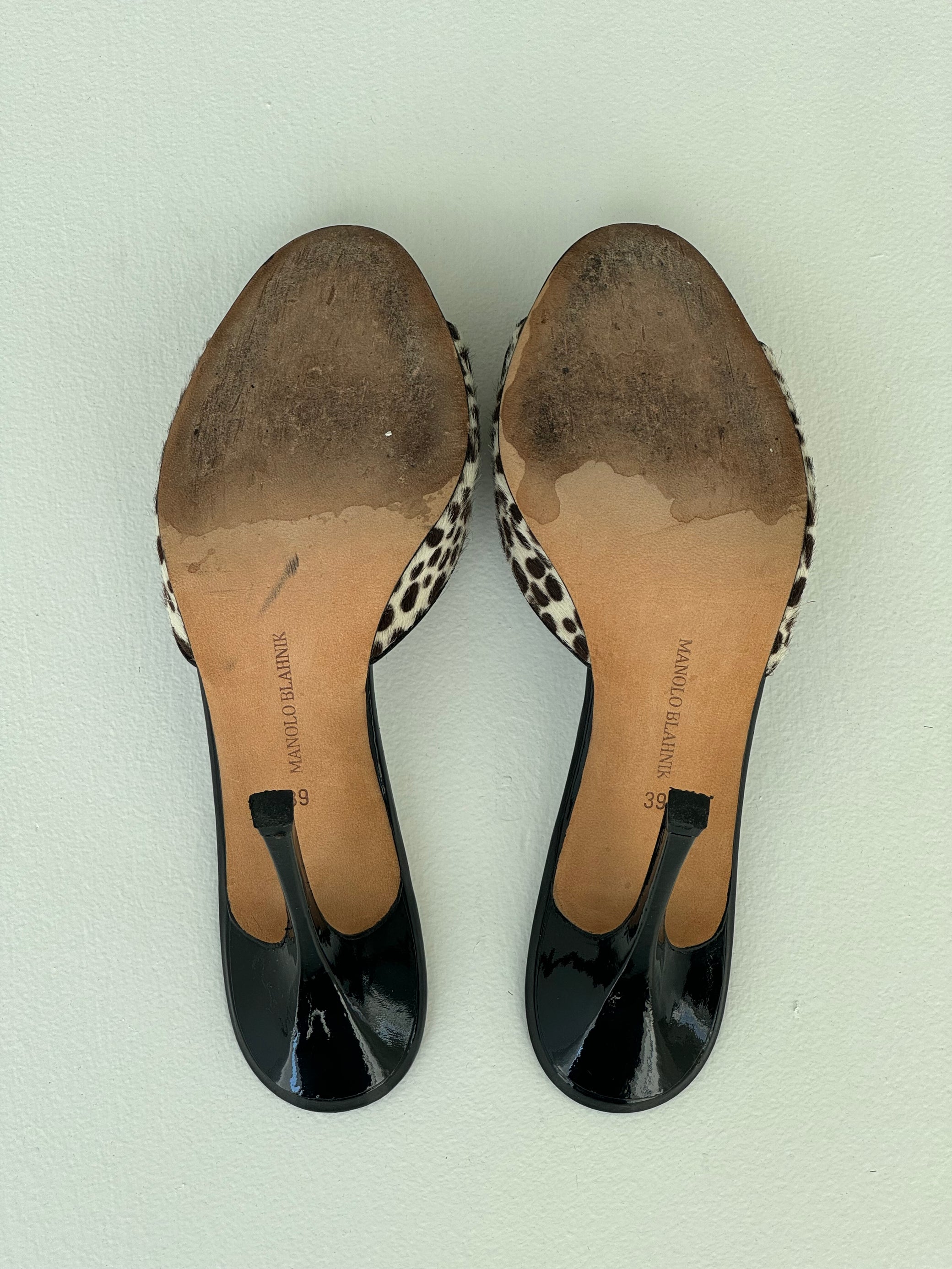 + “Pony hair” mules with bow and polka dot animal print. featuring patent leather coated high heel. Come with original dust bag.