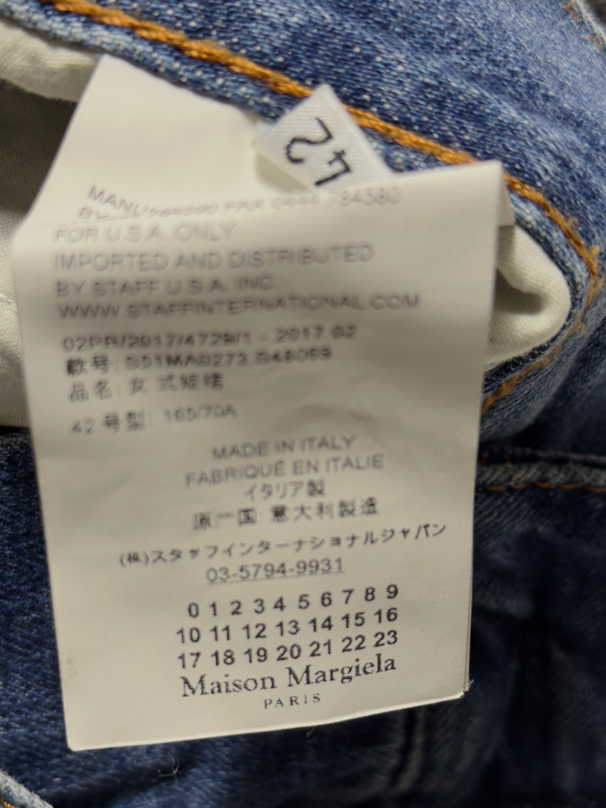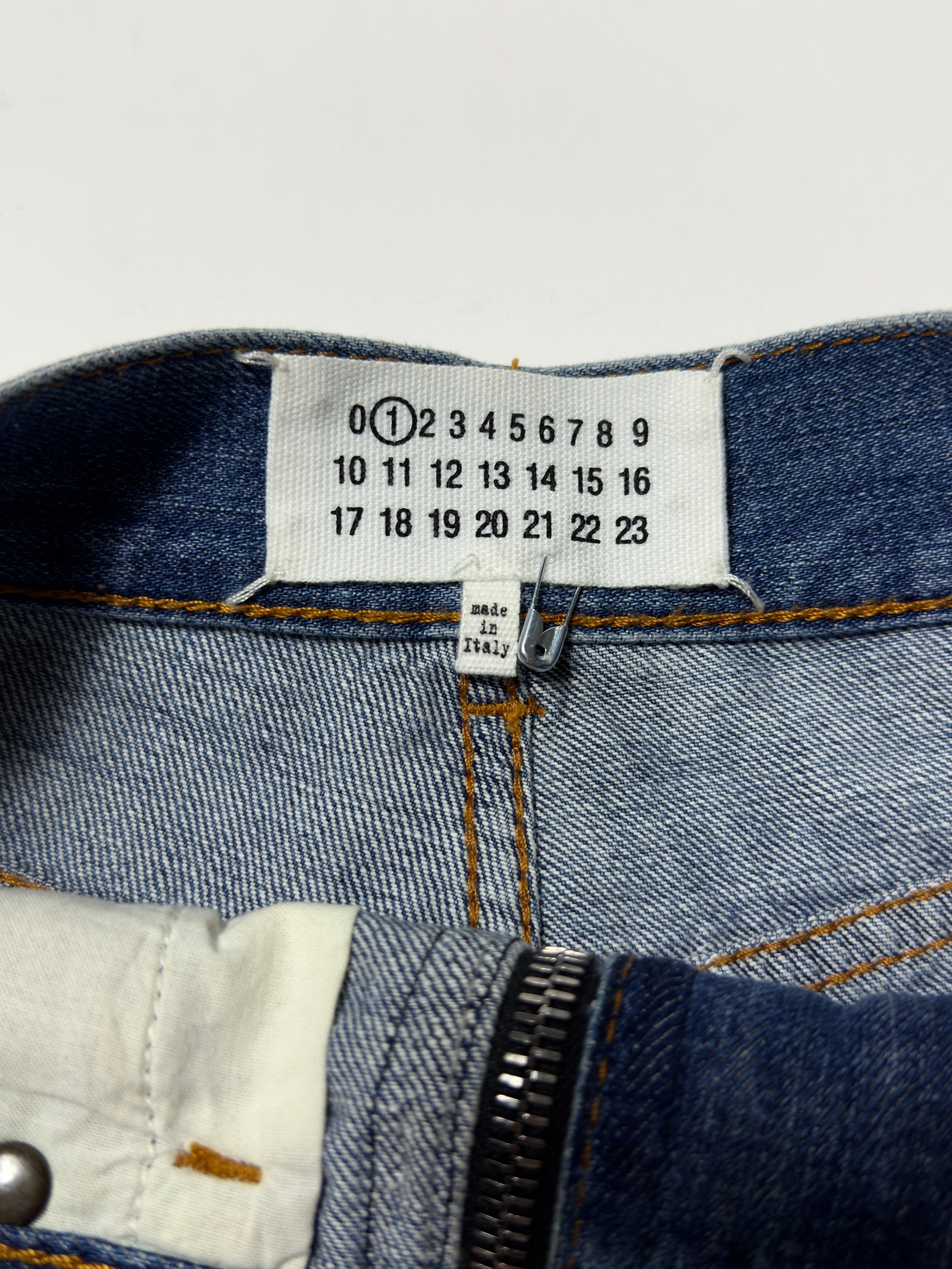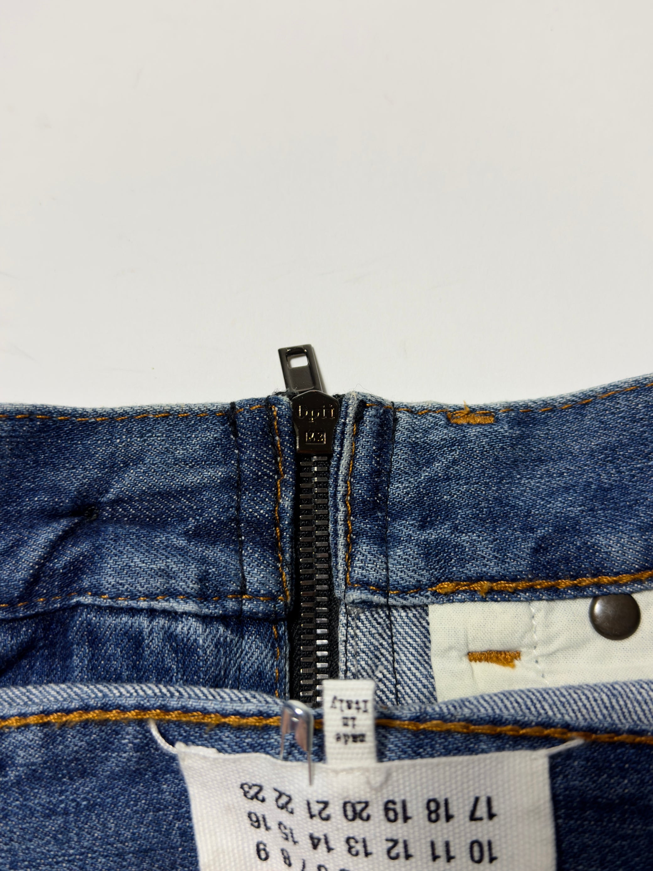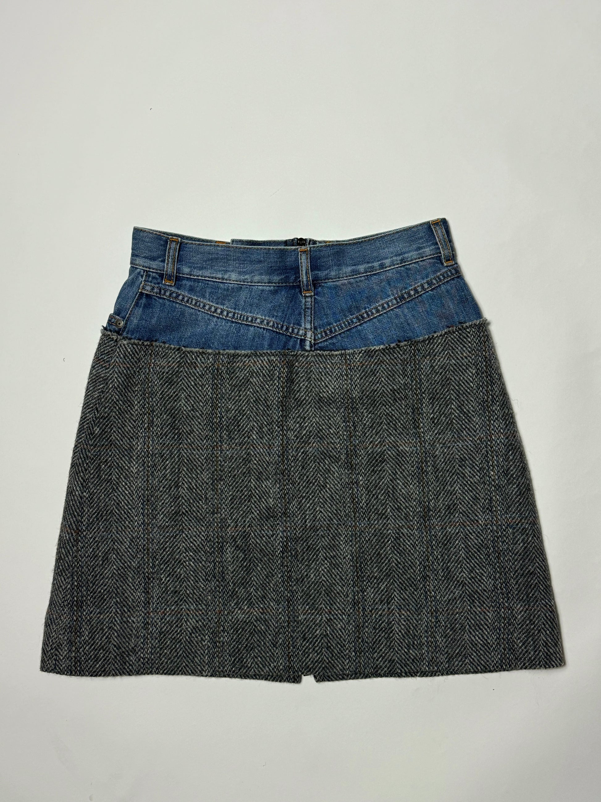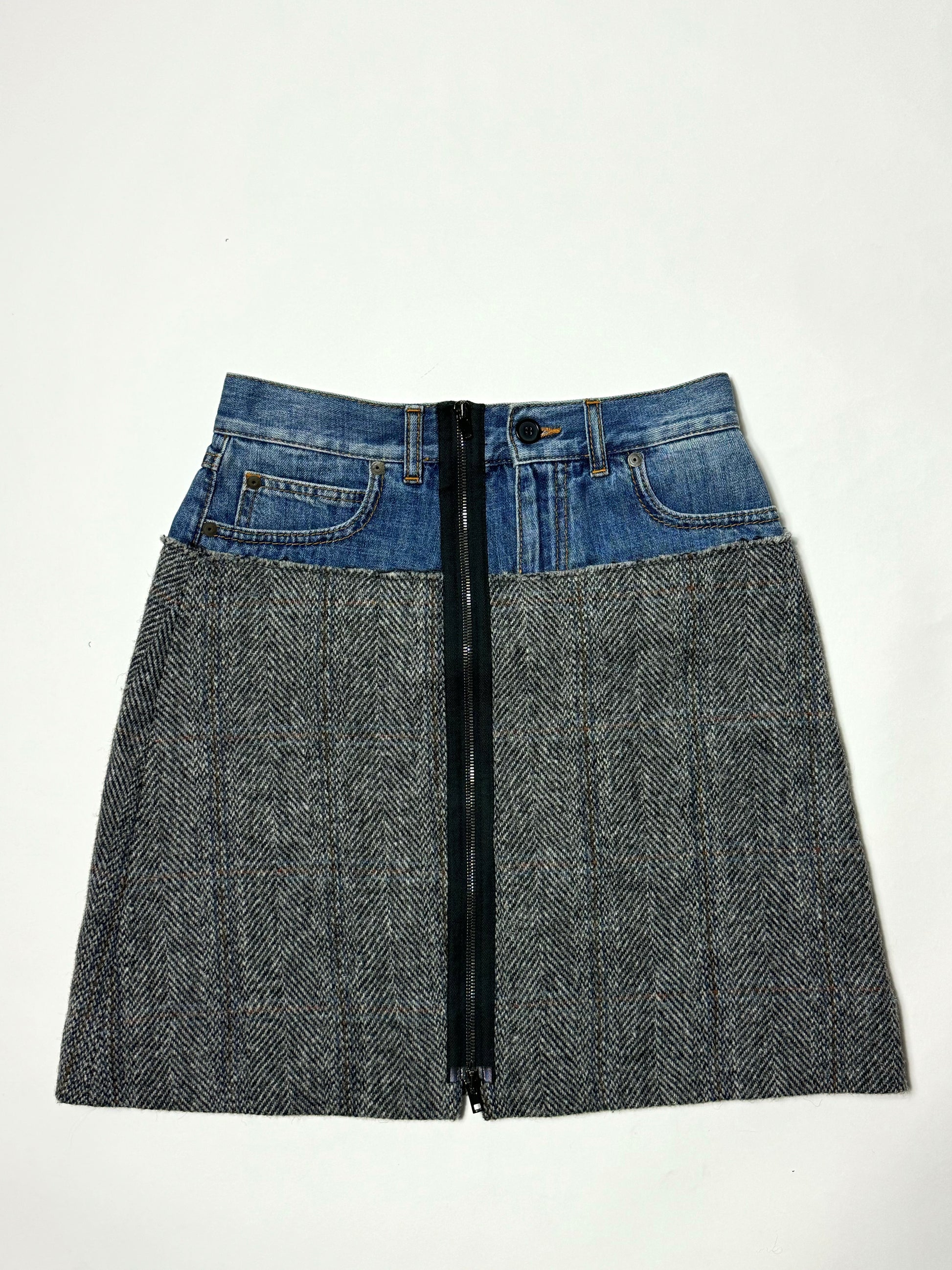 Featuring front silver hardware zipper and a "trompe l'oeil" front button. Top half of skirt in true denim blue with bottom portion of skirt in grey tweed.