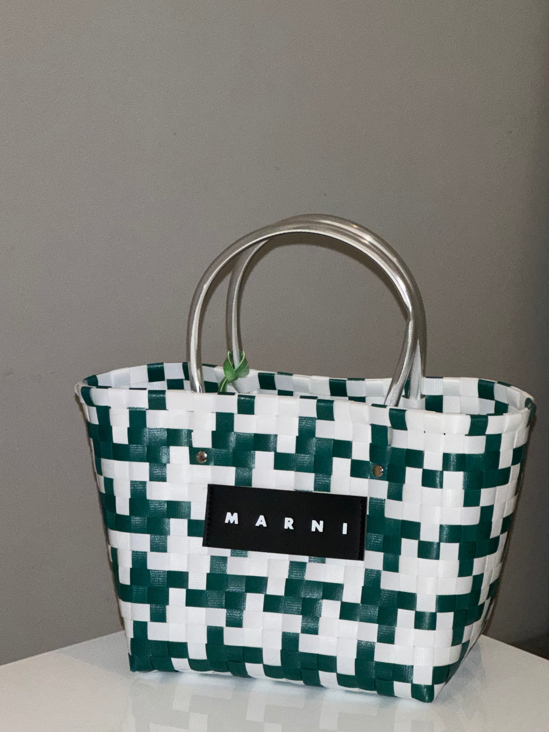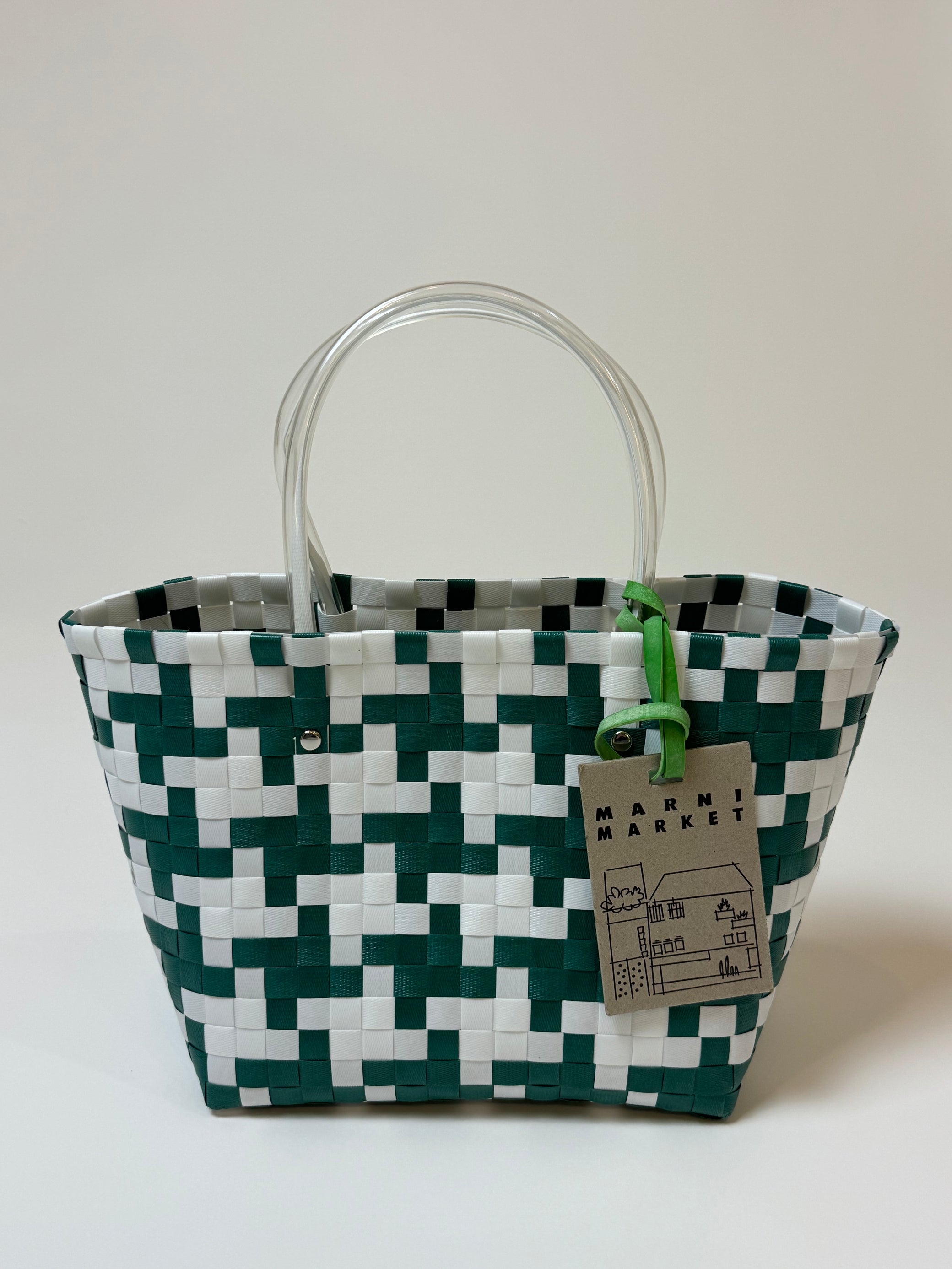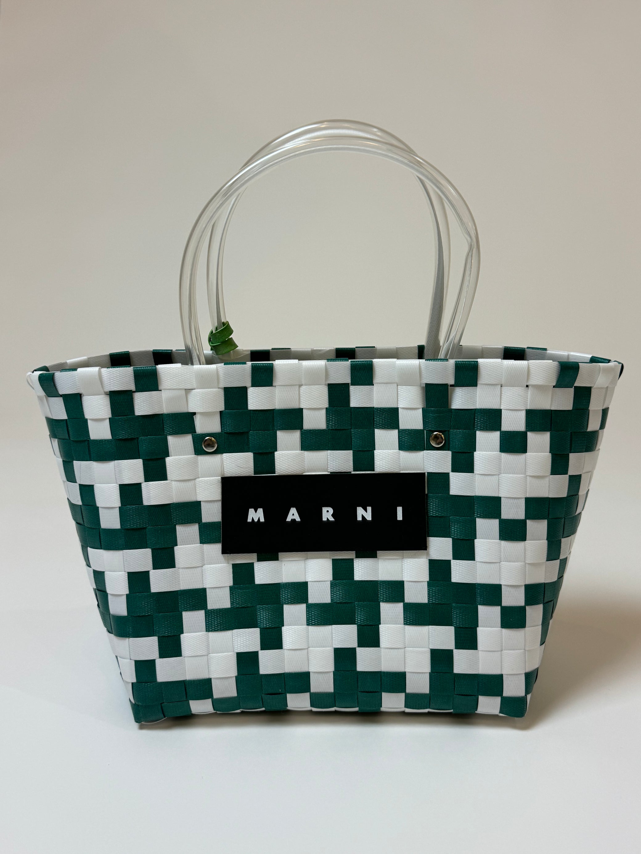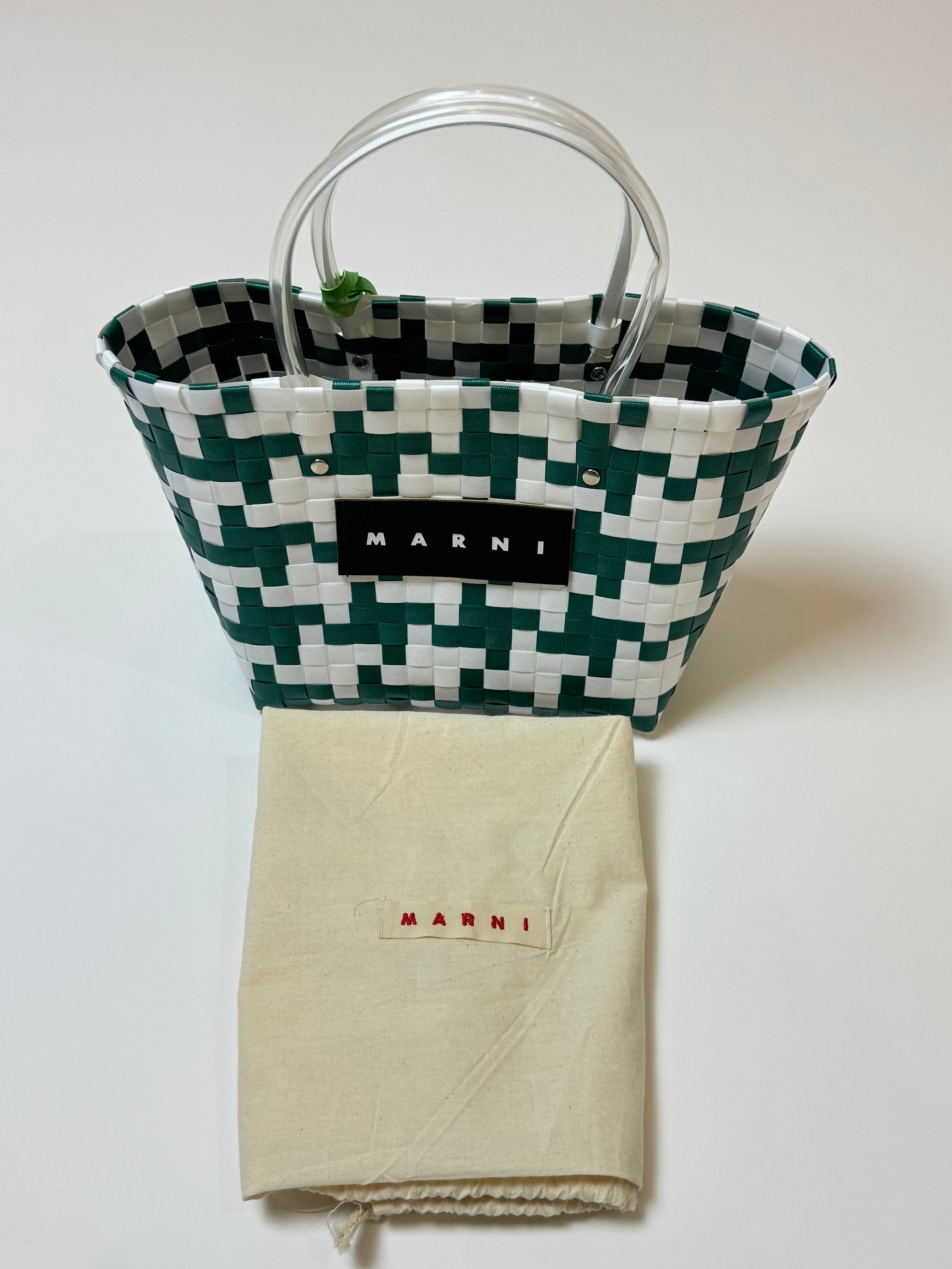 + Multicoloured green and white woven shopper with clear tubular handles. Front black leather tag with Marni logo. Brand new with tags and original dust bag.