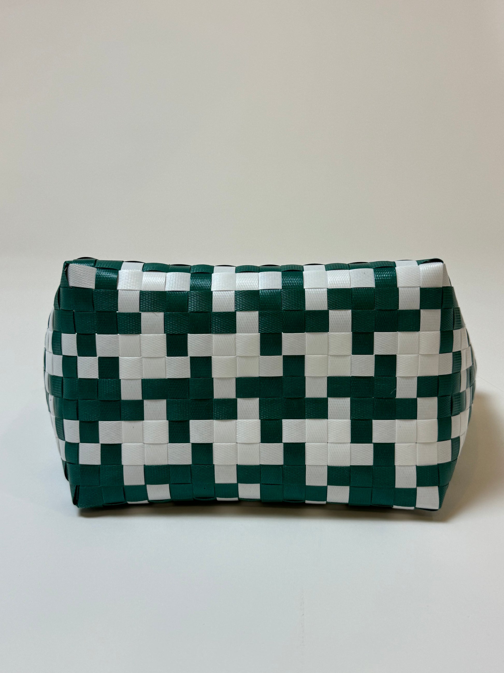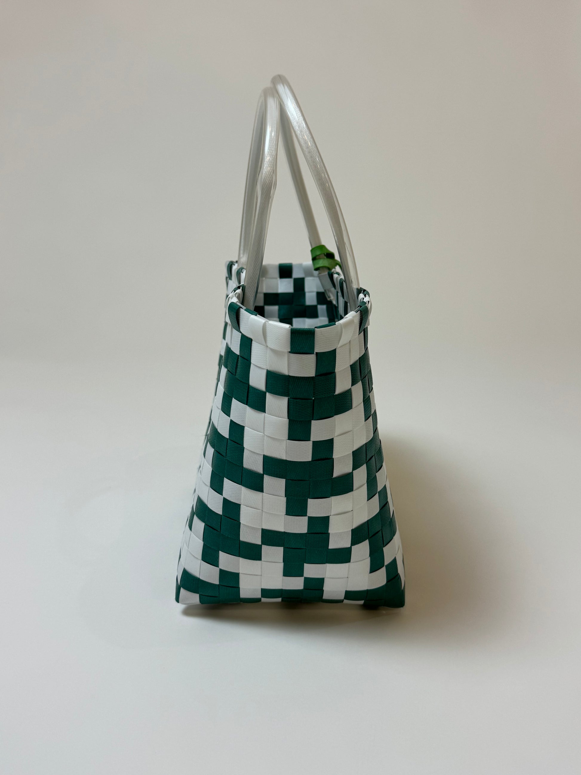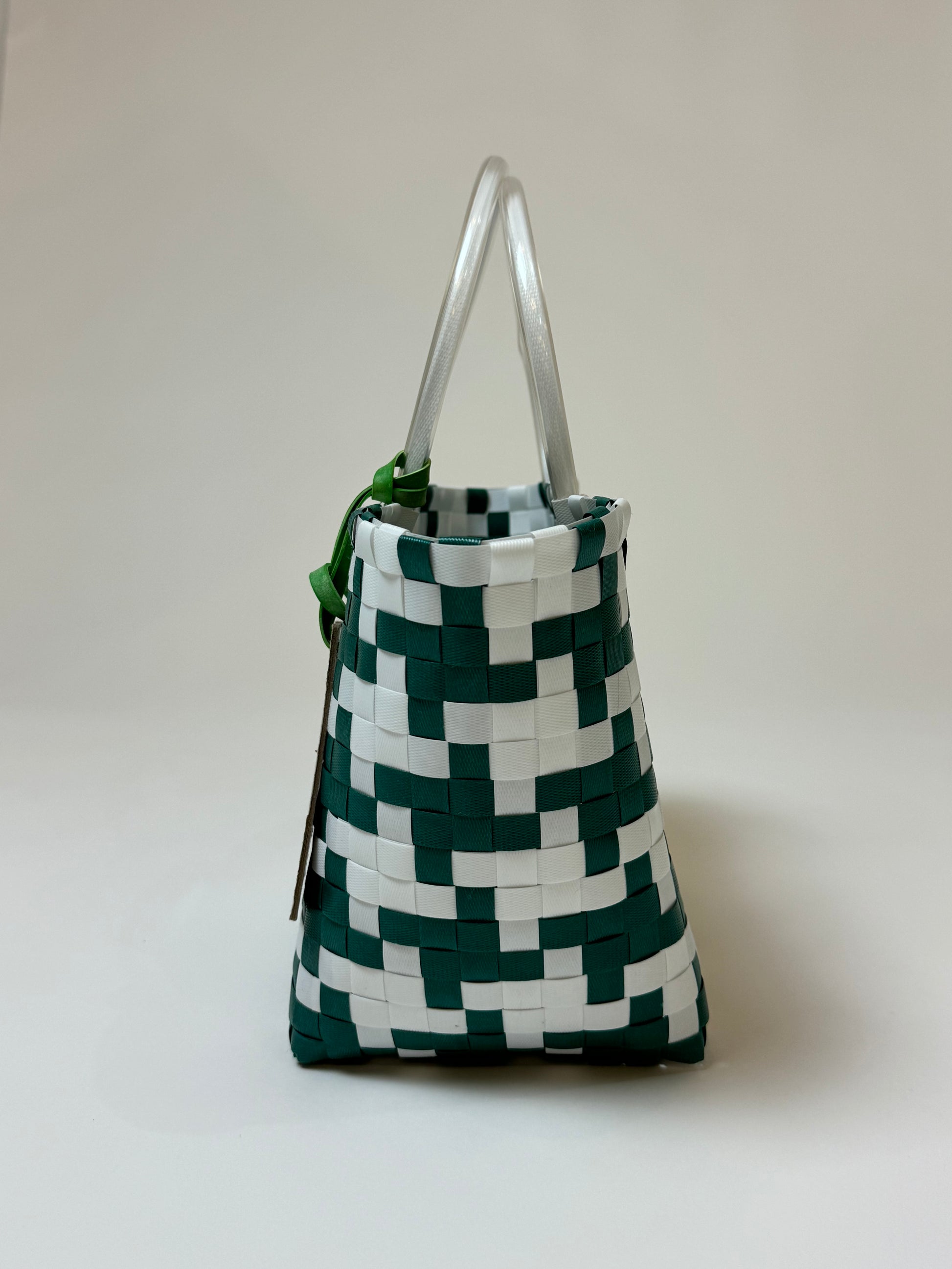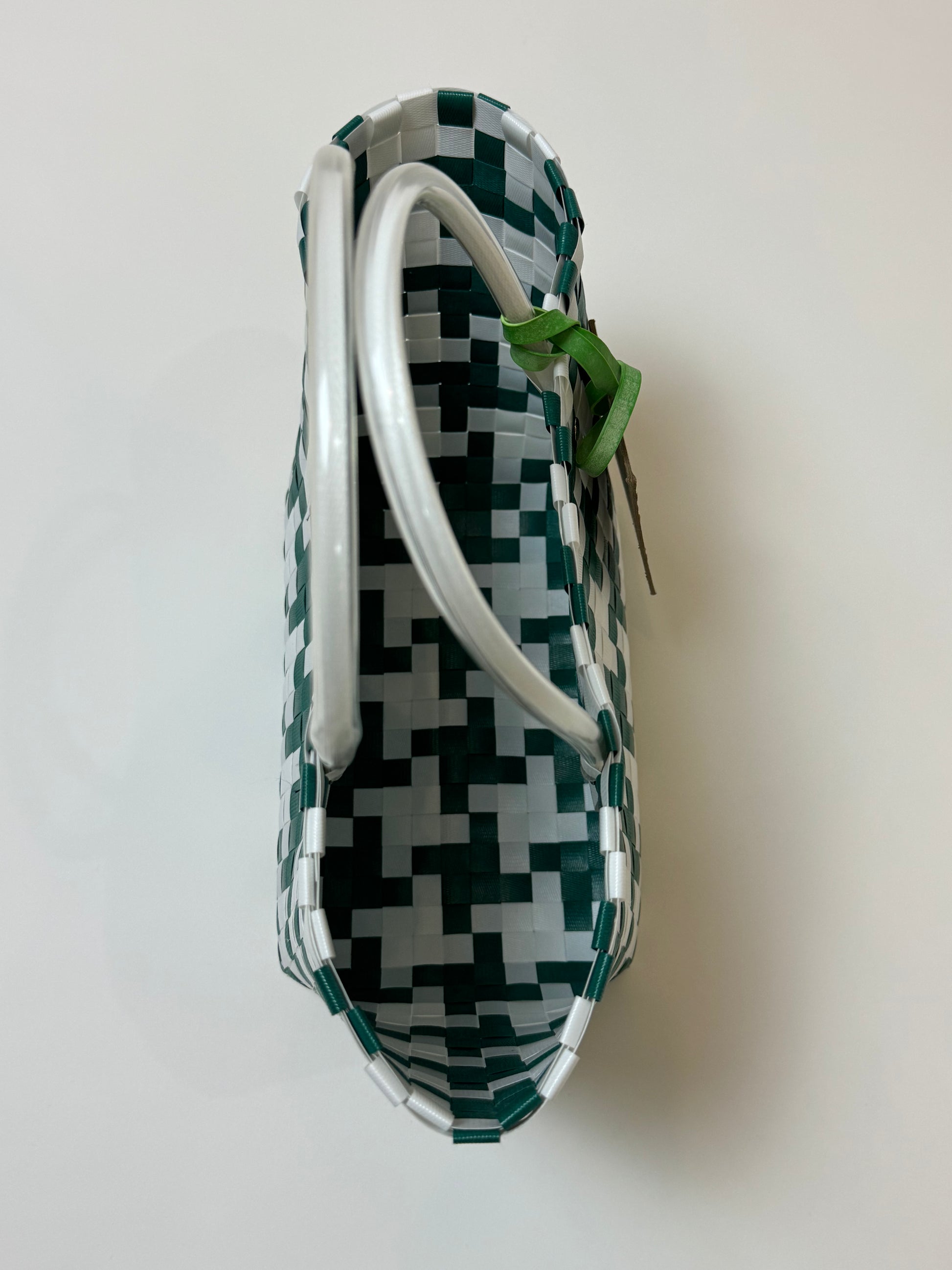 + Multicoloured green and white woven shopper with clear tubular handles. Front black leather tag with Marni logo. Brand new with tags and original dust bag.