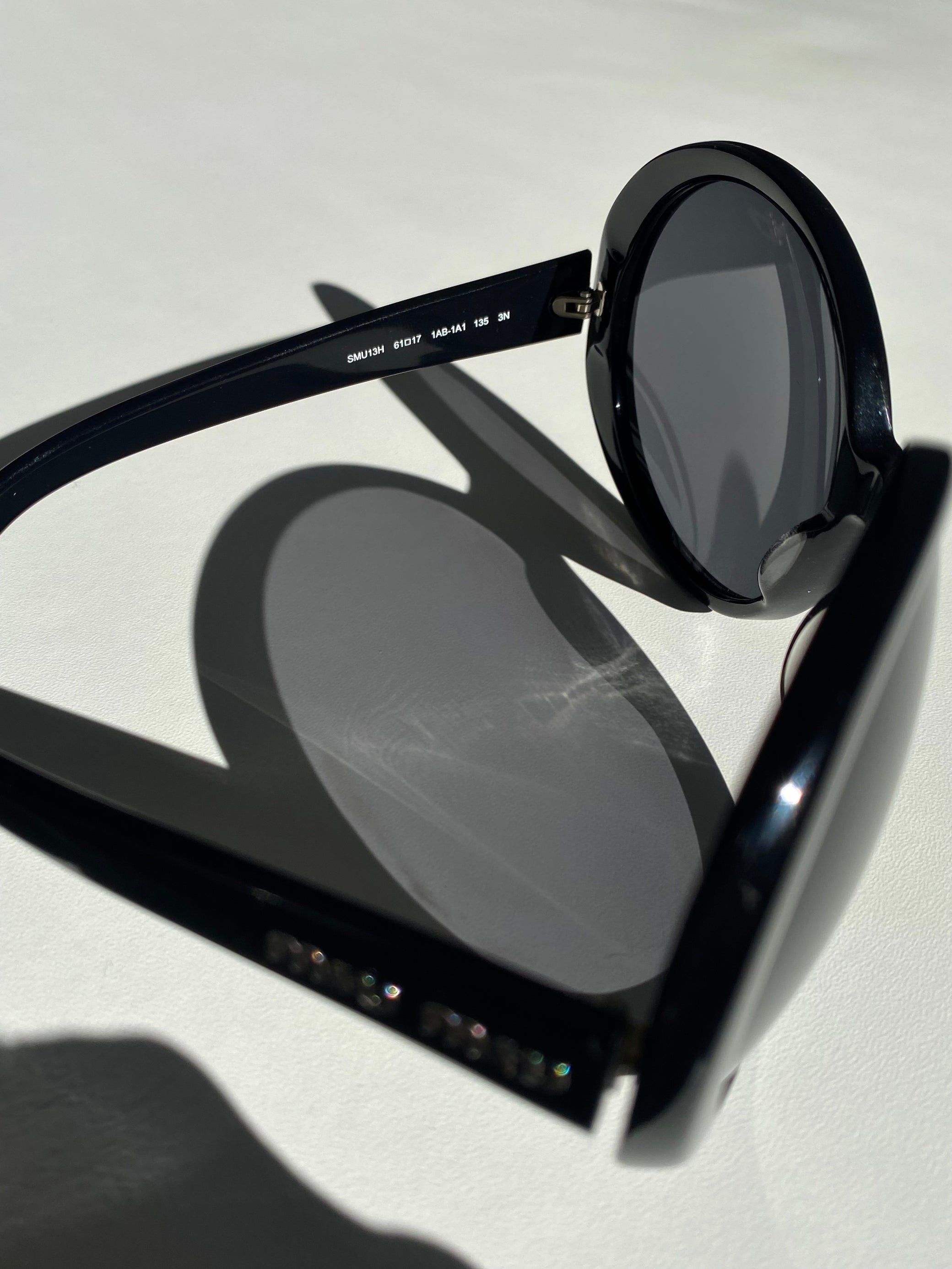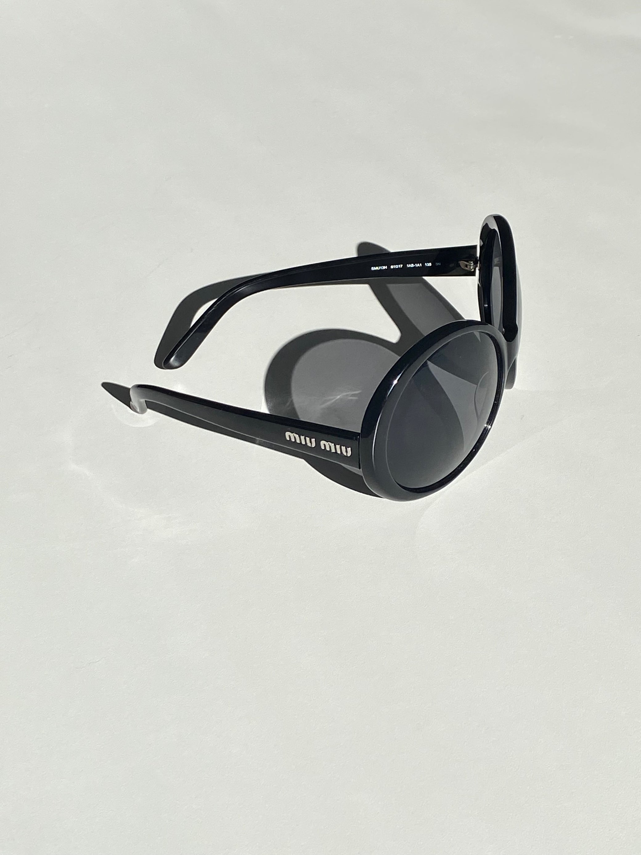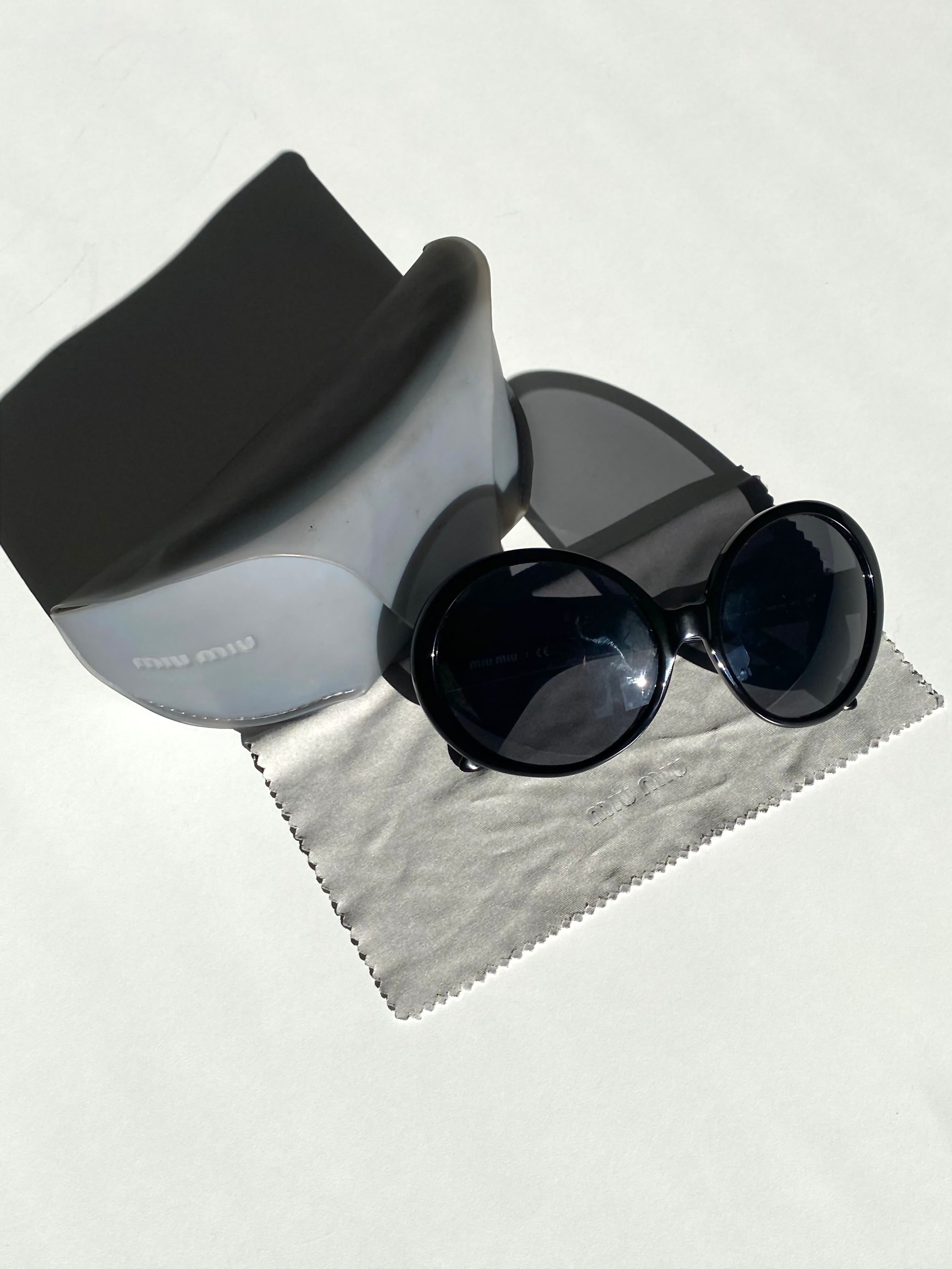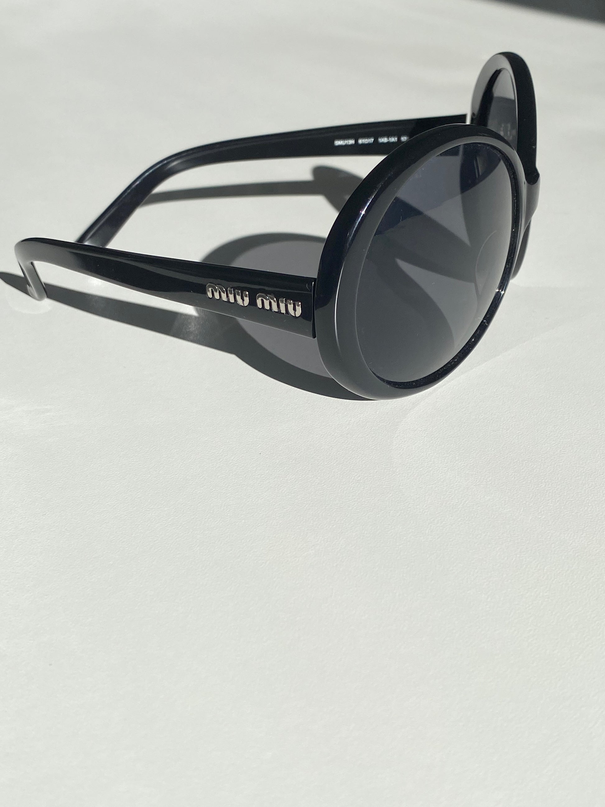 + Vintage black round oversized sunglasses with Miu Miu logo on sides. Comes with original case and cloth.