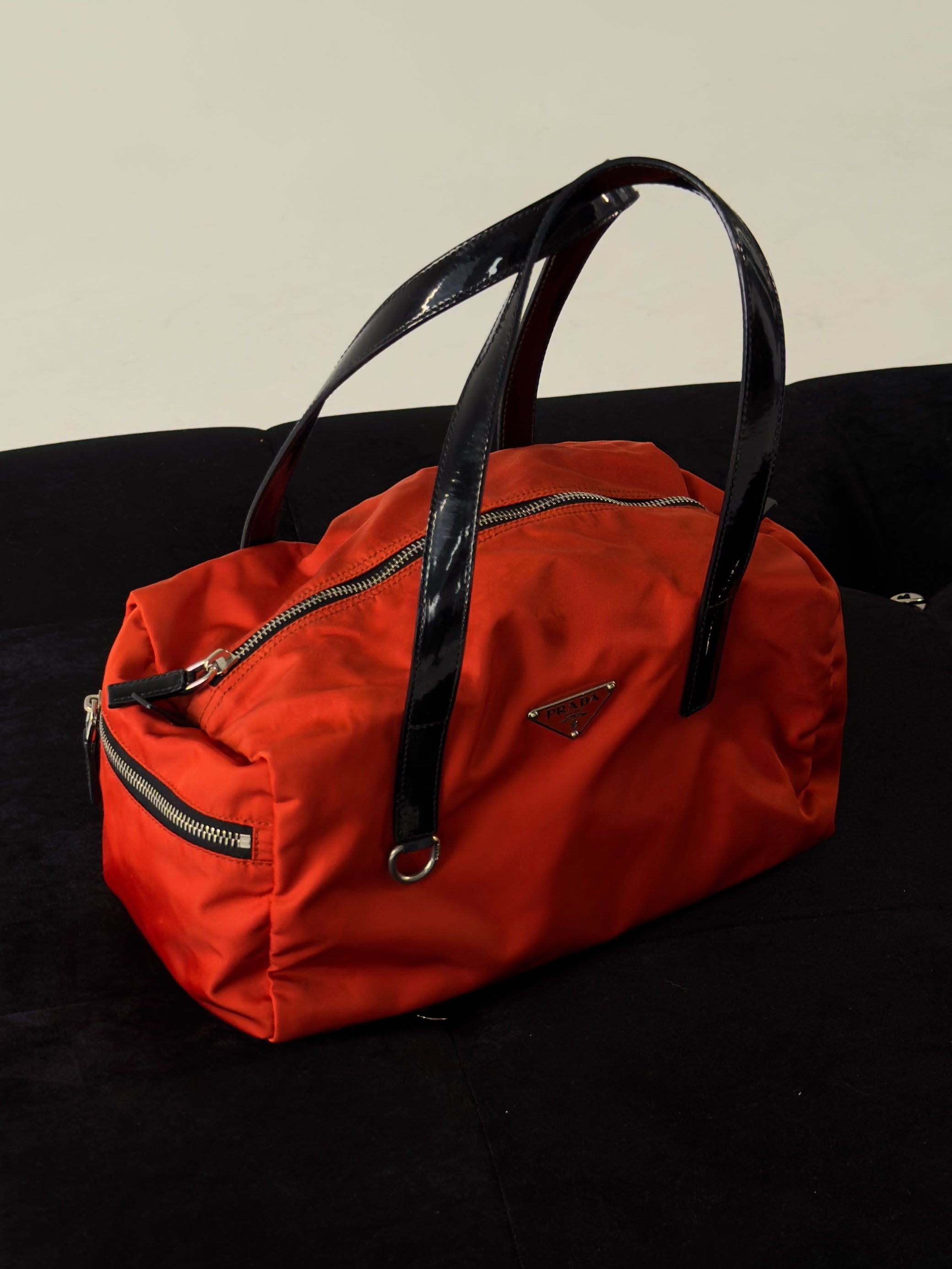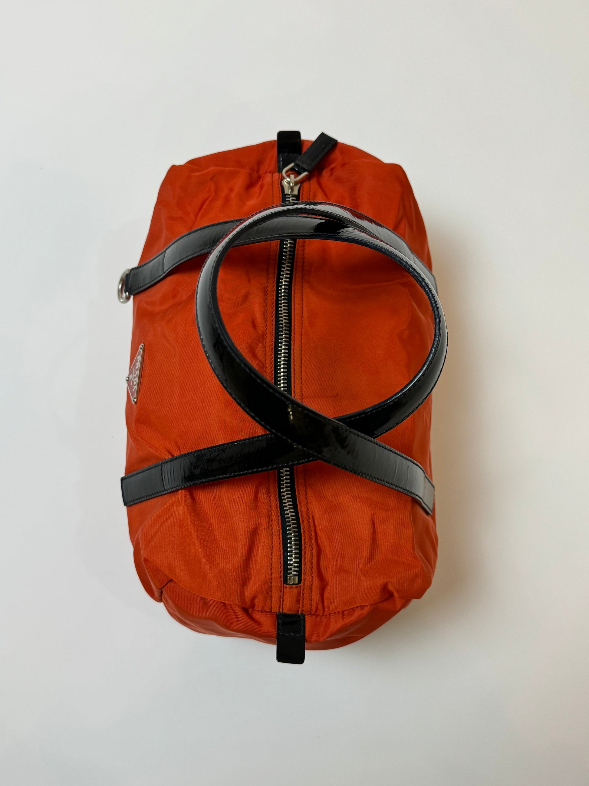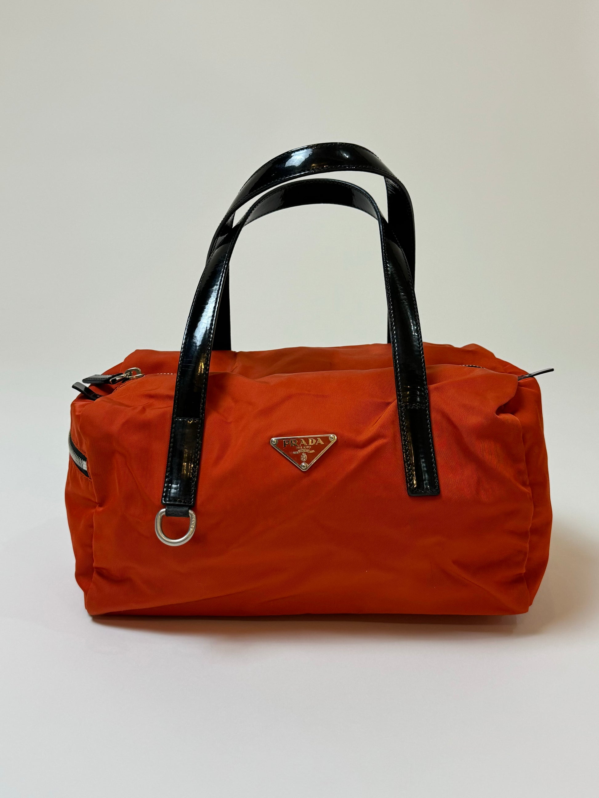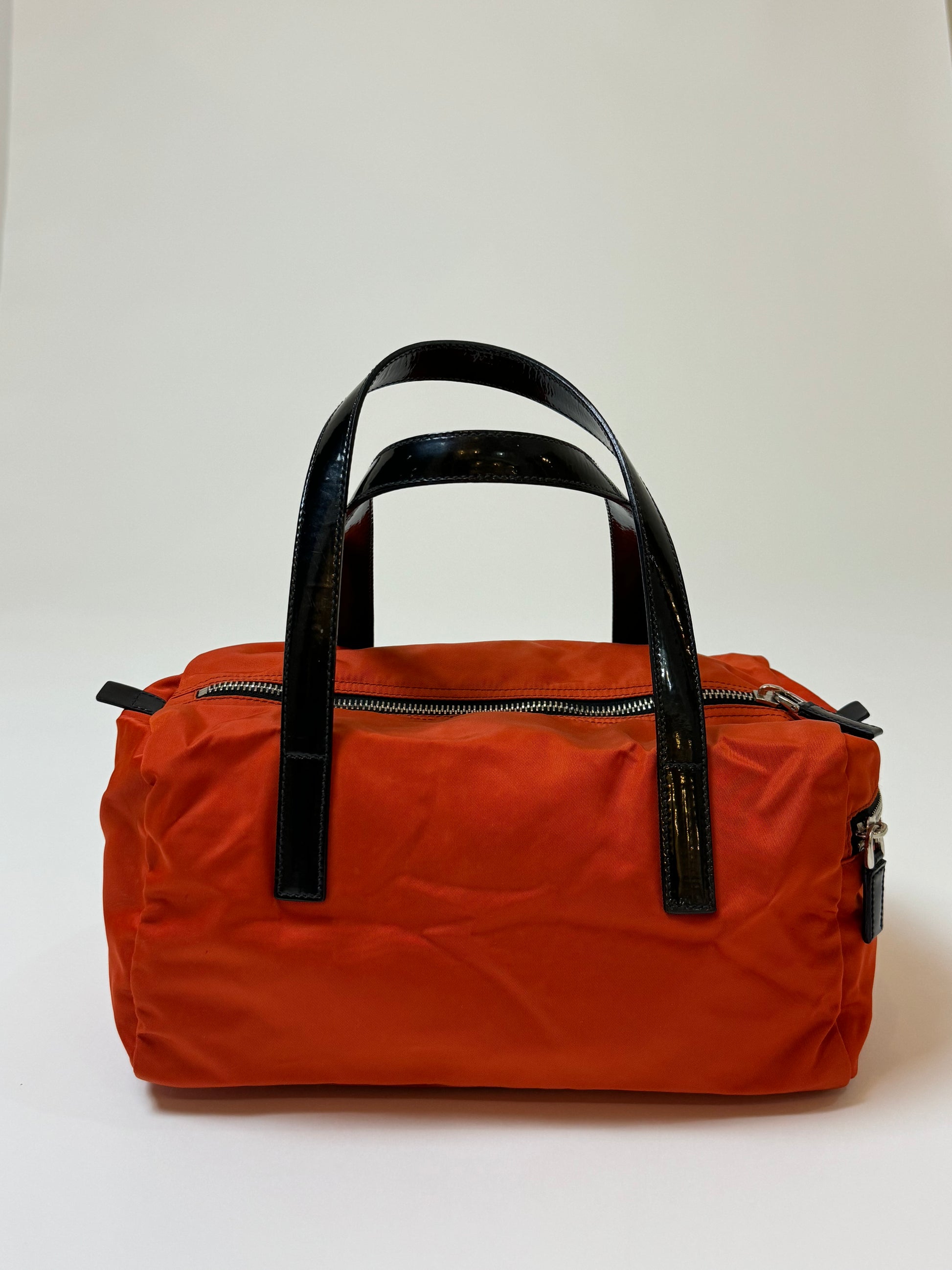 + Nylon bowling bag featuring black patent leather handles, zipper closure at top, side zipper pocket from zilver hardware.