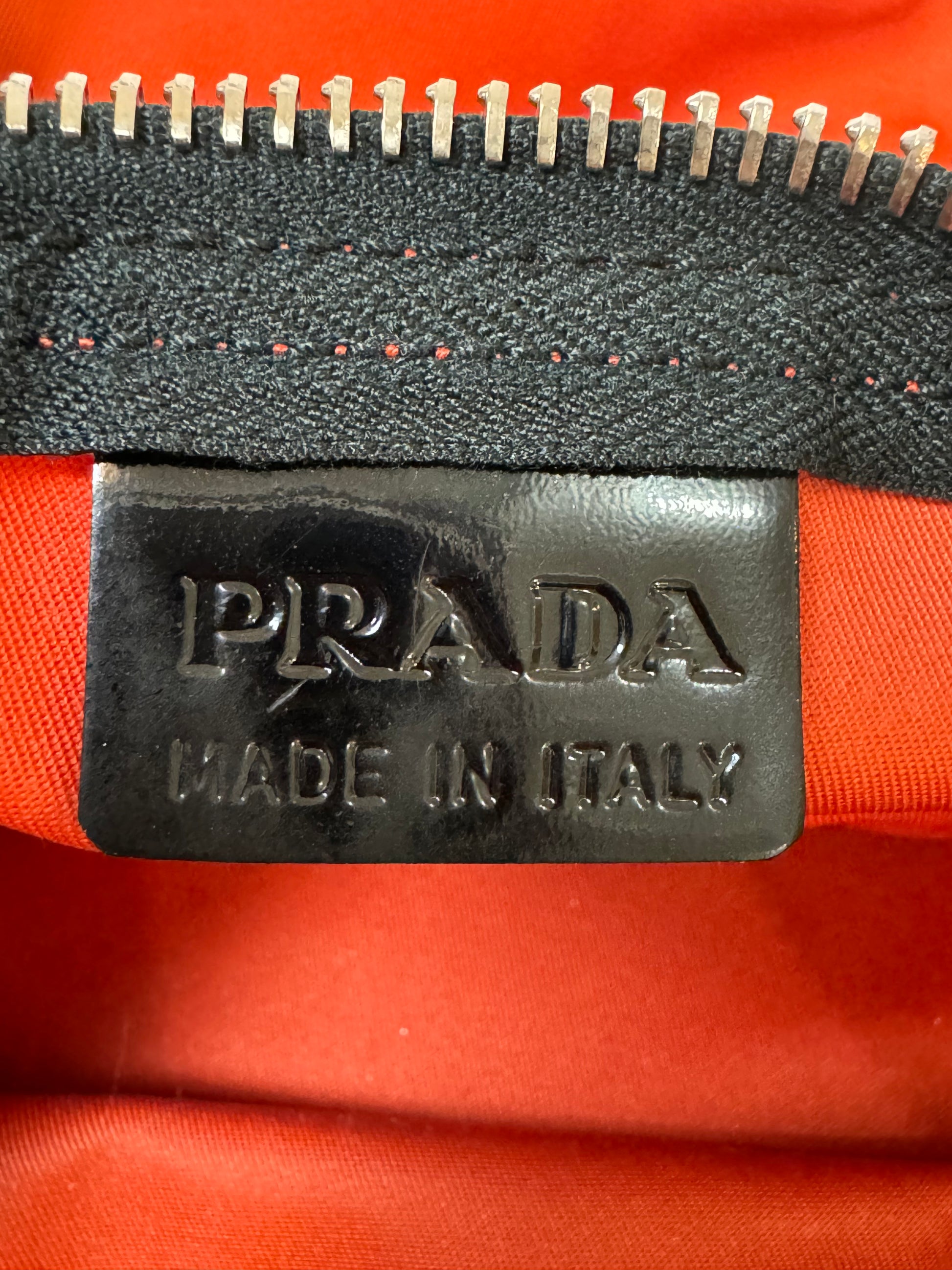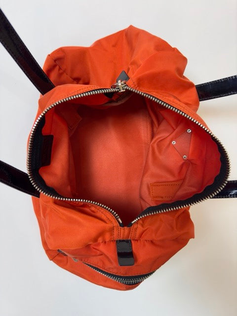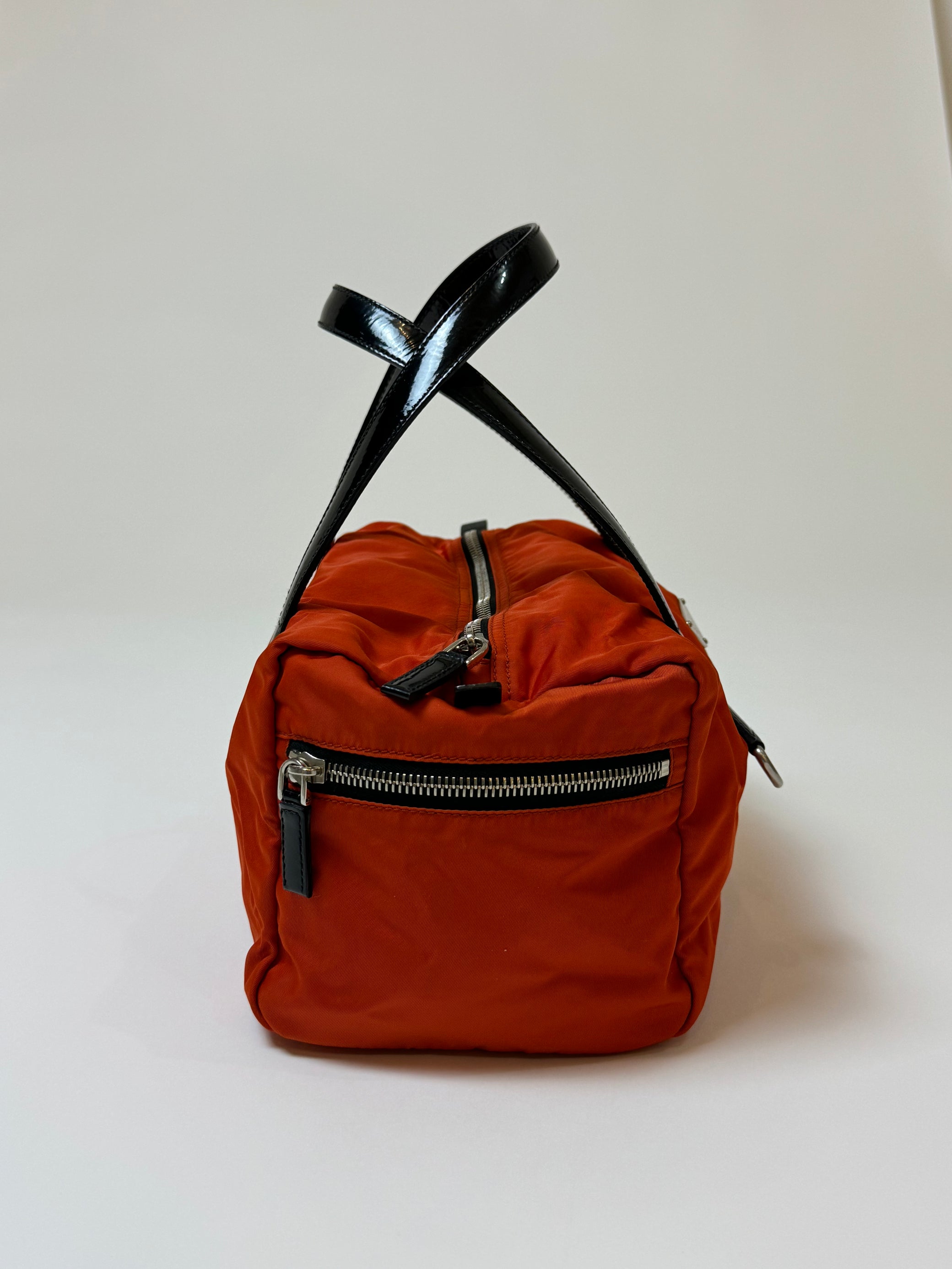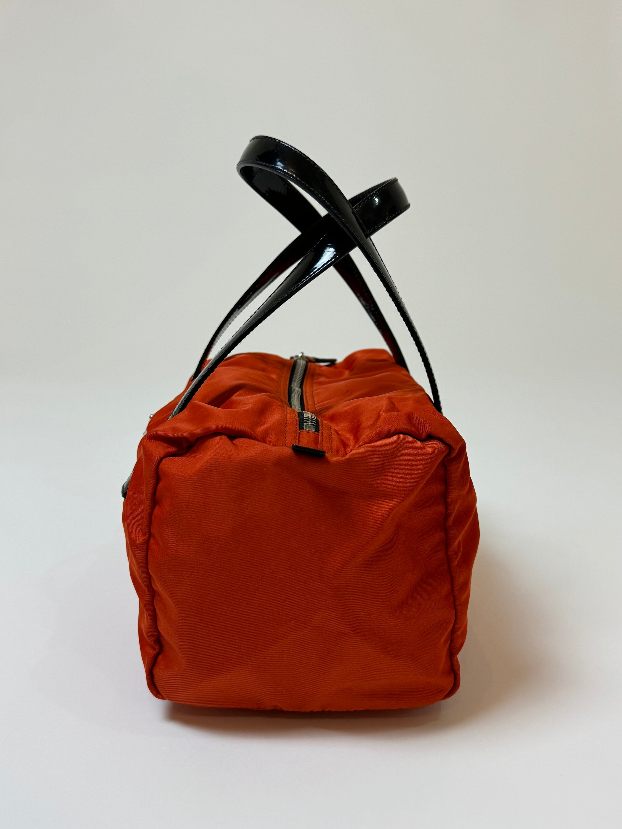 + Nylon bowling bag featuring black patent leather handles, zipper closure at top, side zipper pocket from zilver hardware.