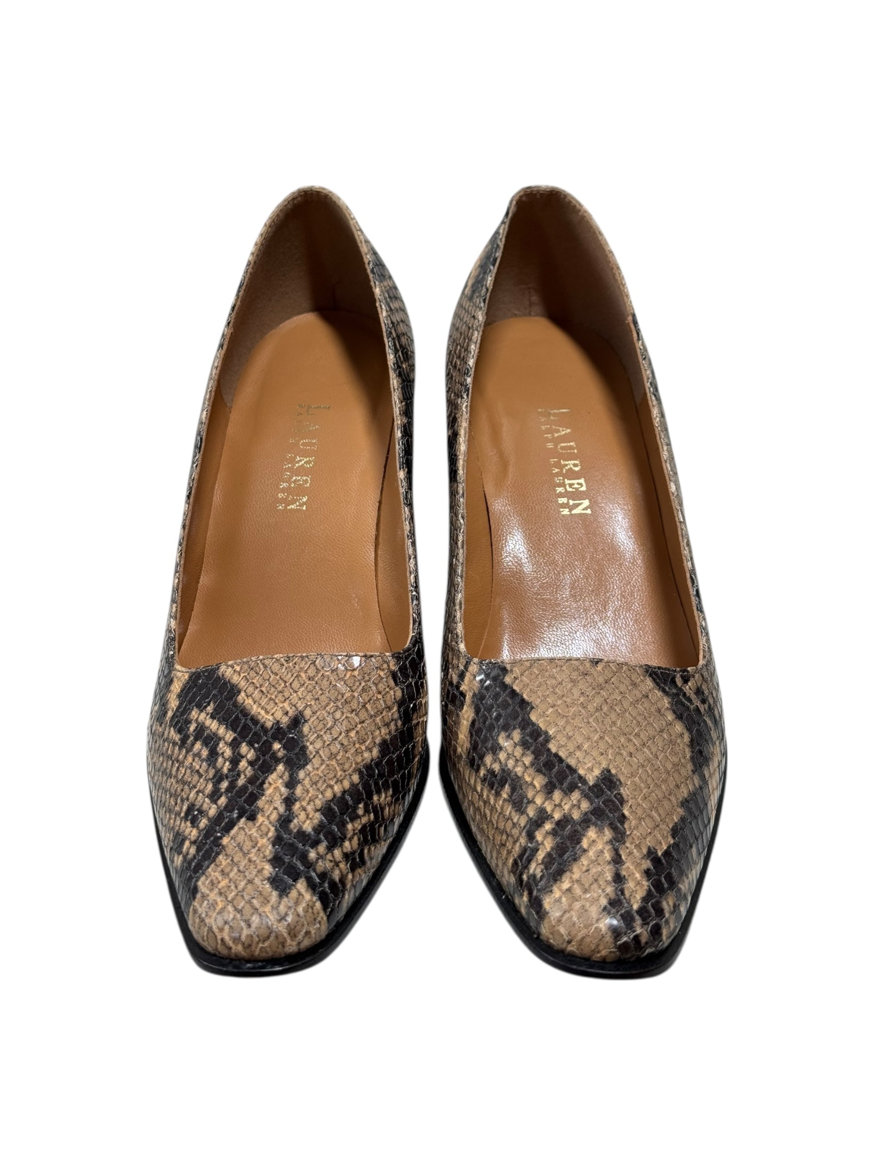 A refined pair of mid-heel pumps by Lauren Ralph Lauren, crafted in faux snakeskin with a sculpted square toe and sturdy block heel. The neutral tones and structured silhouette lend a polished yet modern edge suitable for both day and evening wear.