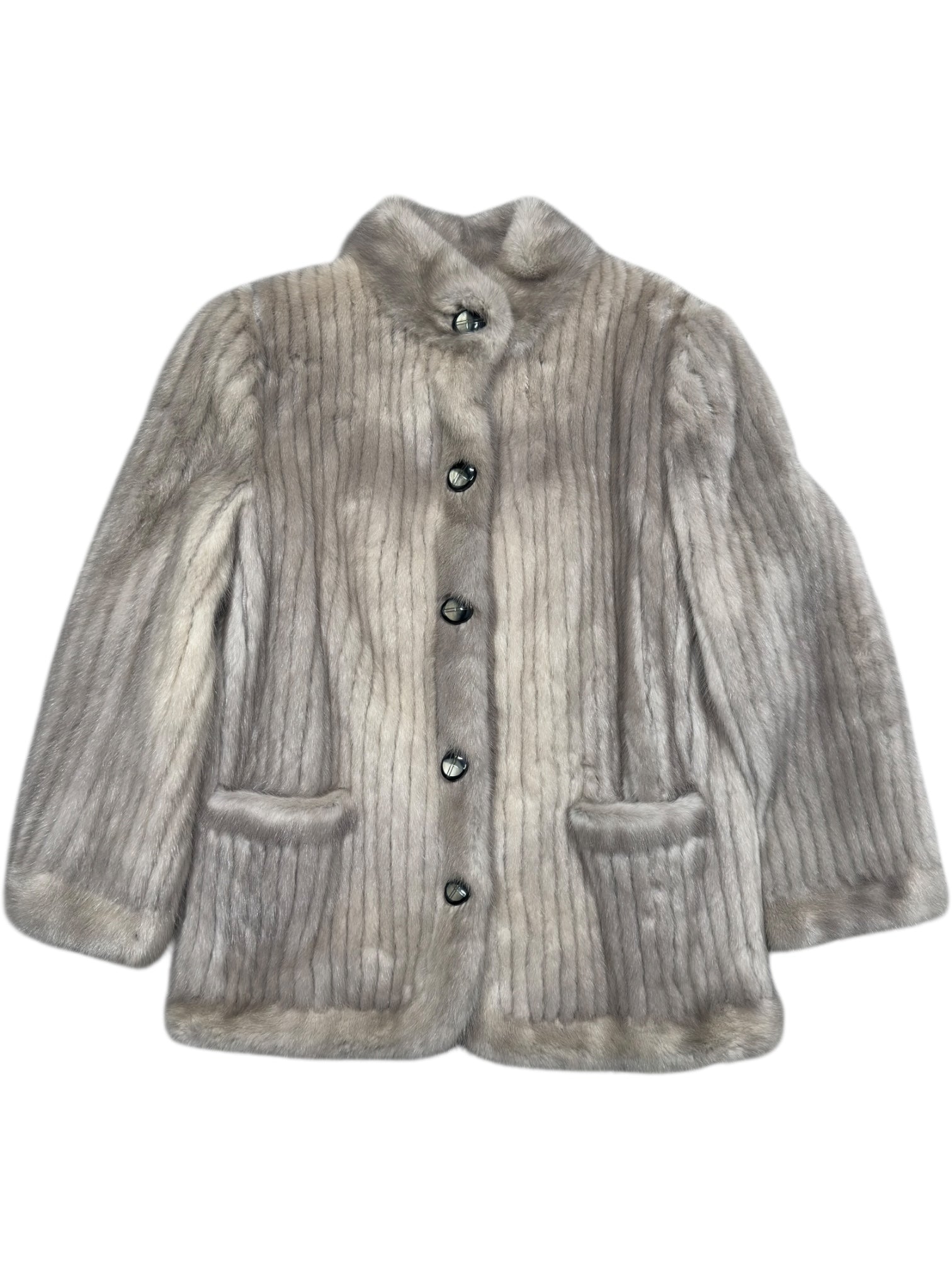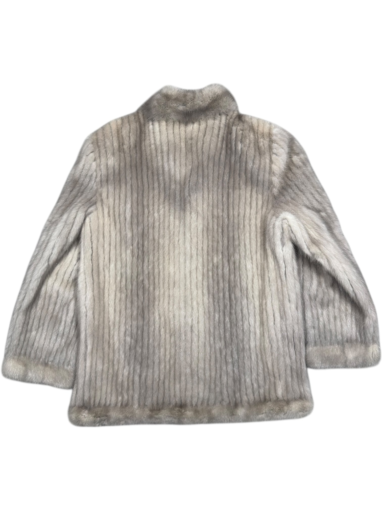 Cream mid-length fur coat defined by a vertically paneled surface that creates natural texture and depth throughout the body. The exterior has a soft, dense finish with subtle tonal variation, giving the coat a sculptural yet understated presence. Cut with a straight, slightly boxy silhouette and finished with a classic button-front closure.