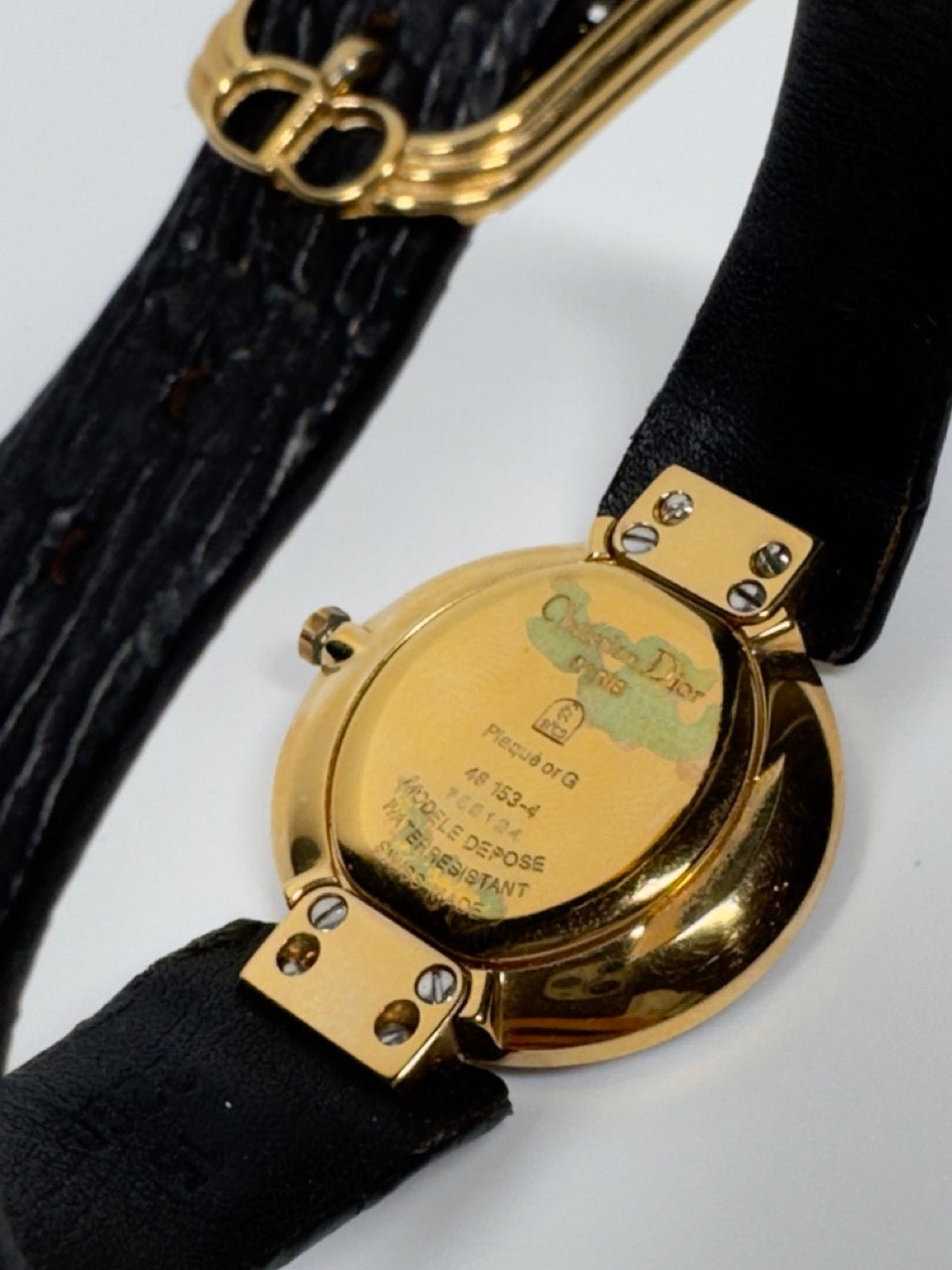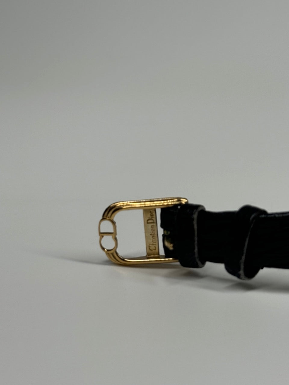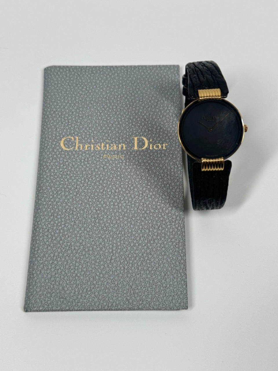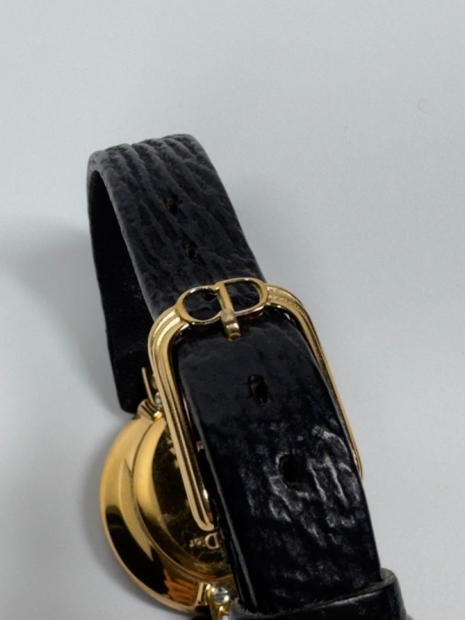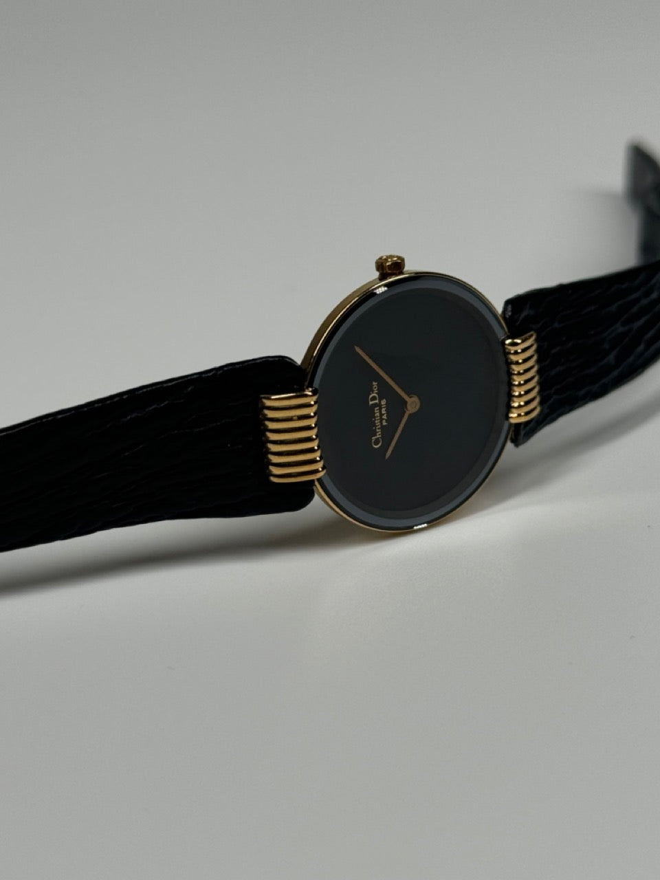 Classic black and gold-tone watch featuring a minimalist black dial with "Christian Dior Paris" branding. Gold accents on the lugs and crown. Black textured leather strap with a gold-tone buckle. Quartz movement. Comes with Christian Dior watch booklet.