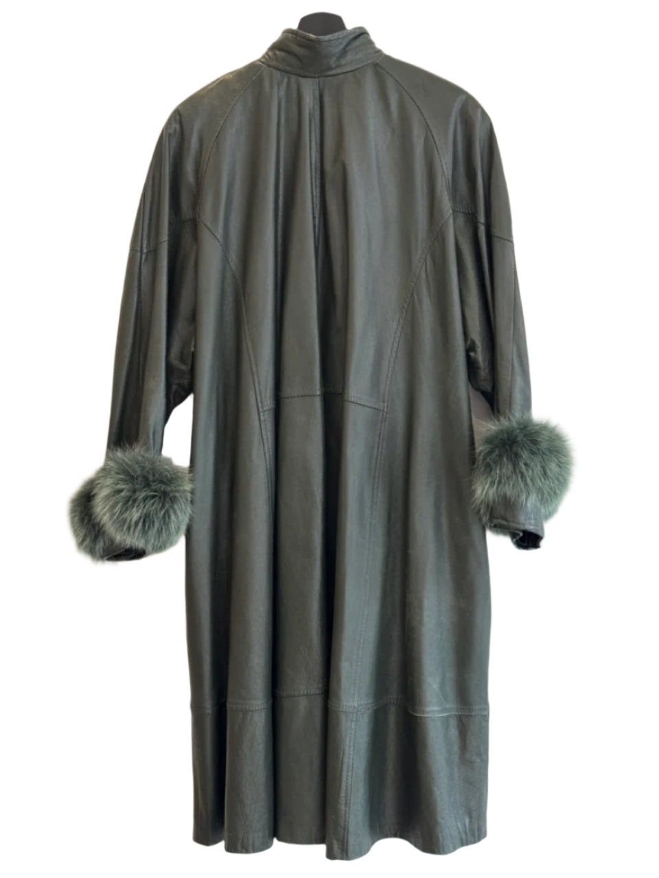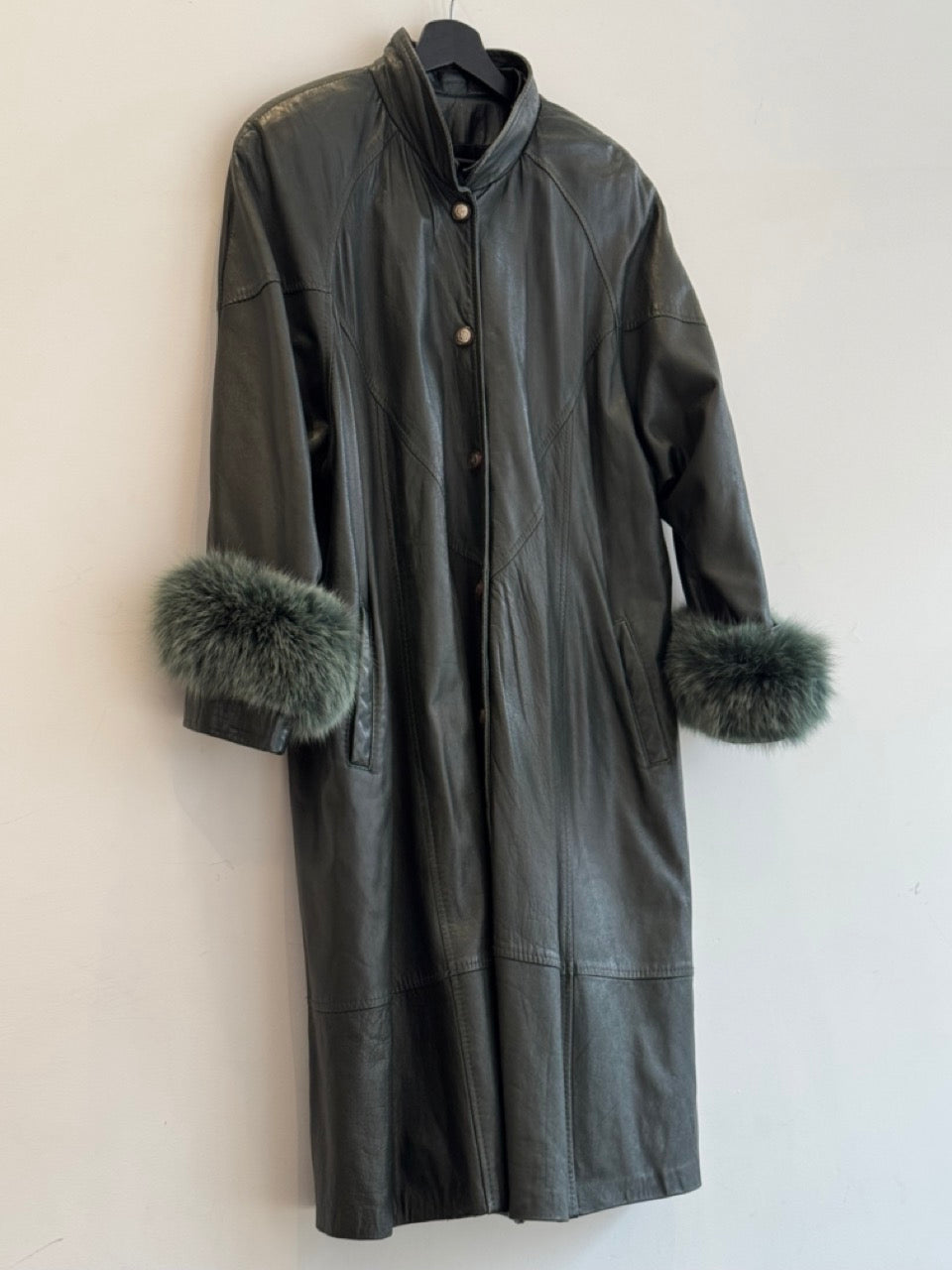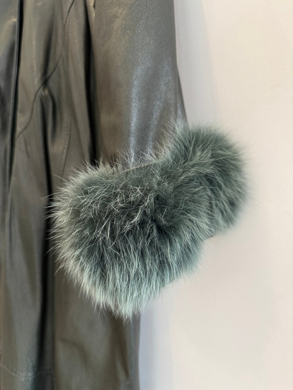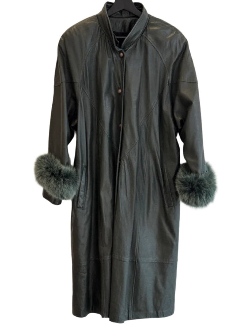 Vintage Green Leather Coat with Fox Fur Cuffs