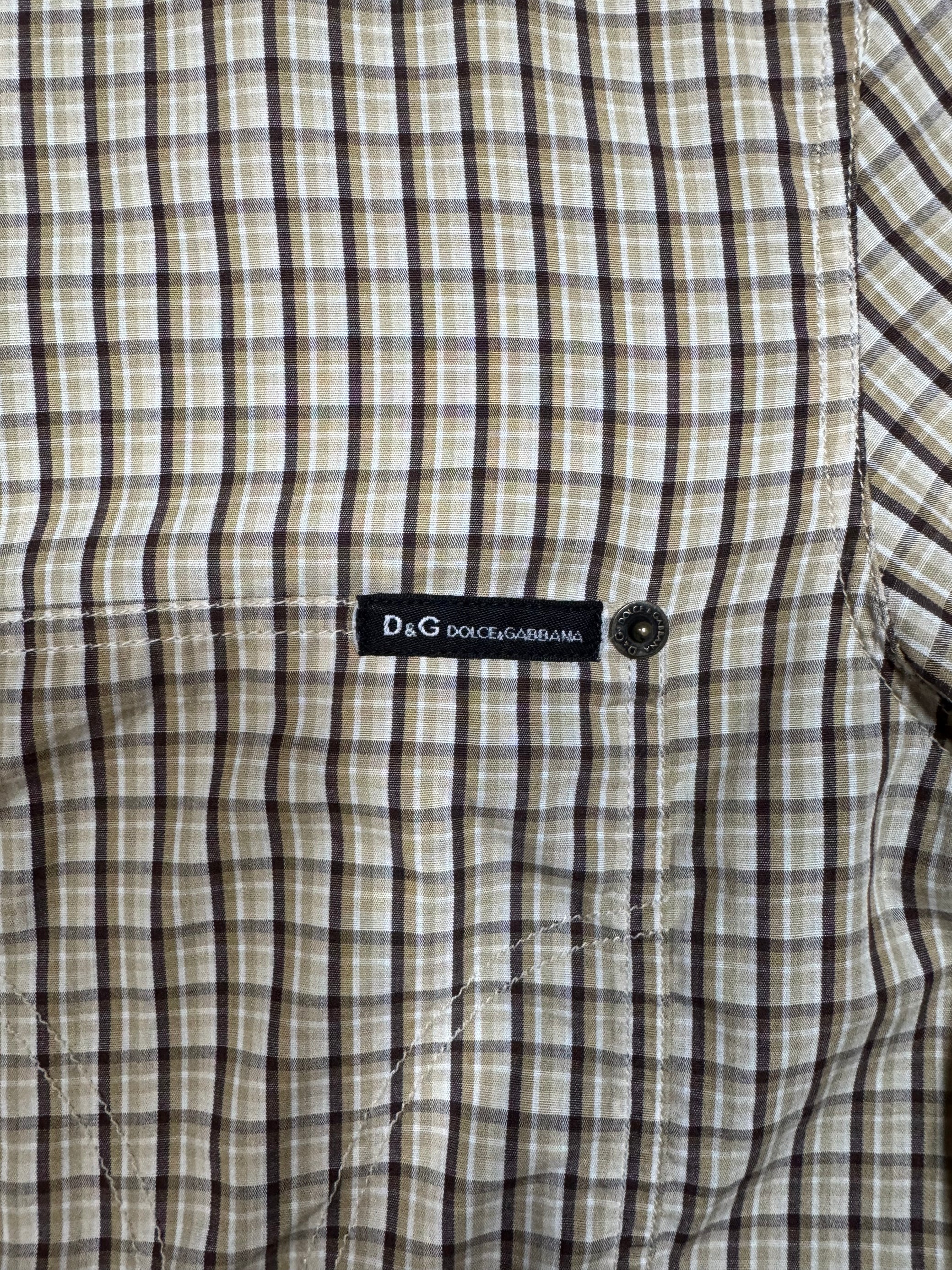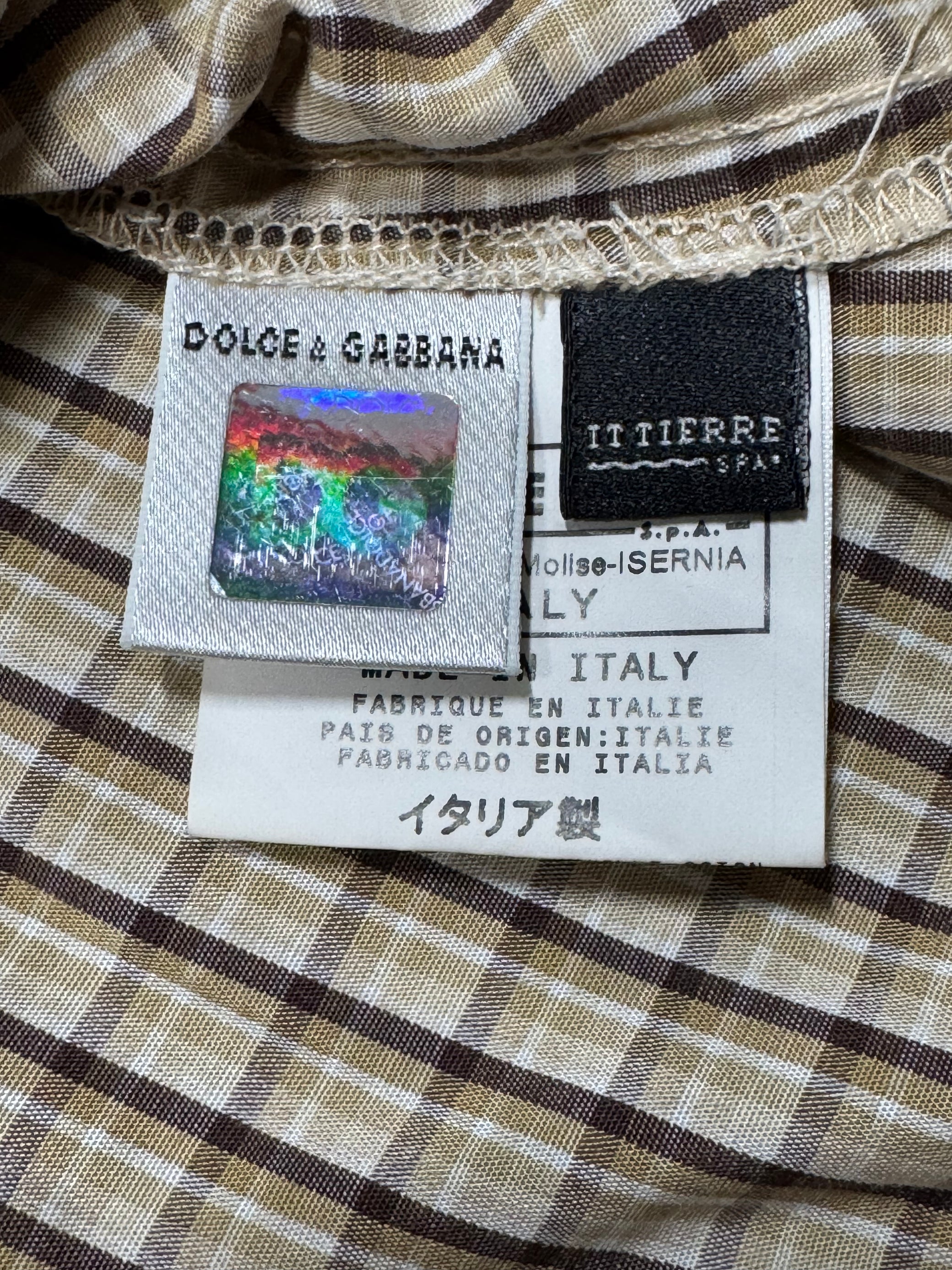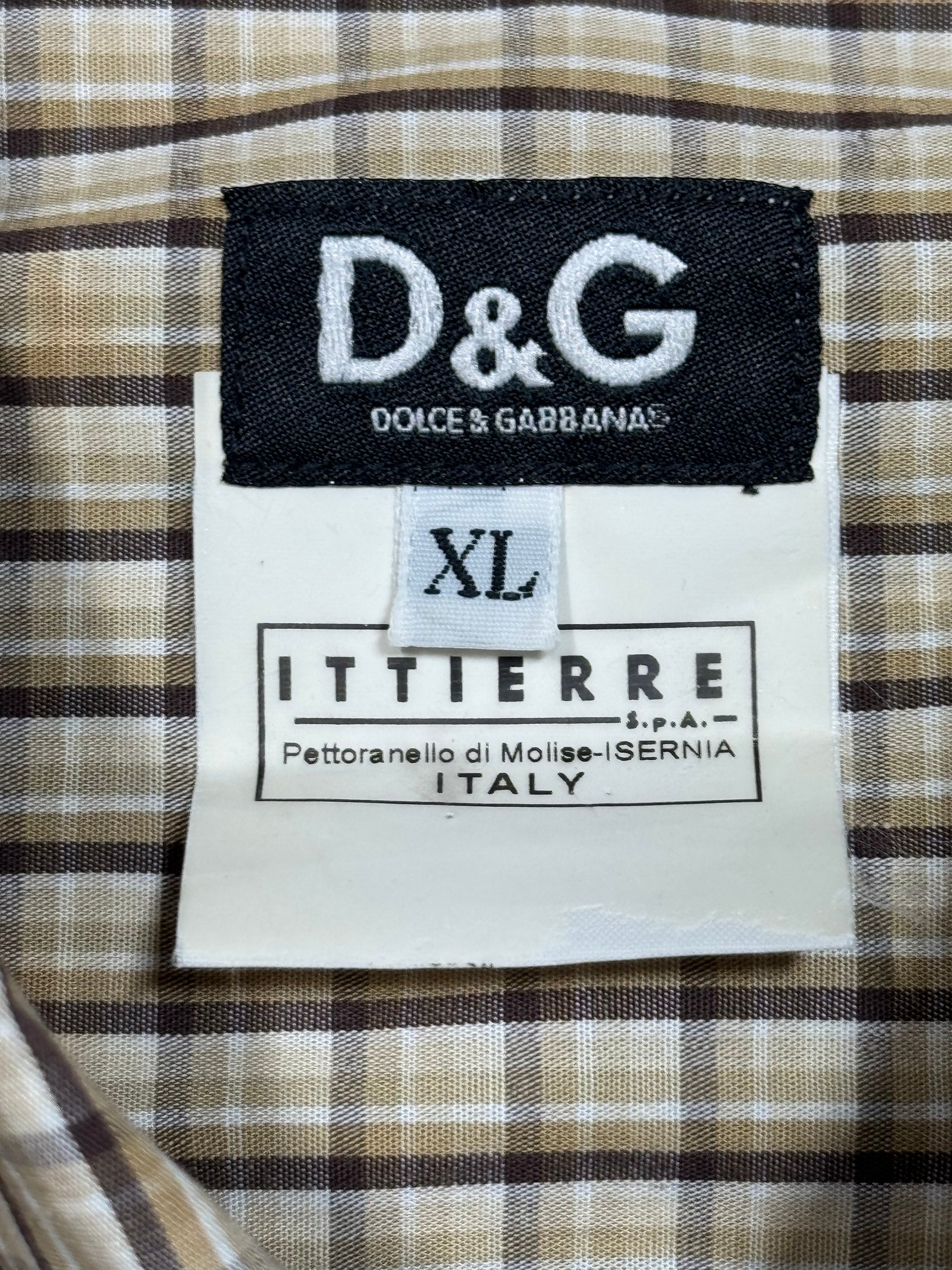 A lightweight plaid shirt from the early 2000s D&G era, produced under Ittierre S.p.A. in Italy. The piece features the brand’s signature era-defining details: a neutral beige-brown check pattern, embroidered logo patching, and an interior metal D&G plaque—an unmistakable hallmark of the label’s 2000s aesthetic.