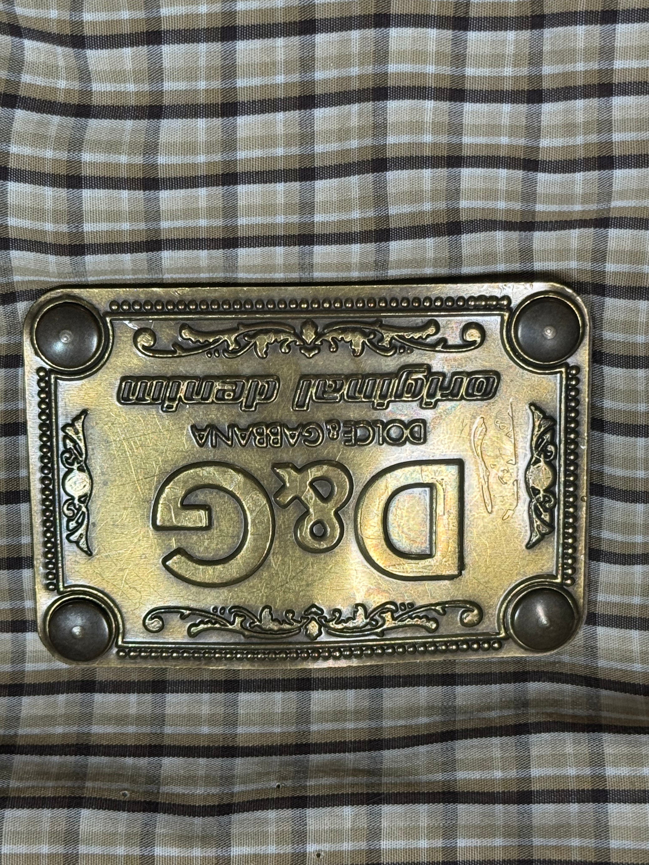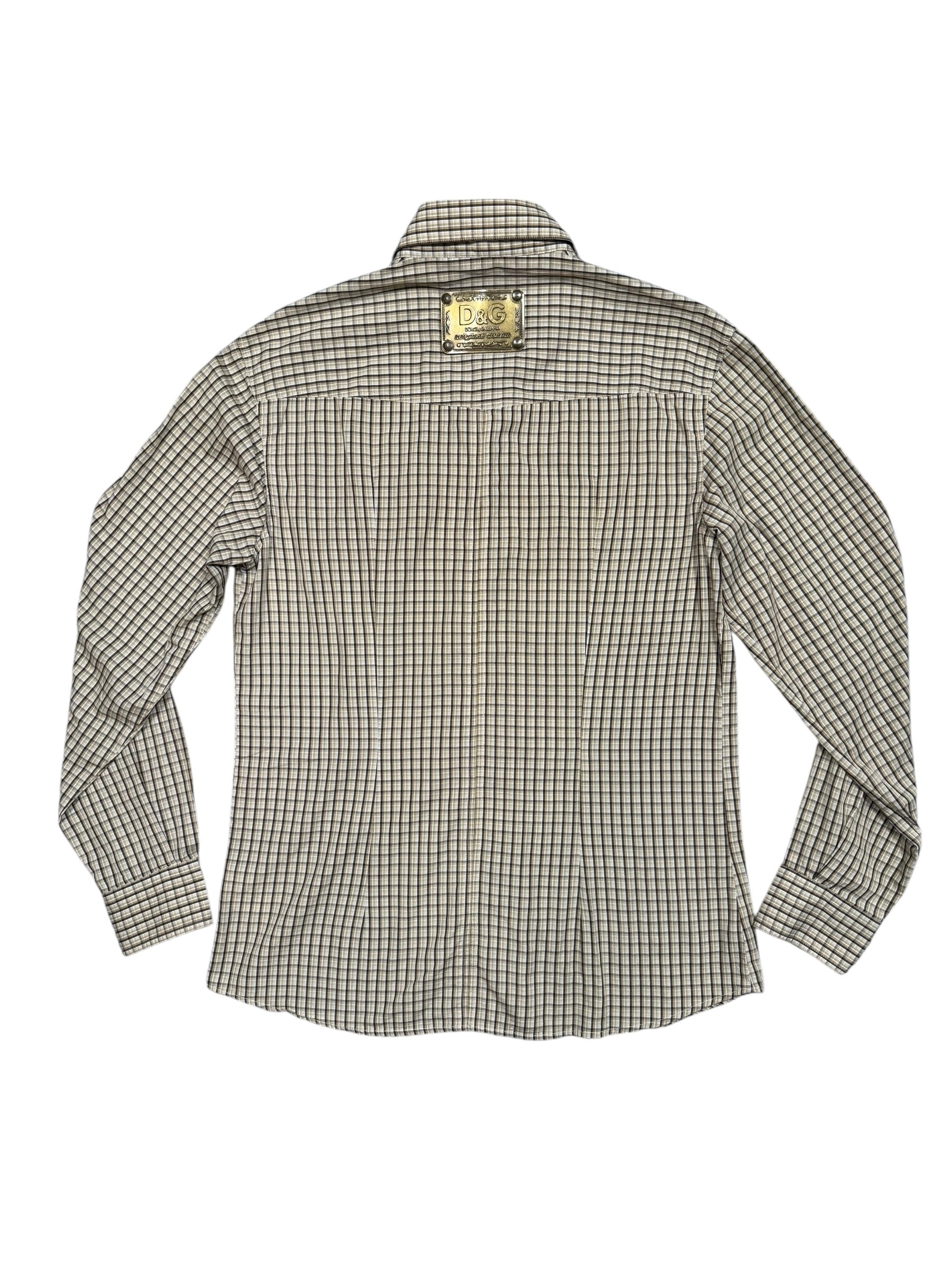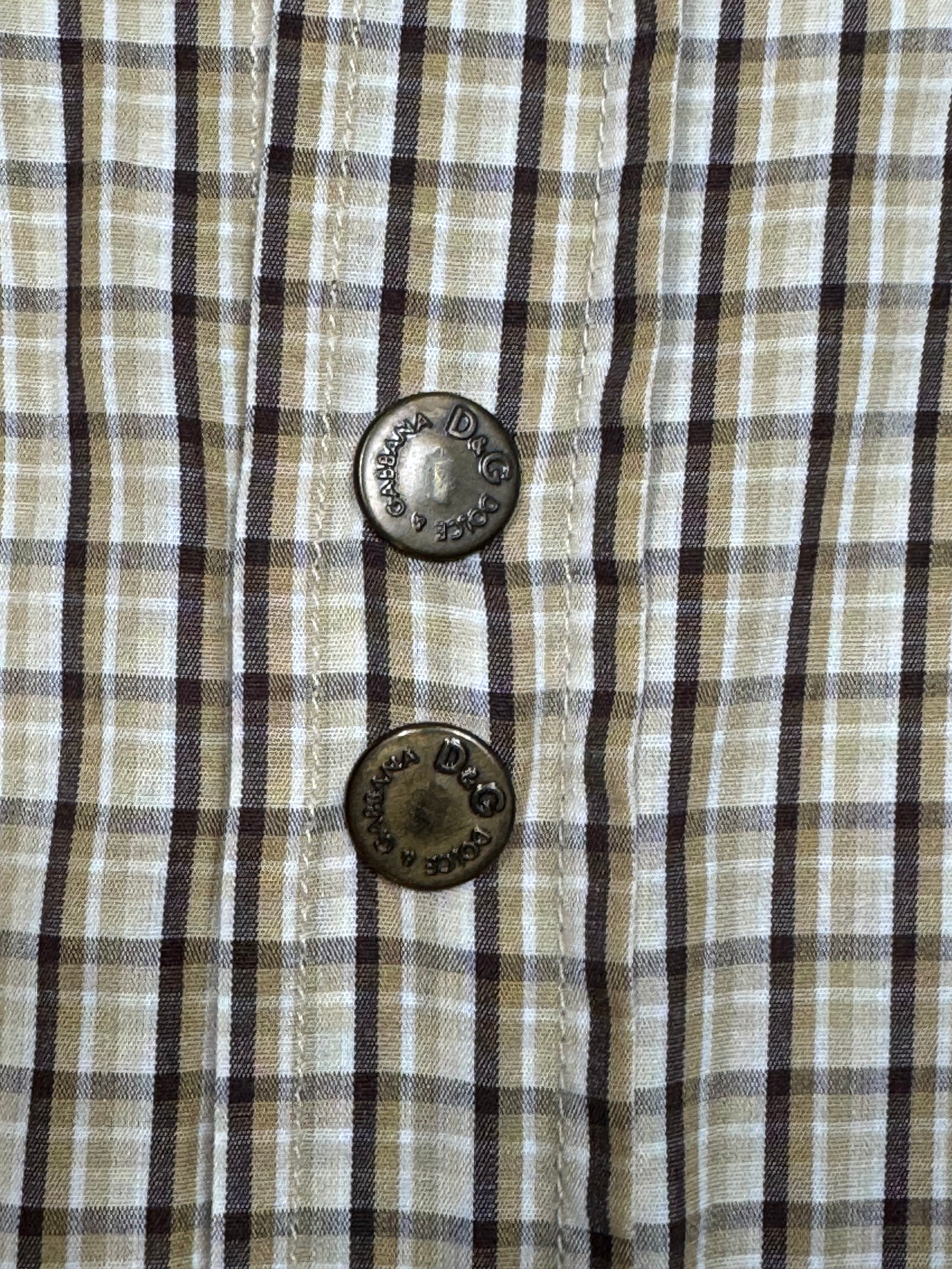 A lightweight plaid shirt from the early 2000s D&G era, produced under Ittierre S.p.A. in Italy. The piece features the brand’s signature era-defining details: a neutral beige-brown check pattern, embroidered logo patching, and an interior metal D&G plaque—an unmistakable hallmark of the label’s 2000s aesthetic.