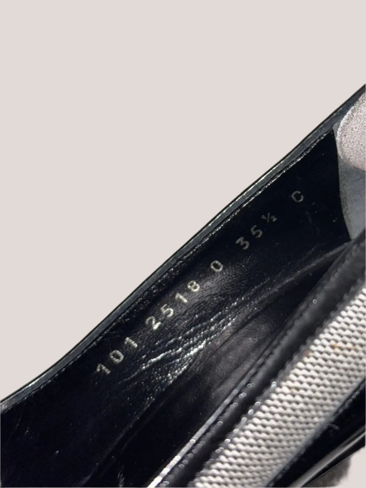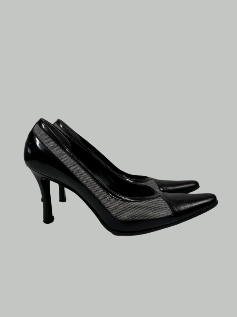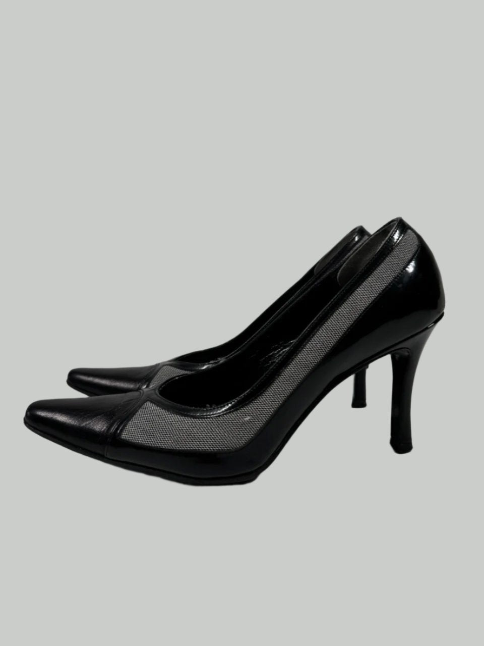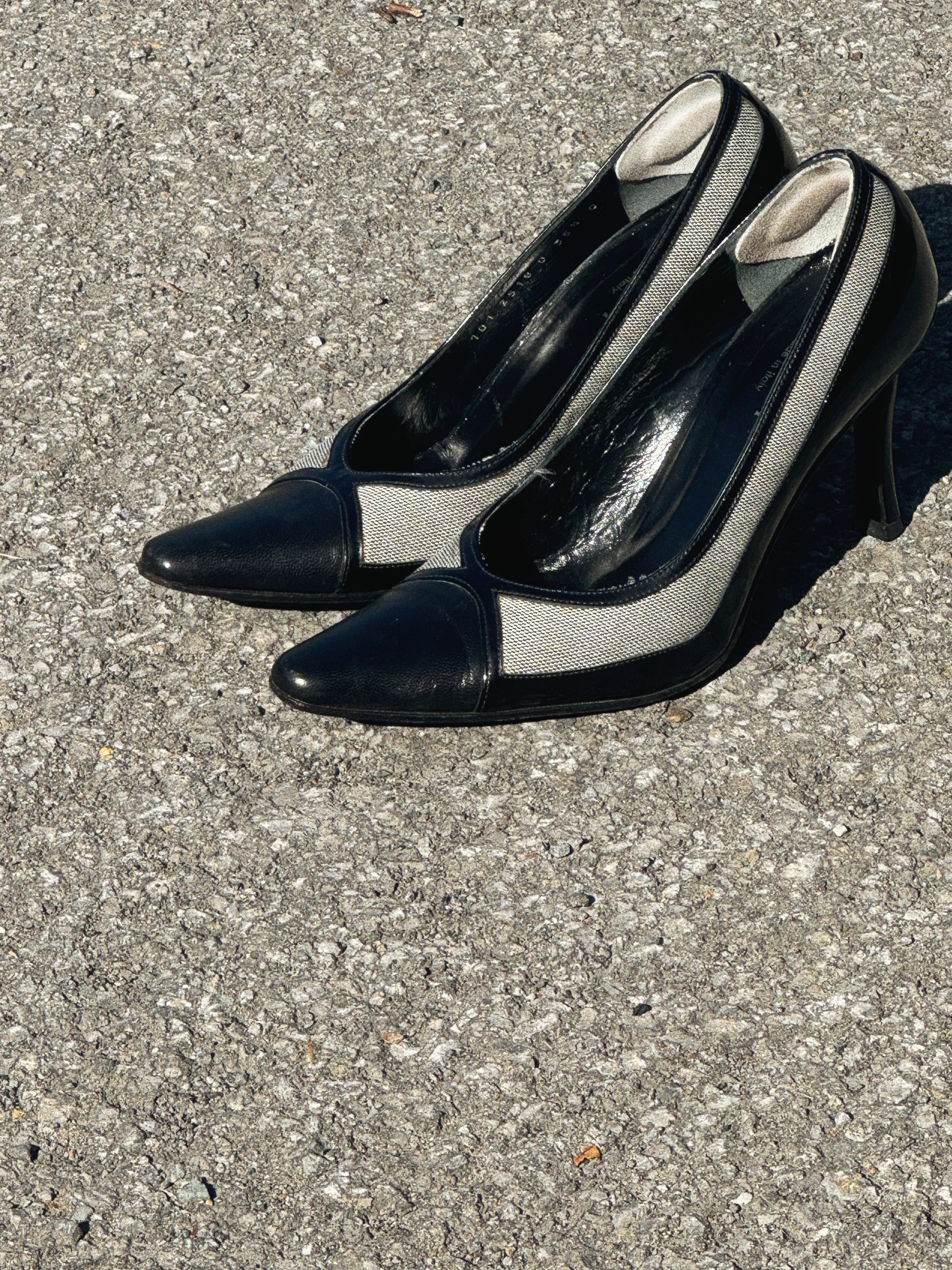 + Canvas heels in dark navy blue, with leather toe detail and patent leather trim and heel.