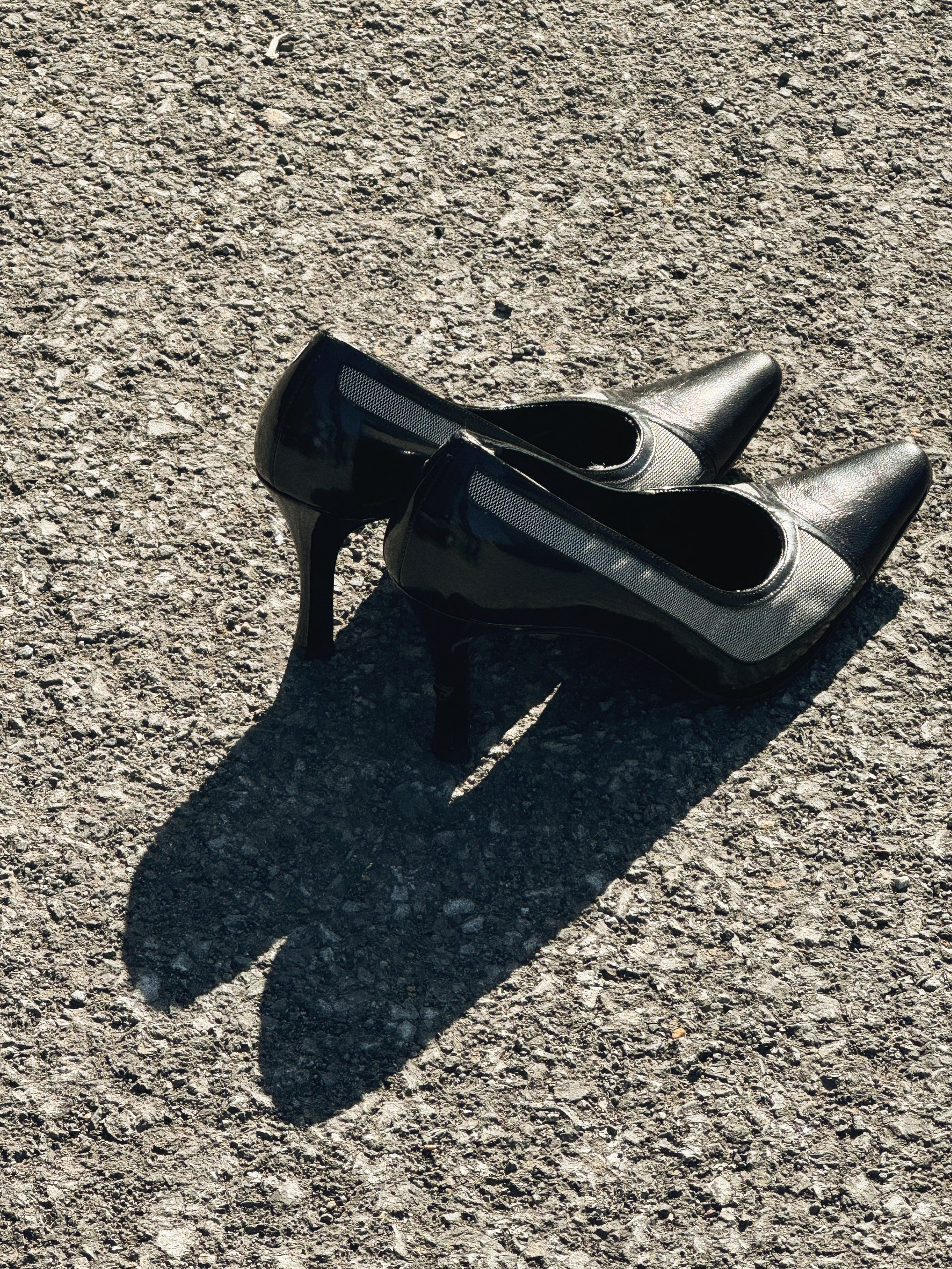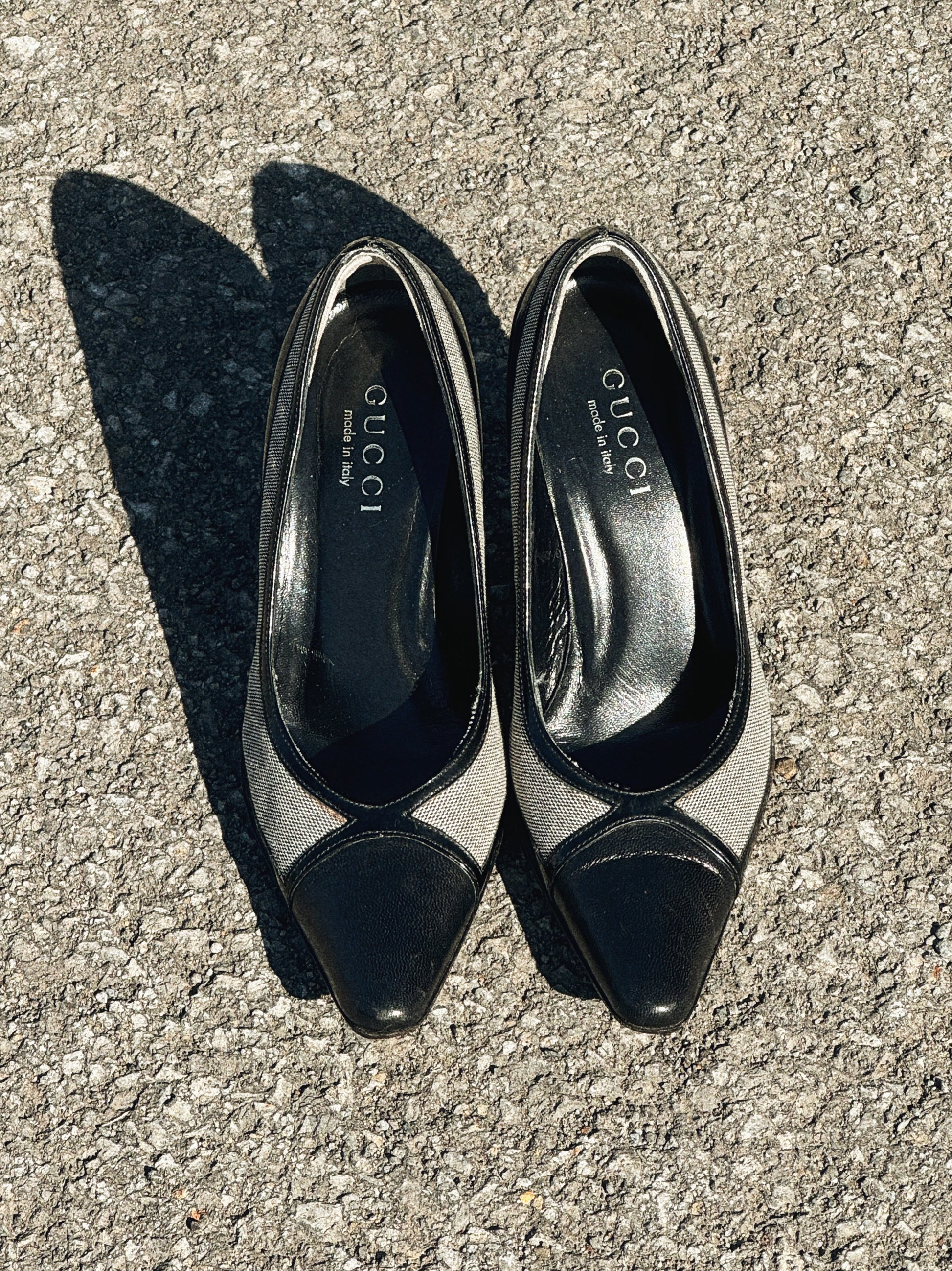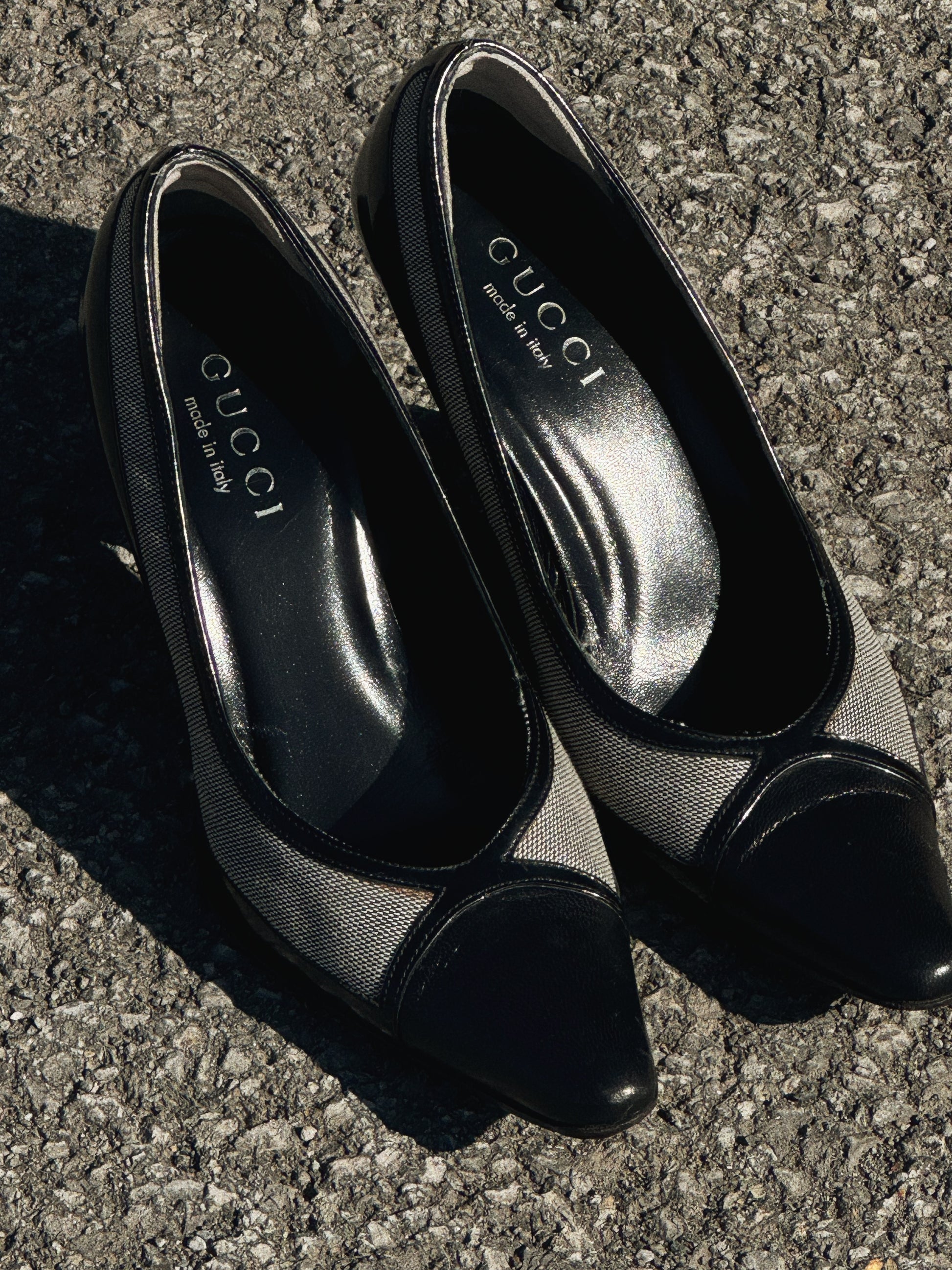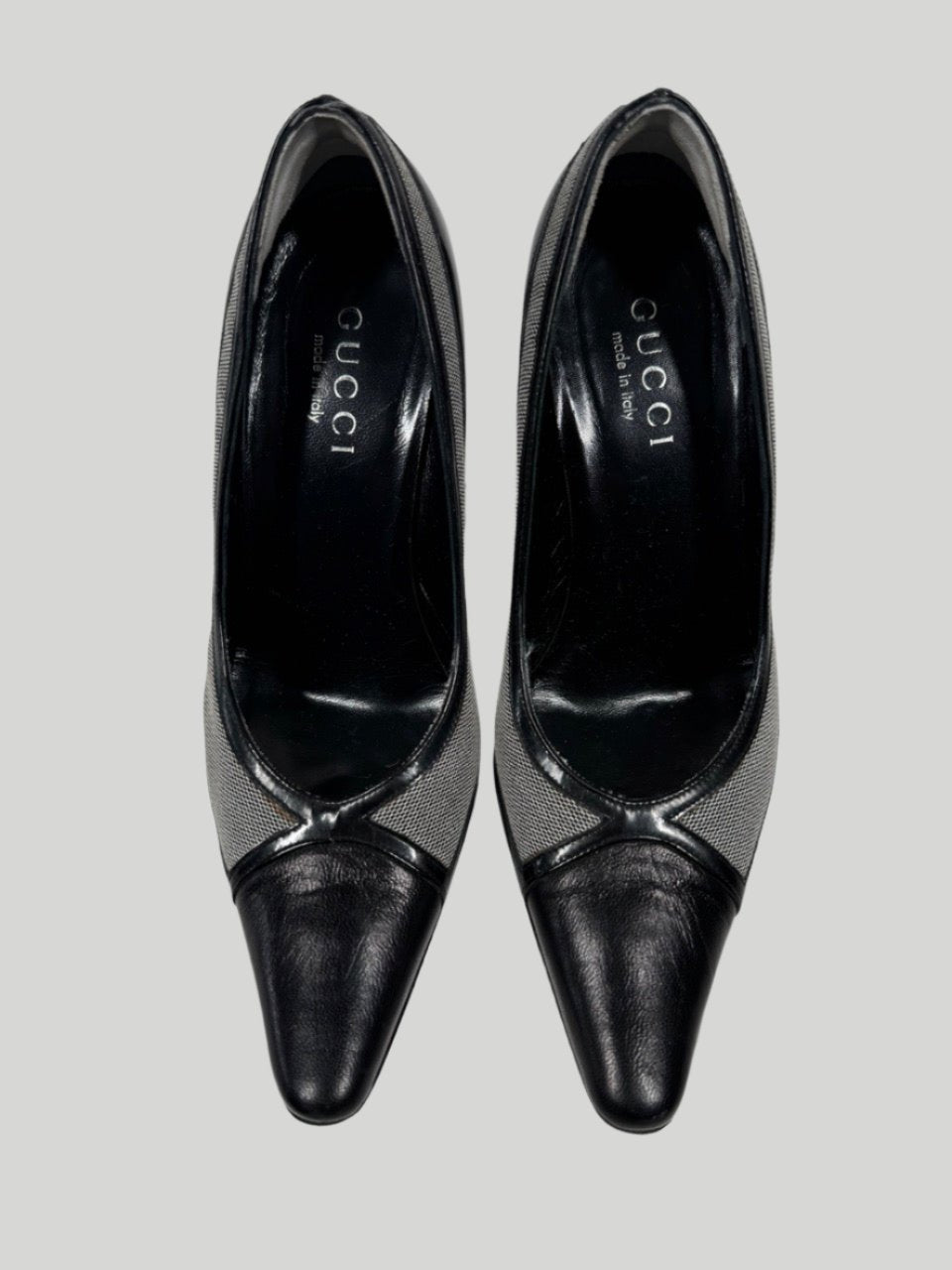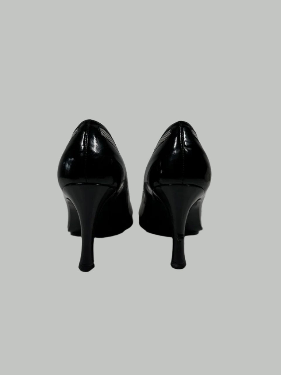 + Canvas heels in dark navy blue, with leather toe detail and patent leather trim and heel.