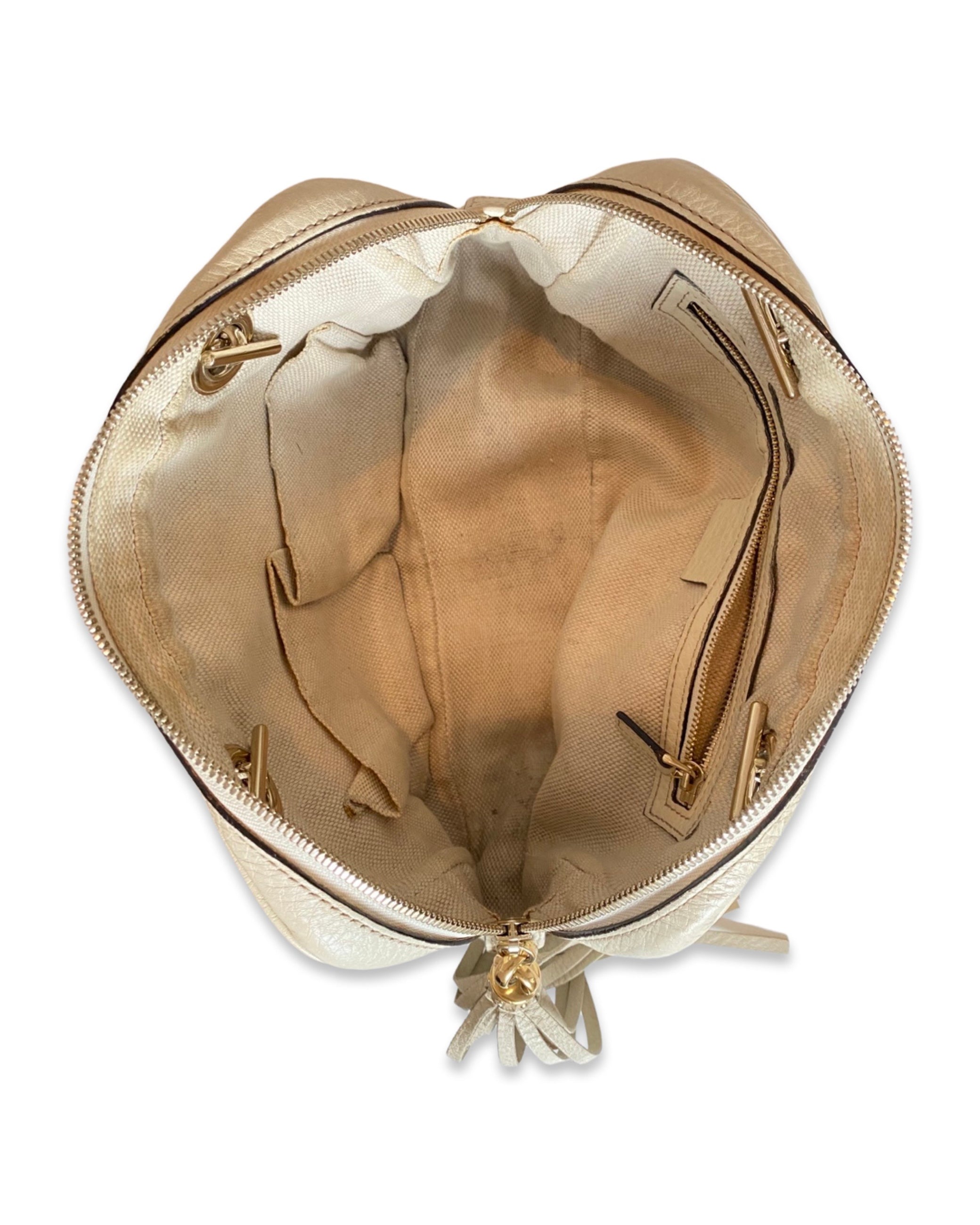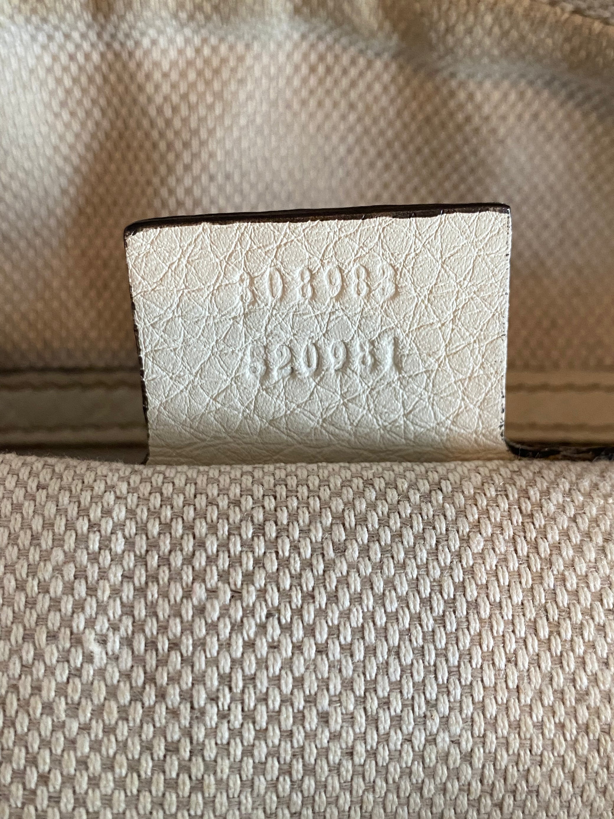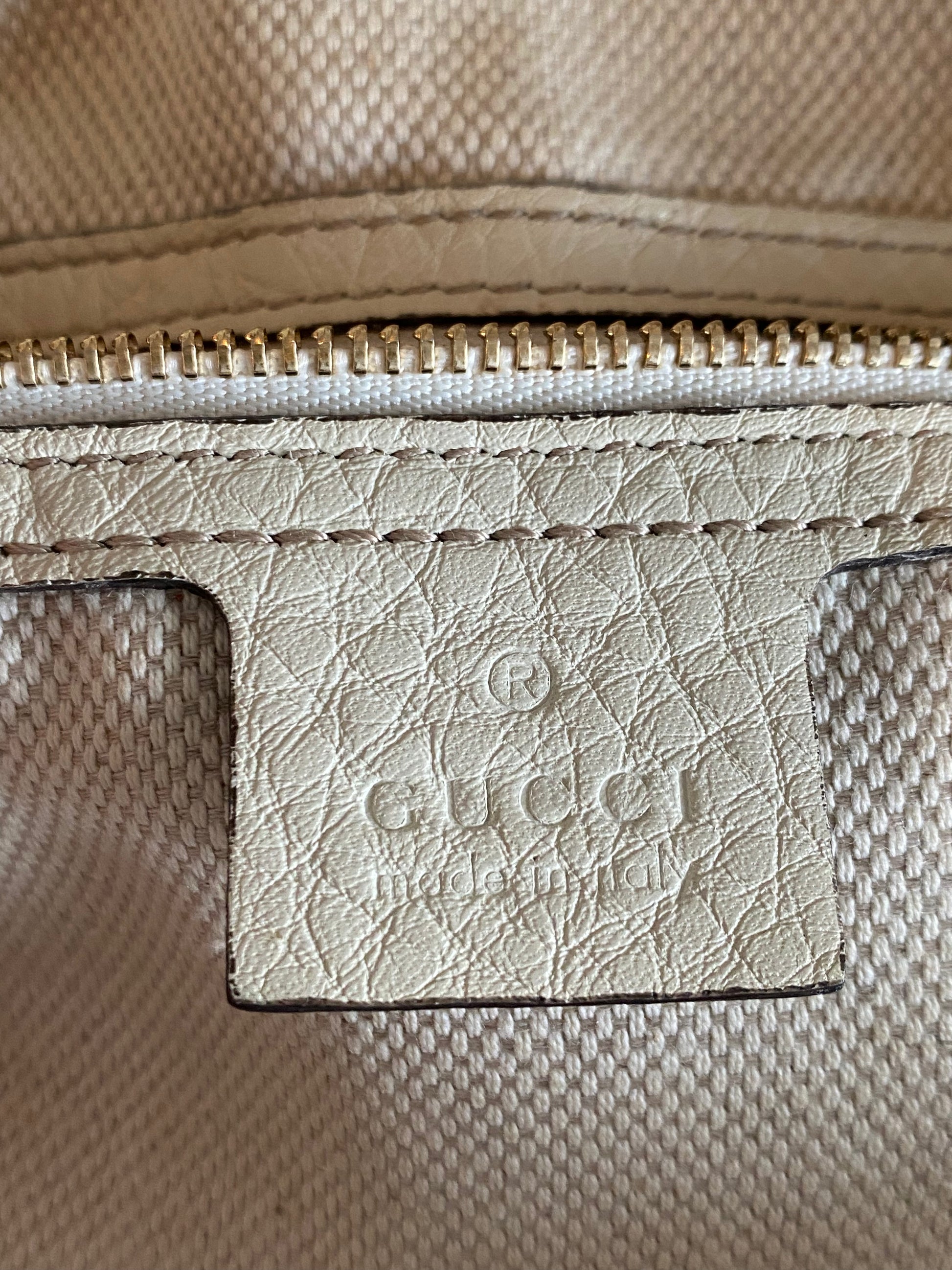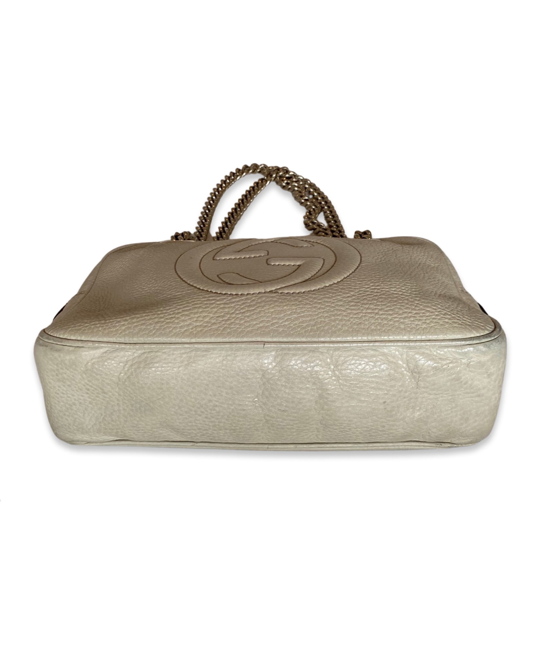 + Gucci Soho front logo, chain shoulder strap, pebbled leather.