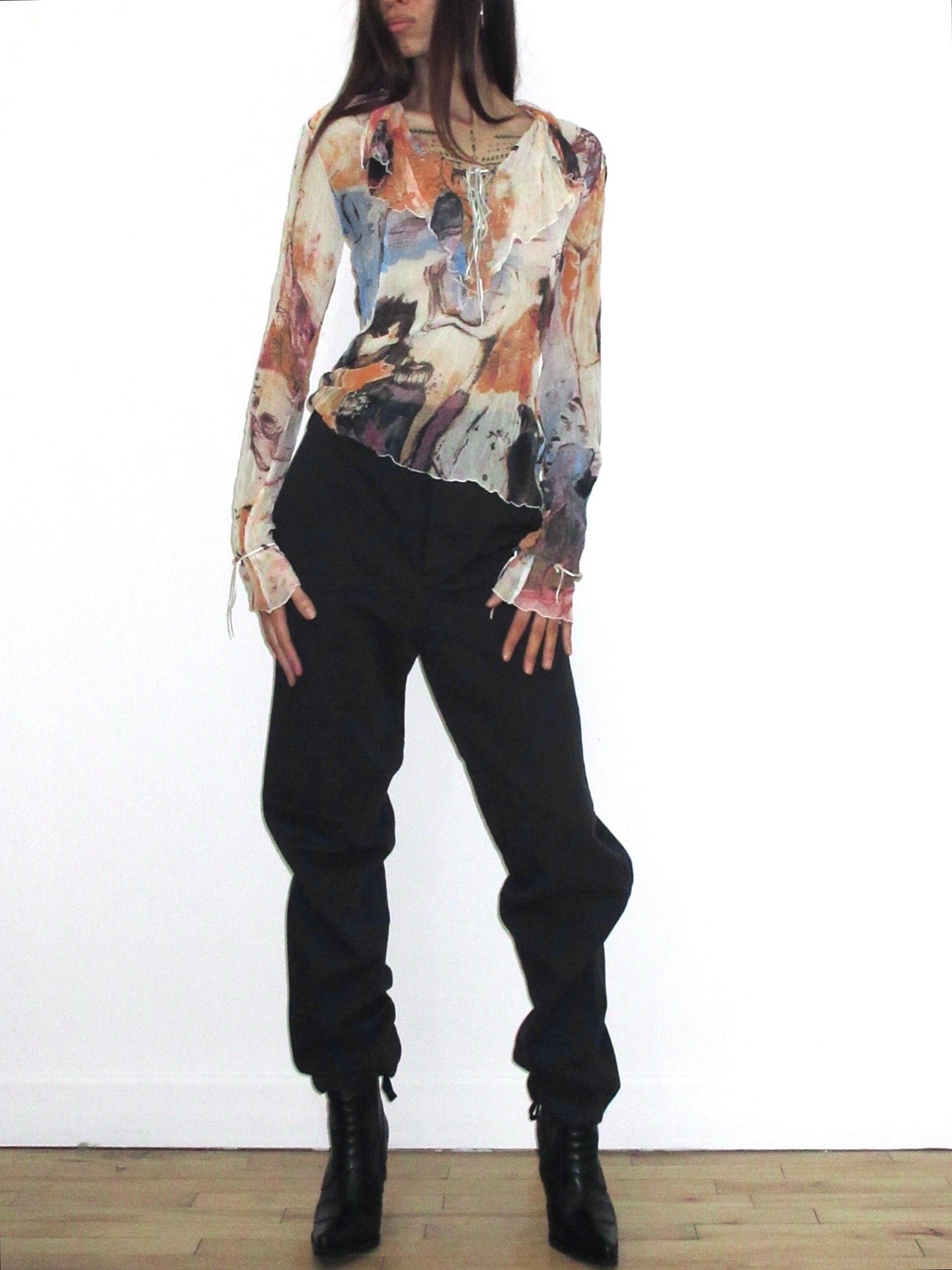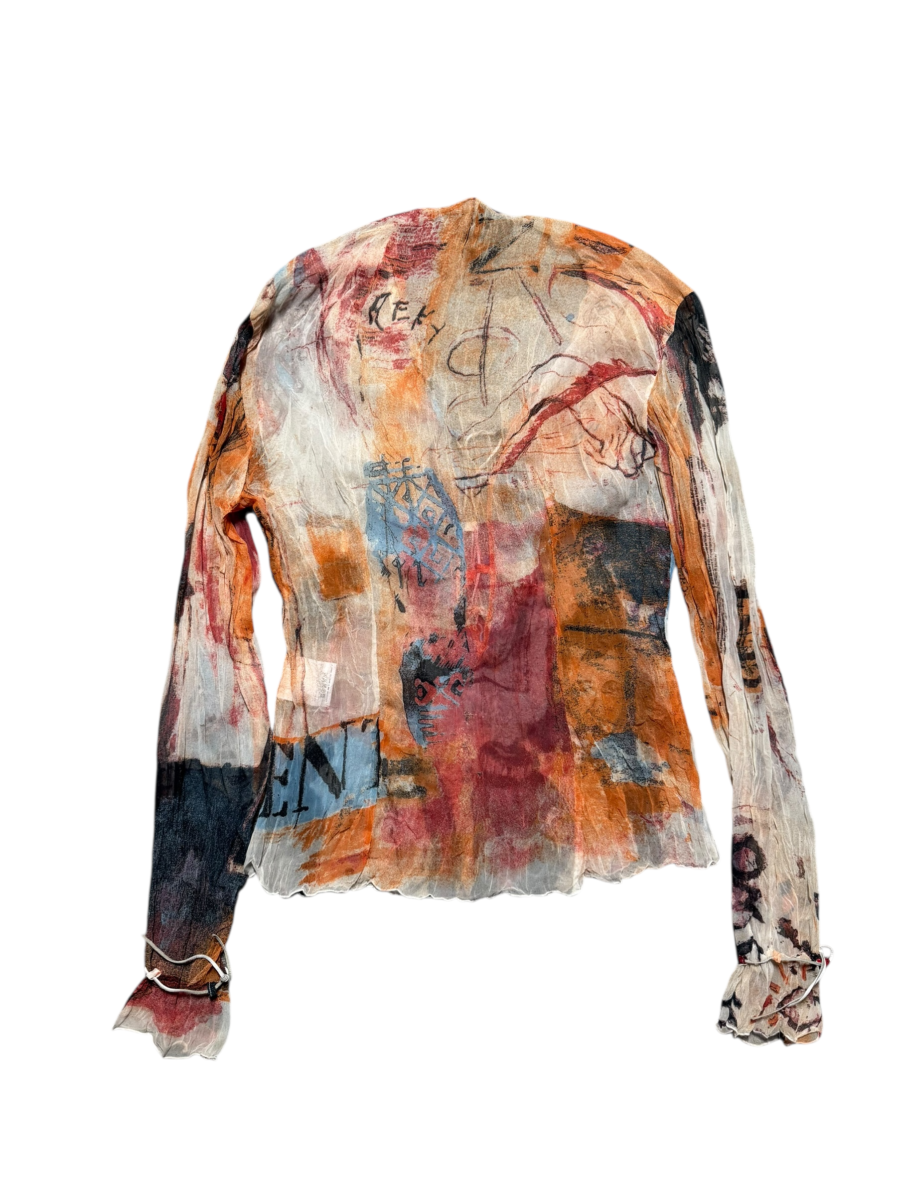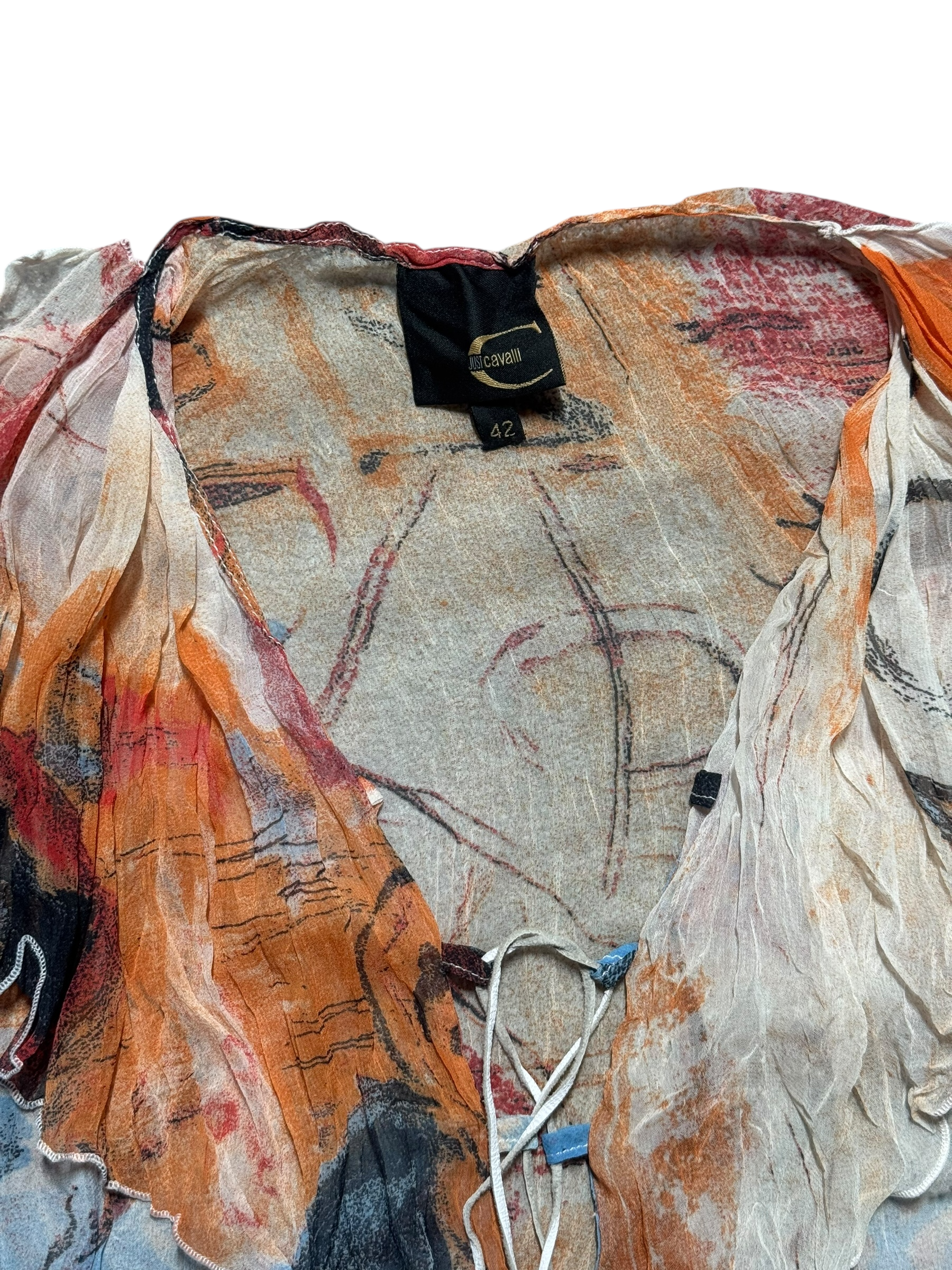 A striking archival piece from the early 2000s Just Cavalli line, produced under ITTIERRE S.p.A. in Italy. This sheer printed top captures the bold, artistic energy synonymous with Roberto Cavalli’s sub-label during this era — known for experimental prints, romantic silhouettes, and a rebellious take on femininity.