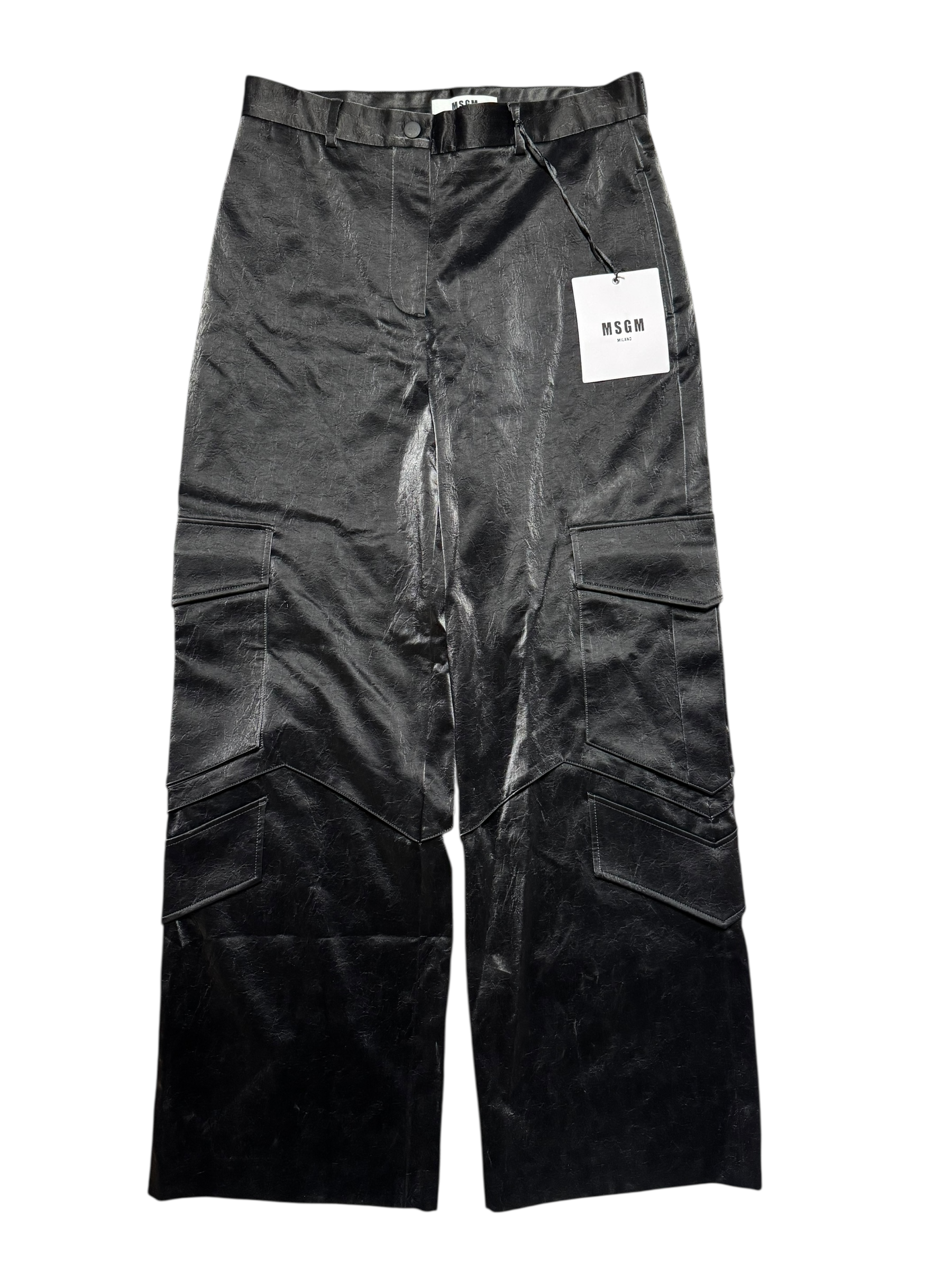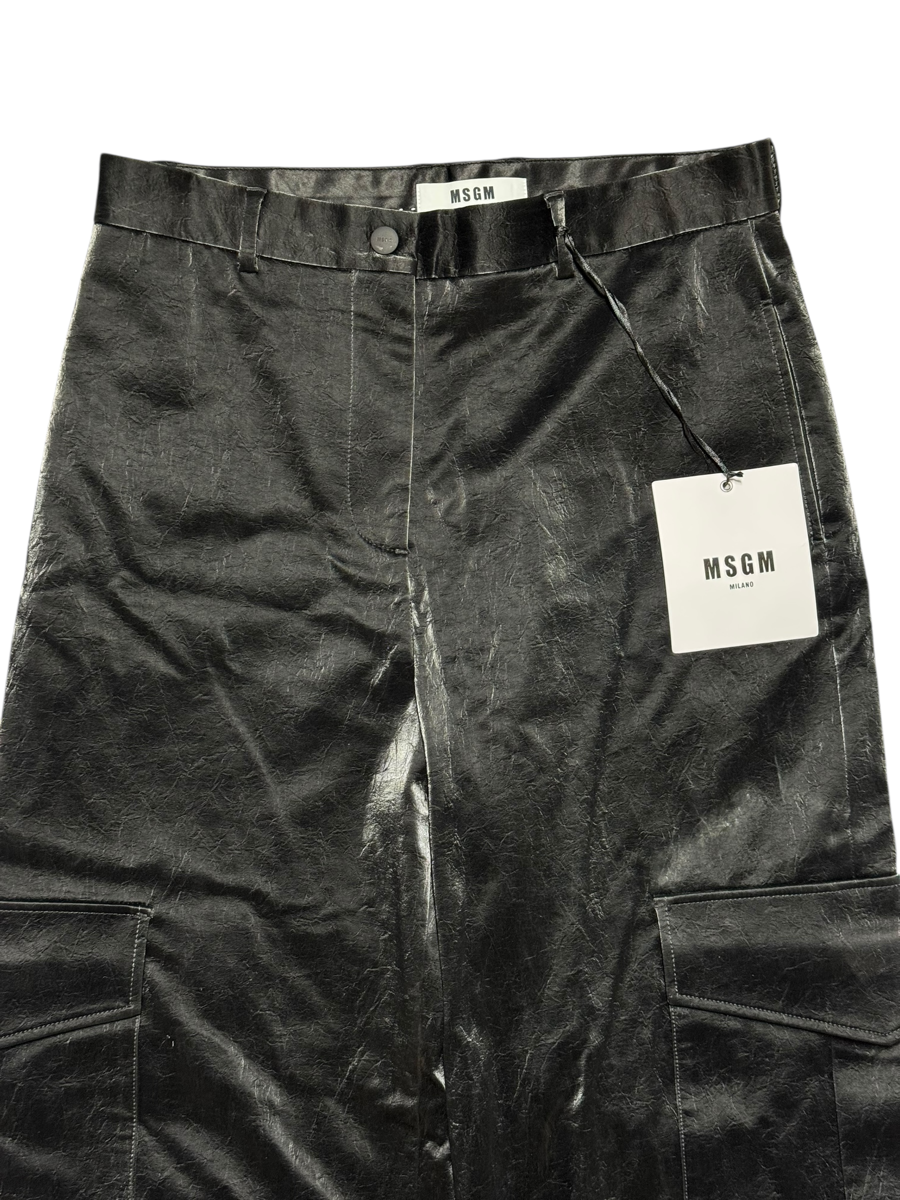 A statement reinterpretation of utilitarian design, these MSGM pants reflect the brand’s experimental approach to texture and proportion. Made in Italy, they feature a coated finish with a subtle crinkled effect that mimics the appearance of waxed leather. The silhouette is structured with oversized cargo pockets, straight legs, and a high waist for a refined yet directional edge.