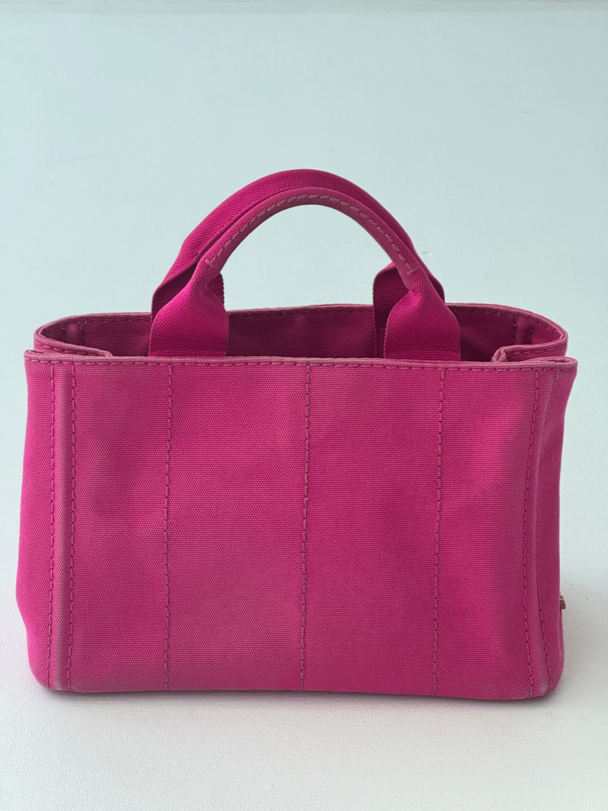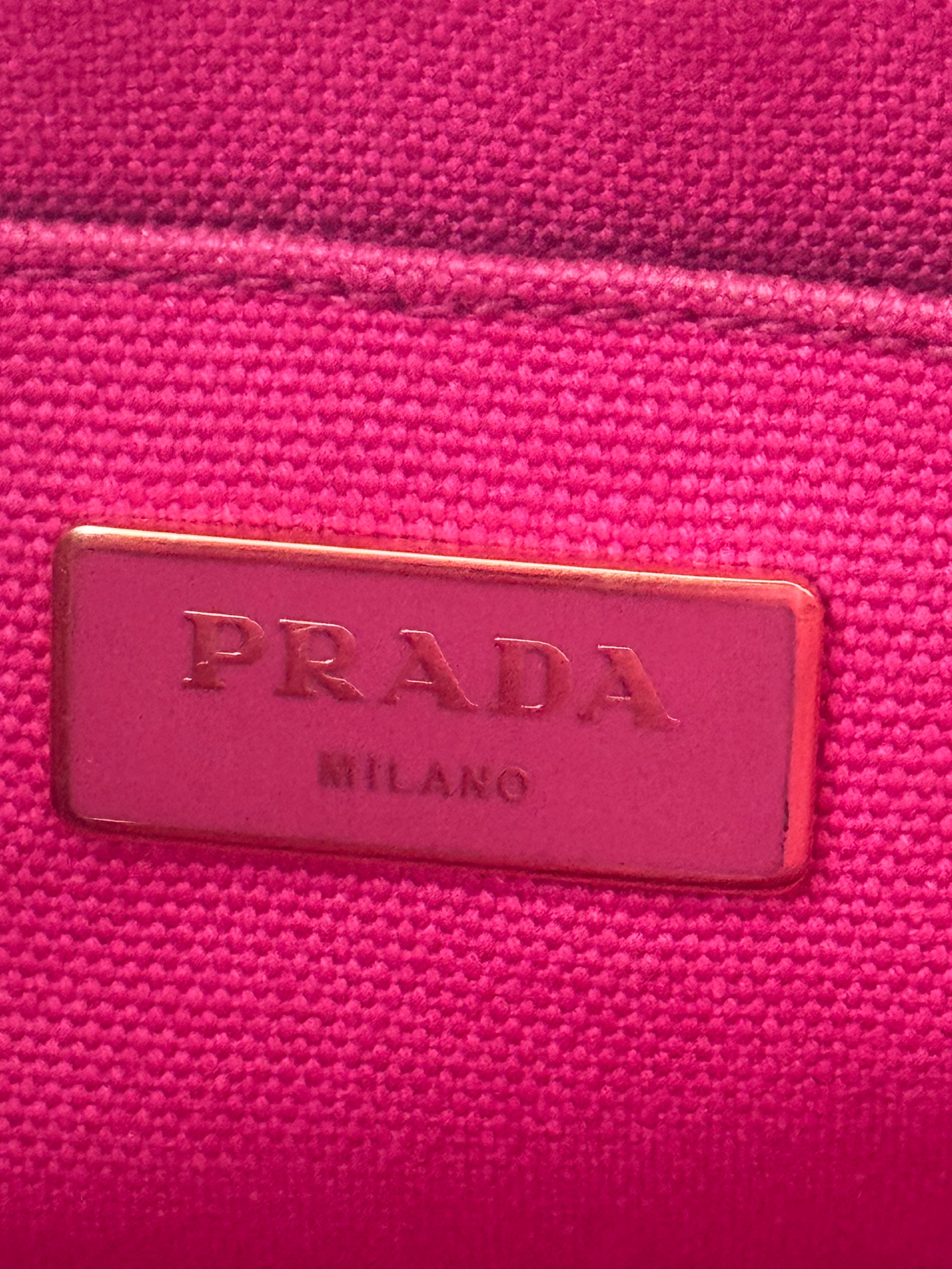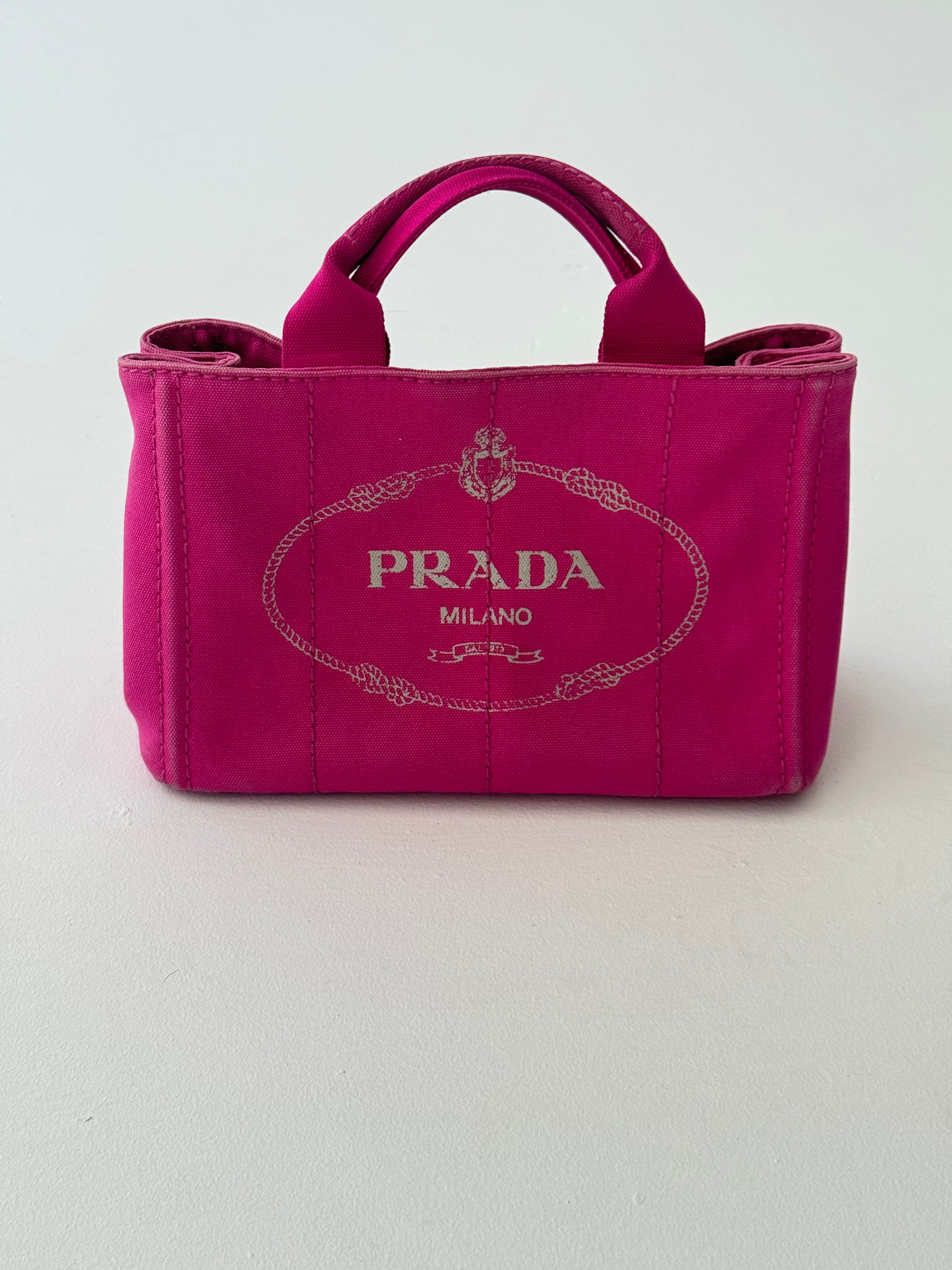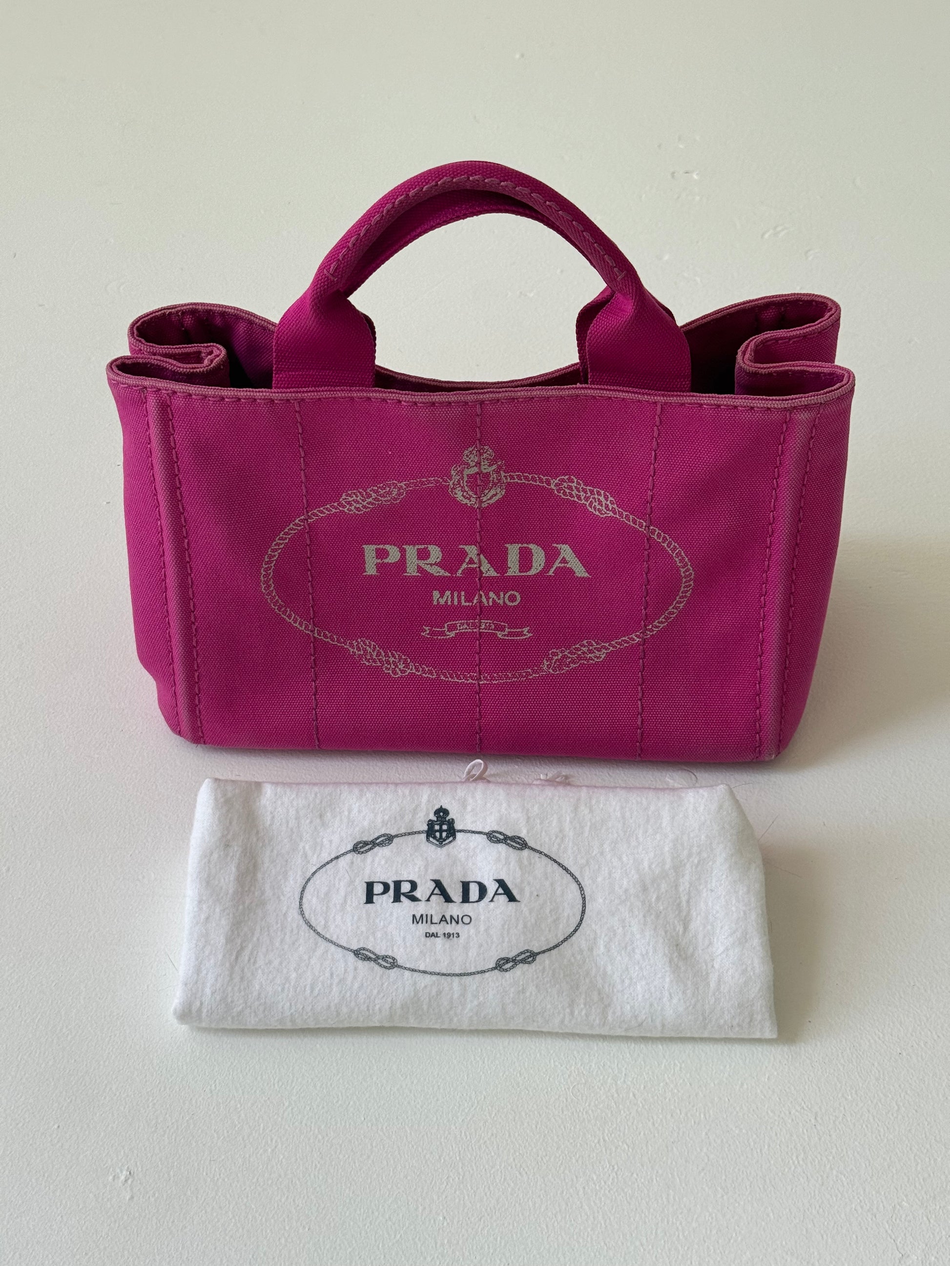 + Mini Prada Canapa tote in canvas material, featuring printed logo at front and logo plaque on side. Comes with original dust bag.