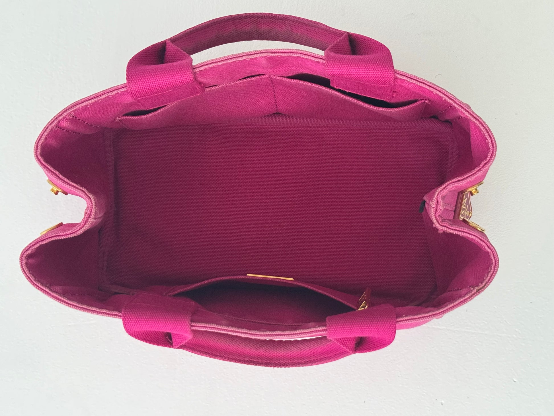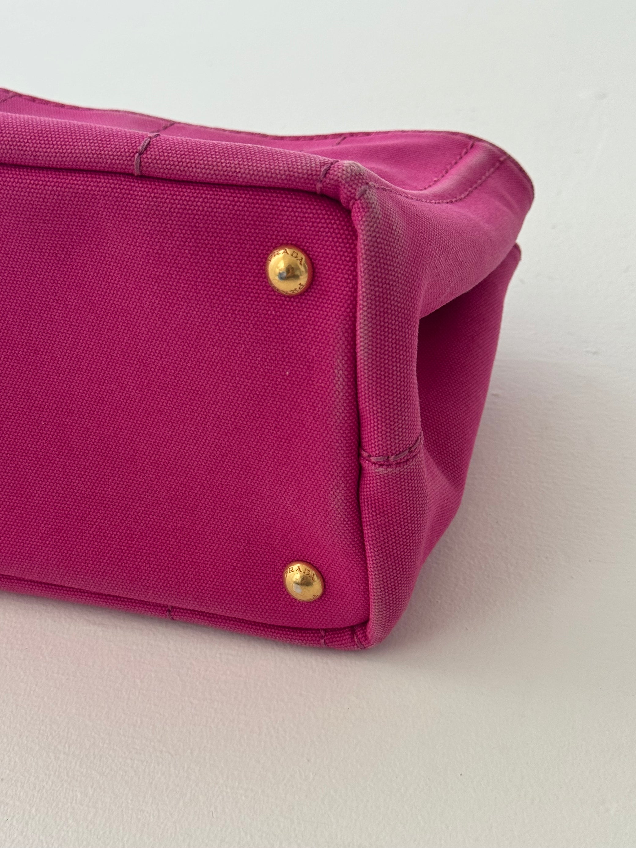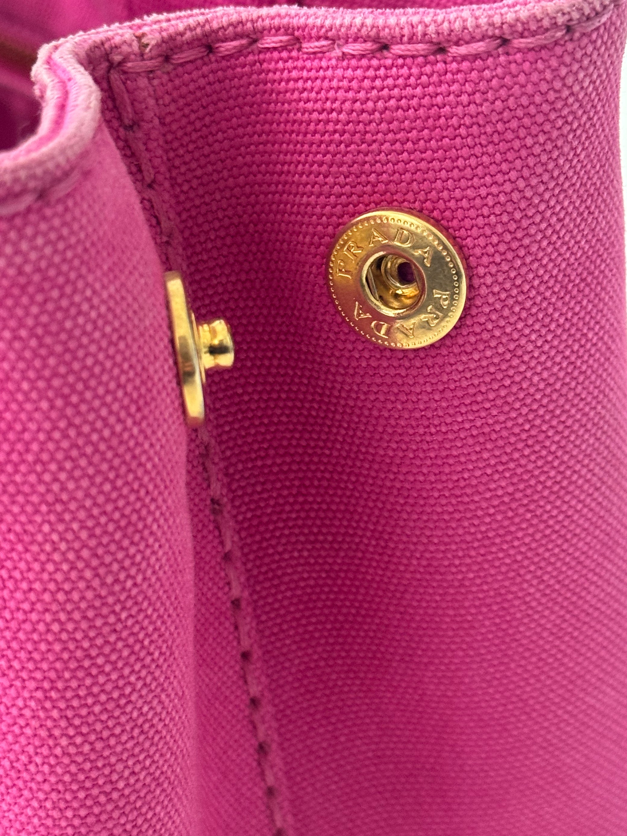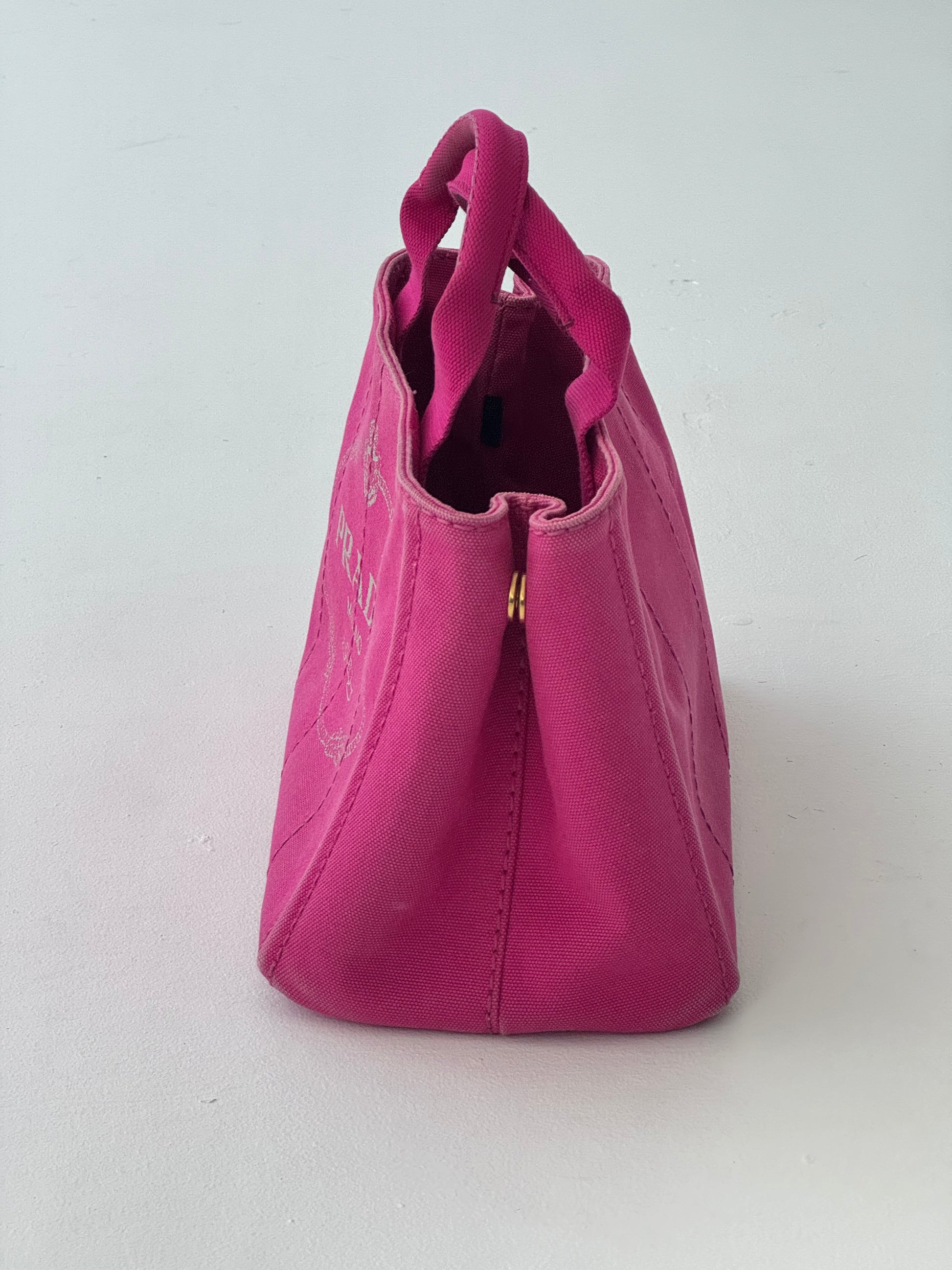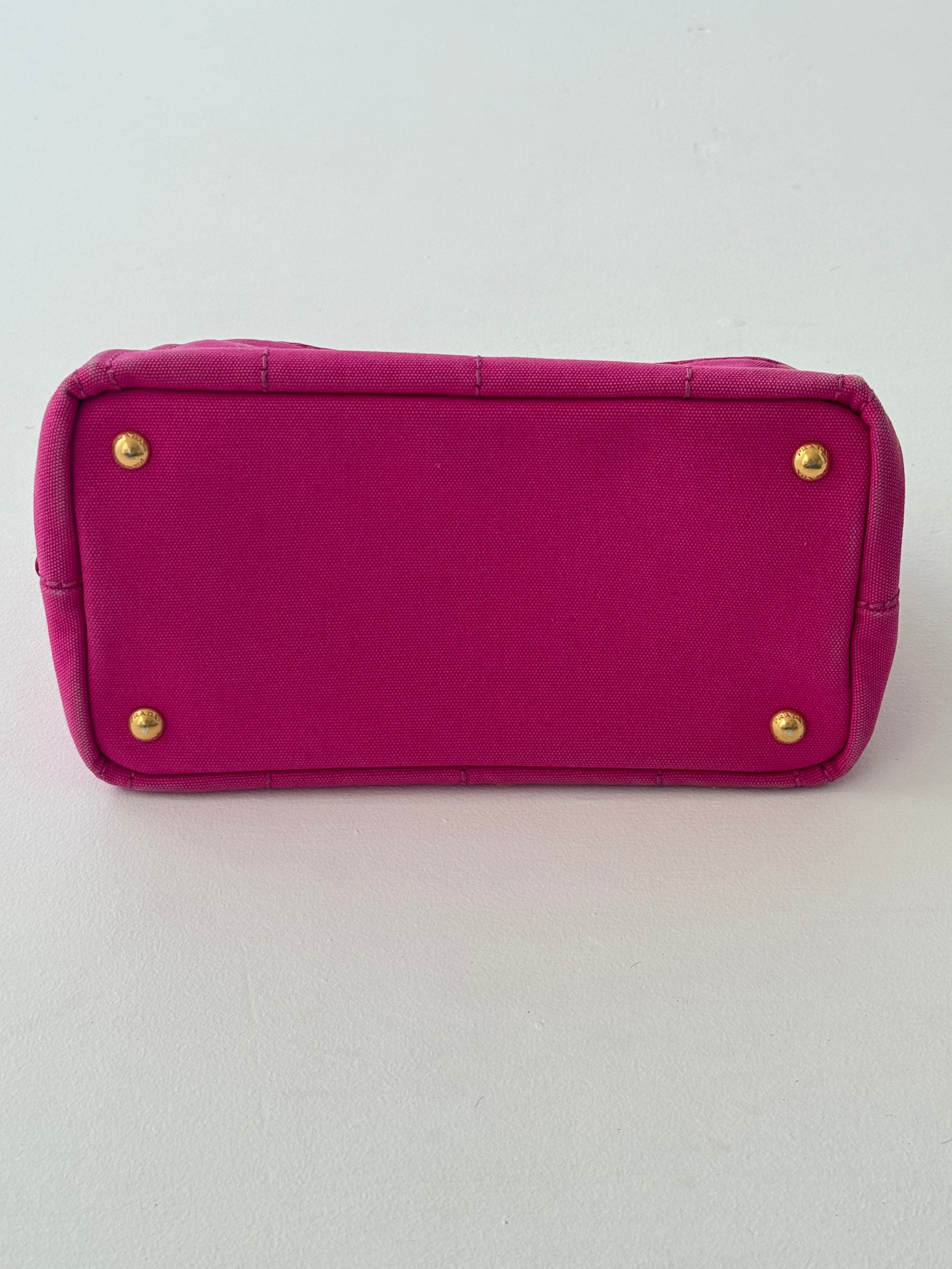 + Mini Prada Canapa tote in canvas material, featuring printed logo at front and logo plaque on side. Comes with original dust bag.
