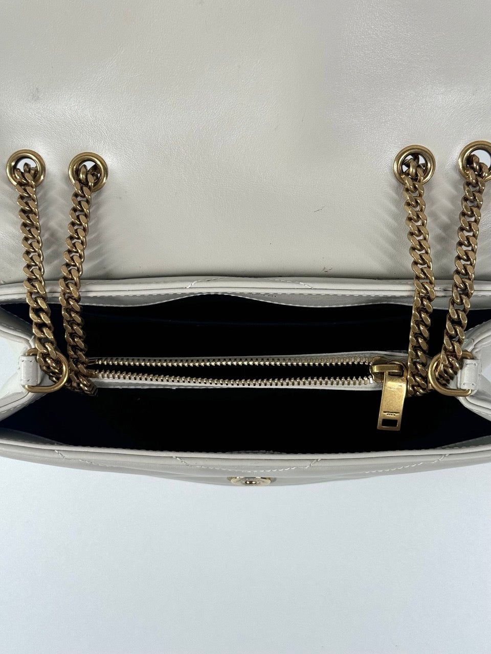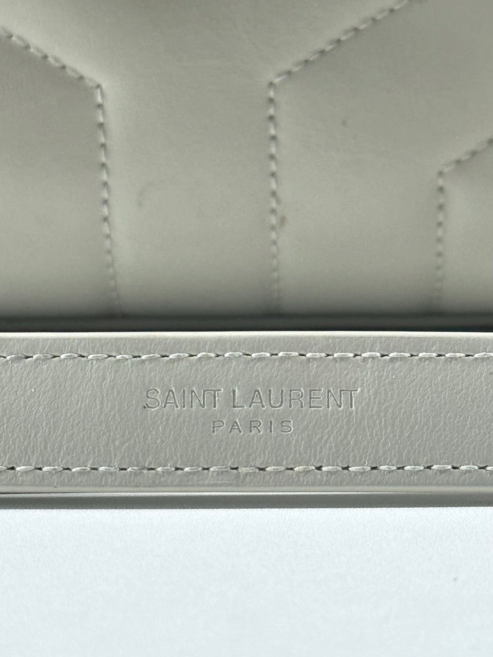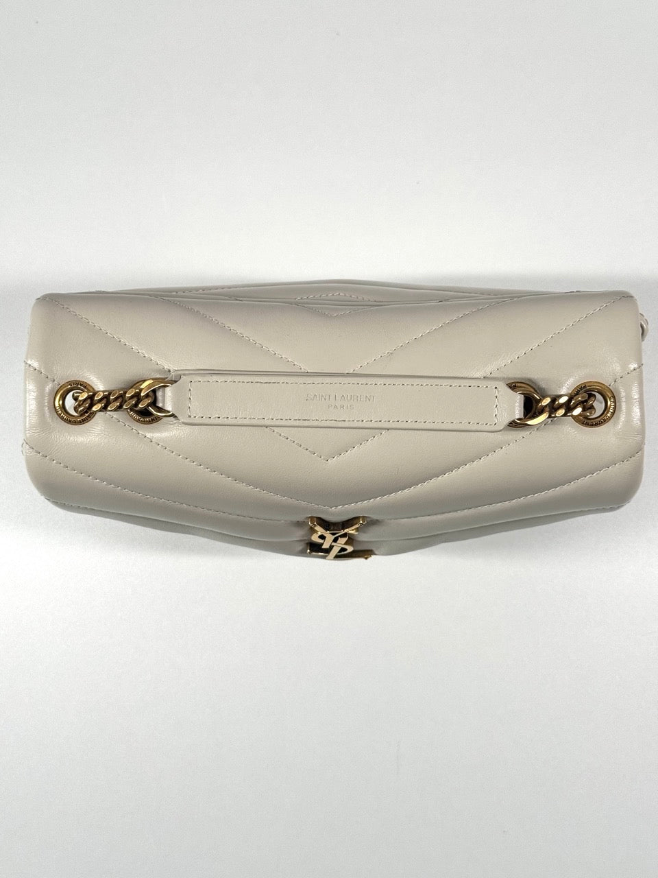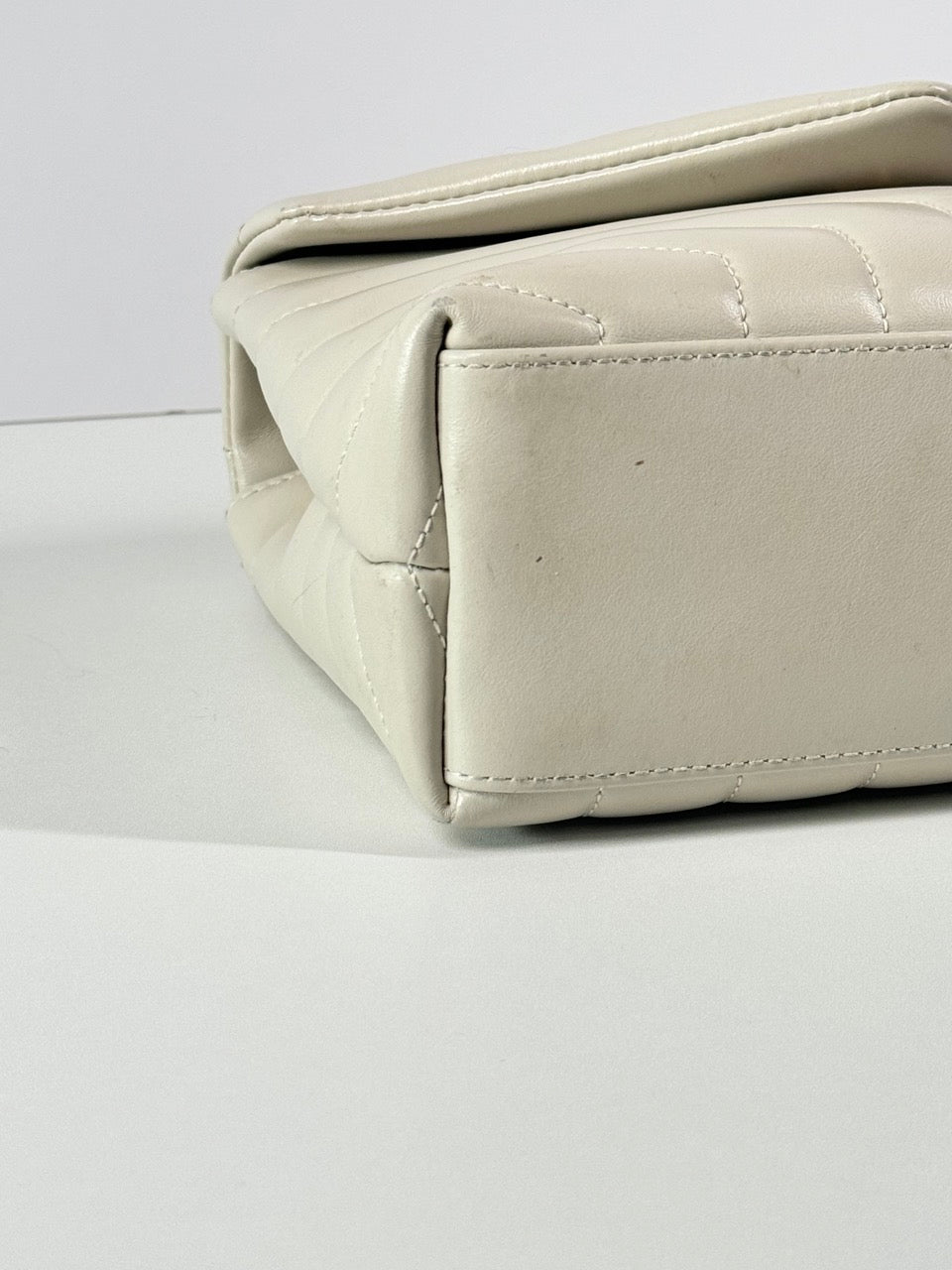 + THE LOULOU, TOPSTITCHED WITH SAINT LAURENT'S ICONIC CHEVRON QUILTING, FEATURES TWO COMPARTMENTS. ITS ADJUSTABLE AND DETACHABLE LEATHER STRAP OFFERS DIFFERENT CARRIES. INTERIOR ZIPPED POCKET, THREE CARD SLOTS.