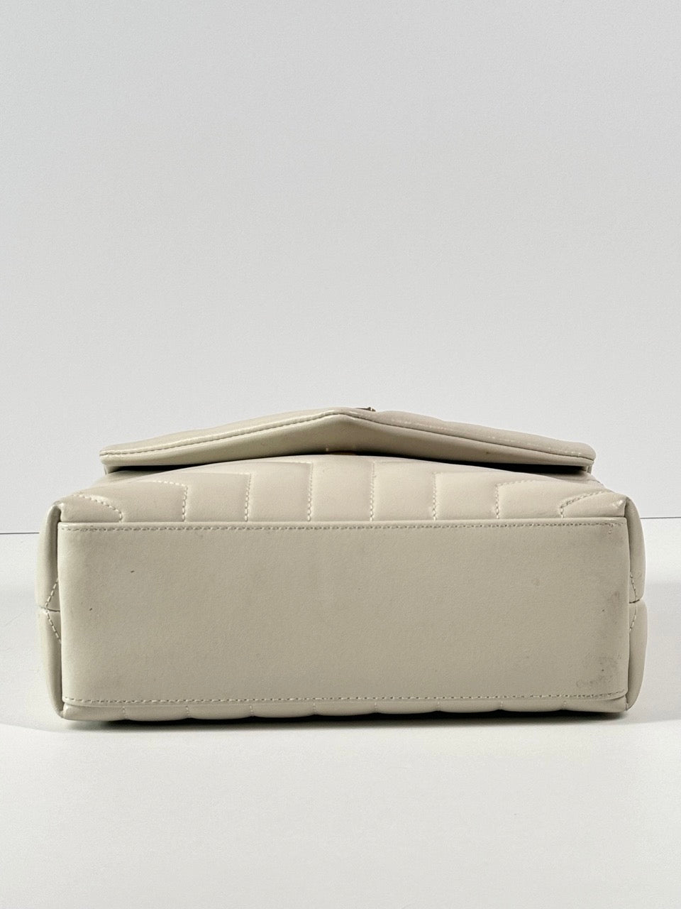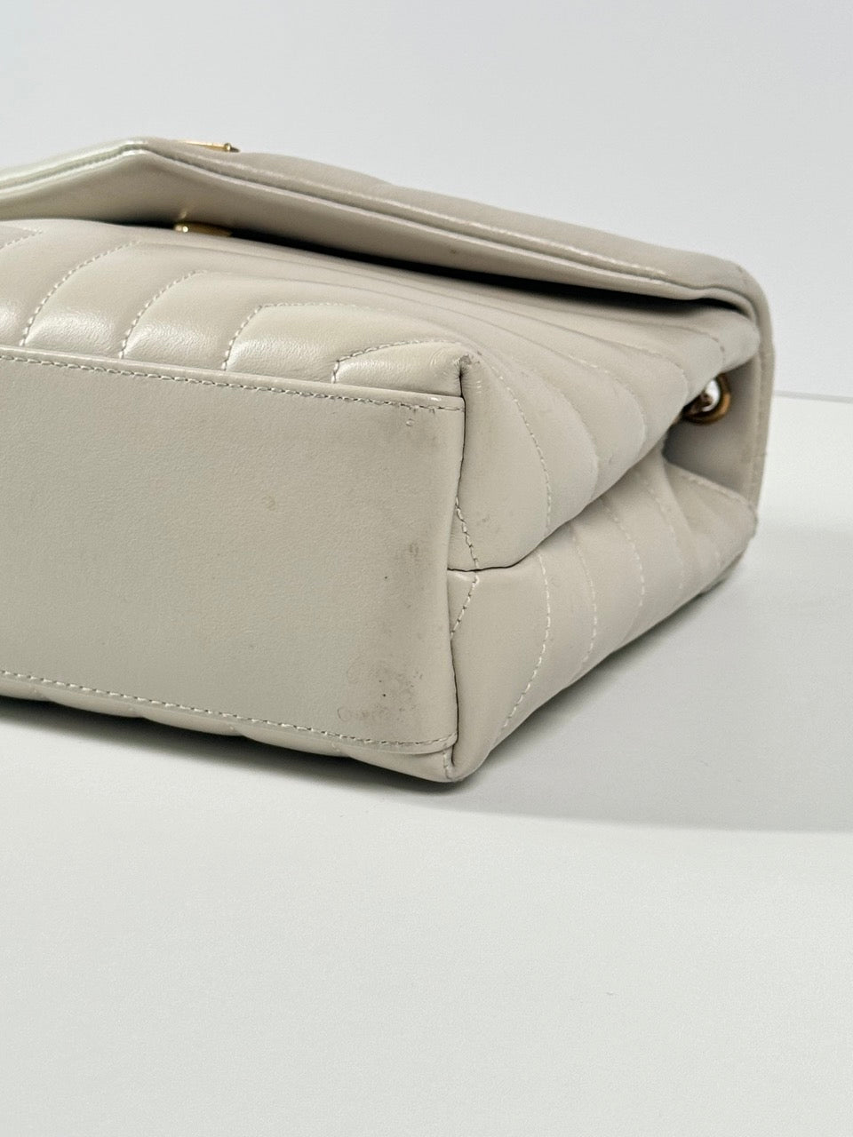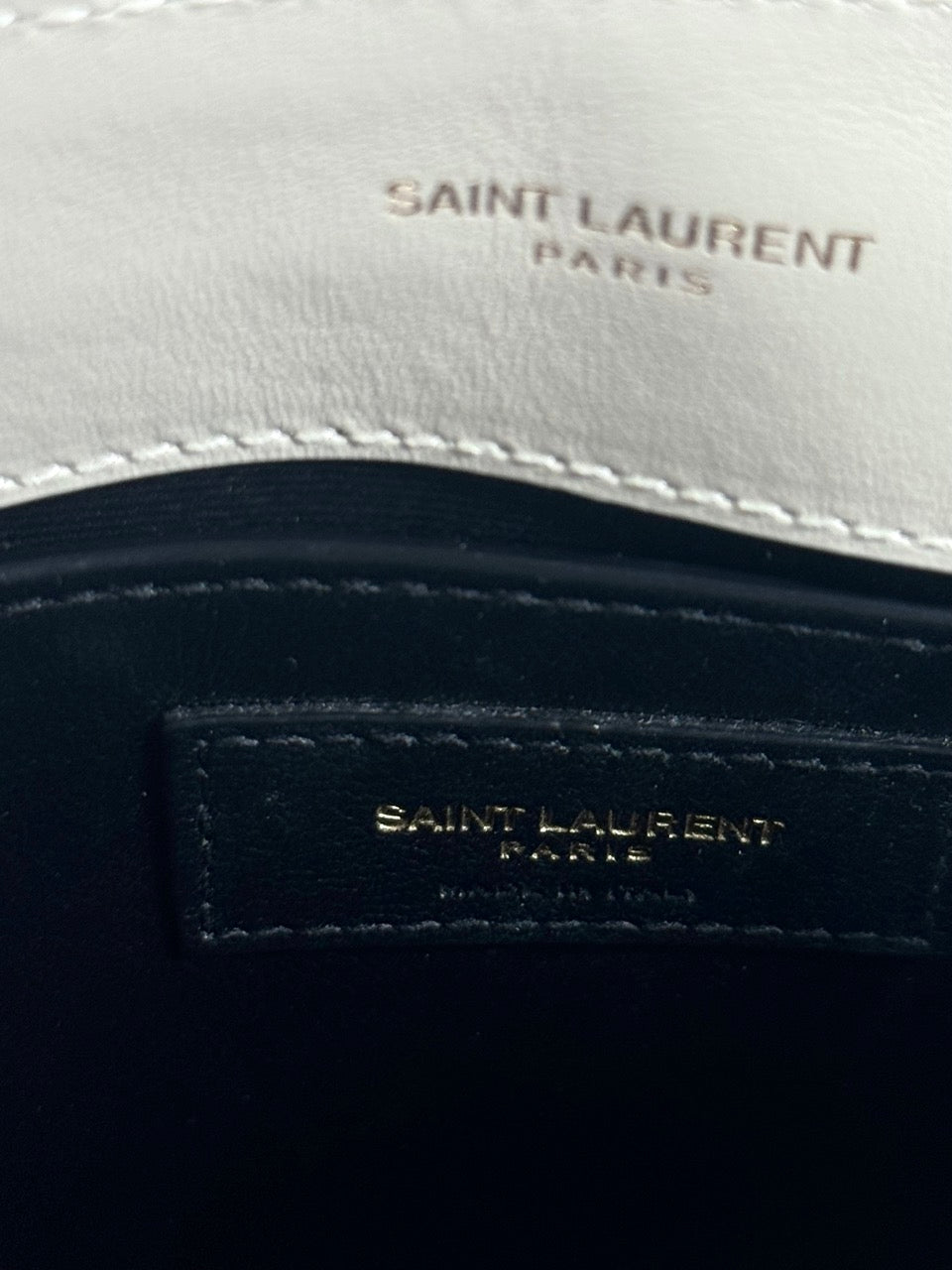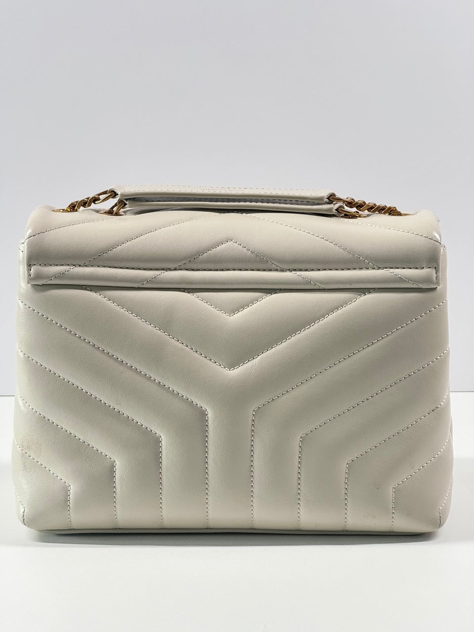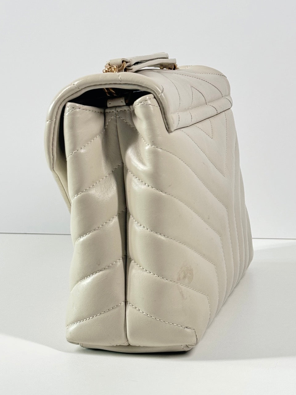 + THE LOULOU, TOPSTITCHED WITH SAINT LAURENT'S ICONIC CHEVRON QUILTING, FEATURES TWO COMPARTMENTS. ITS ADJUSTABLE AND DETACHABLE LEATHER STRAP OFFERS DIFFERENT CARRIES. INTERIOR ZIPPED POCKET, THREE CARD SLOTS.