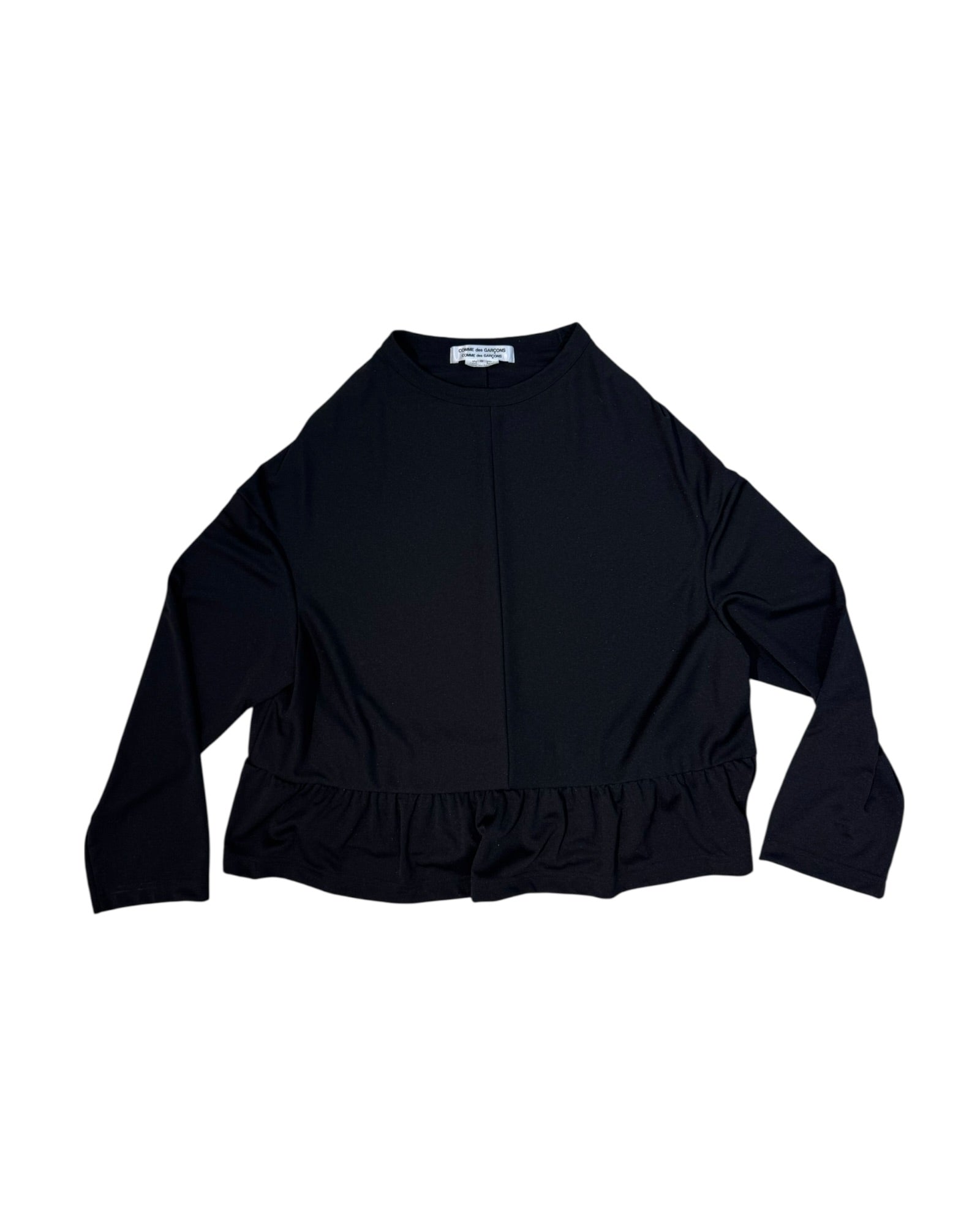 Comme des Garçons frequently explores volume through subtle structural shifts rather than overt construction. During the late 2000s and early 2010s, Rei Kawakubo experimented with softer silhouettes that translated the brand’s architectural philosophy into everyday garments. This top reflects that approach, using a minimal jersey base interrupted by a sculptural ruffle panel that alters the garment’s proportions.