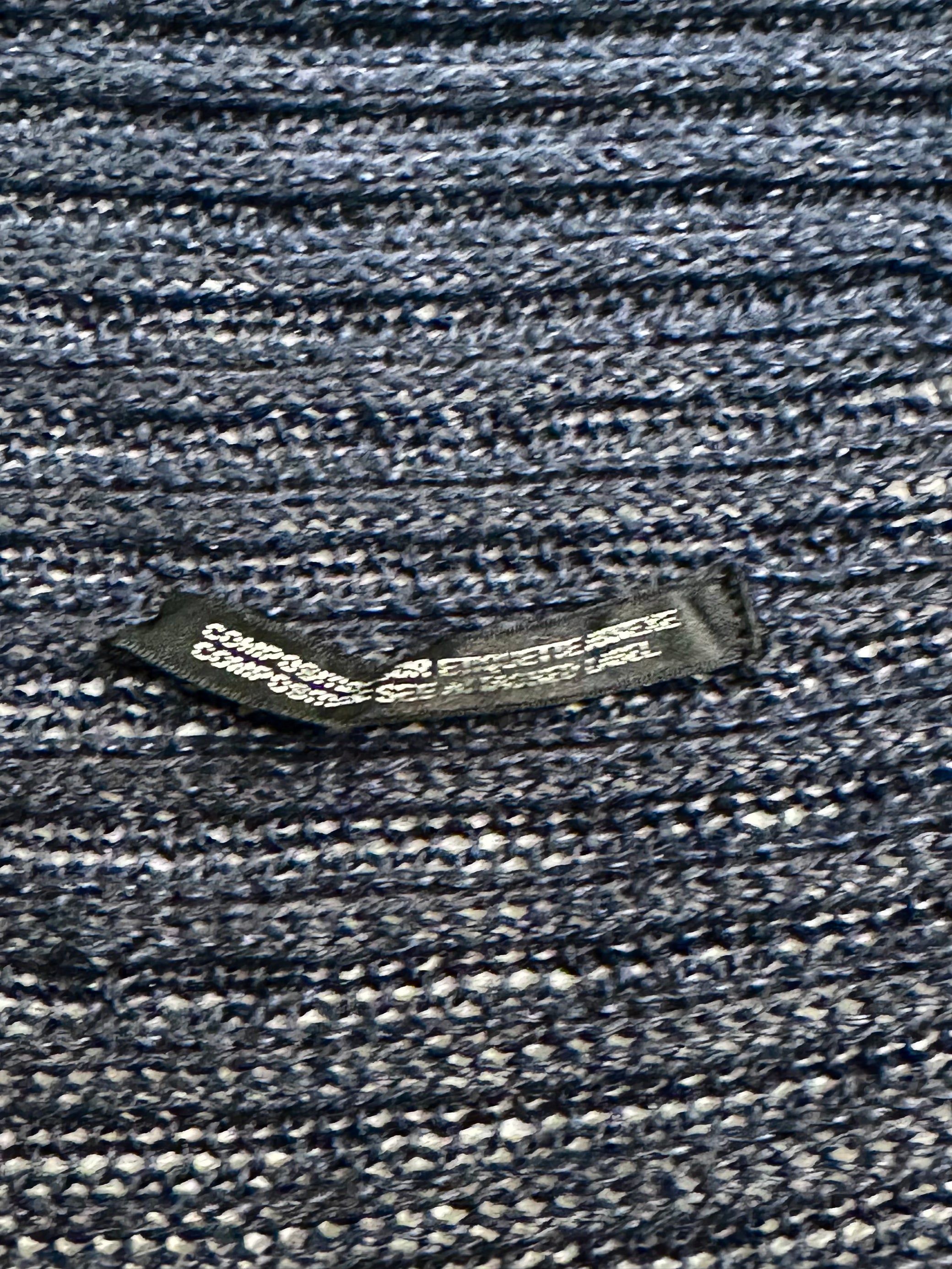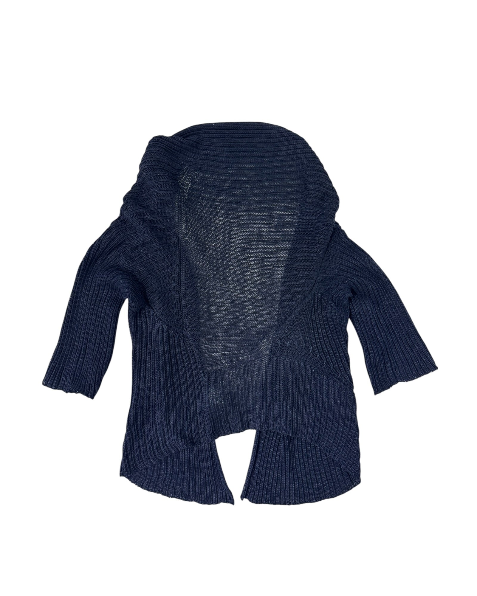 This ribbed cardigan reflects that sensibility. Constructed from 100% linen, the garment uses a heavy vertical rib knit that creates natural structure while maintaining the breathable irregular texture characteristic of linen yarn. The open-front silhouette drapes organically around the body, while the sculptural shawl-like collar and elongated sleeves introduce the relaxed, slightly architectural proportions often associated with Yohji Yamamoto’s knitwear. Produced in Japan and bearing a Y’s label, the piece captures the understated elegance that defines the brand’s approach to everyday garments.