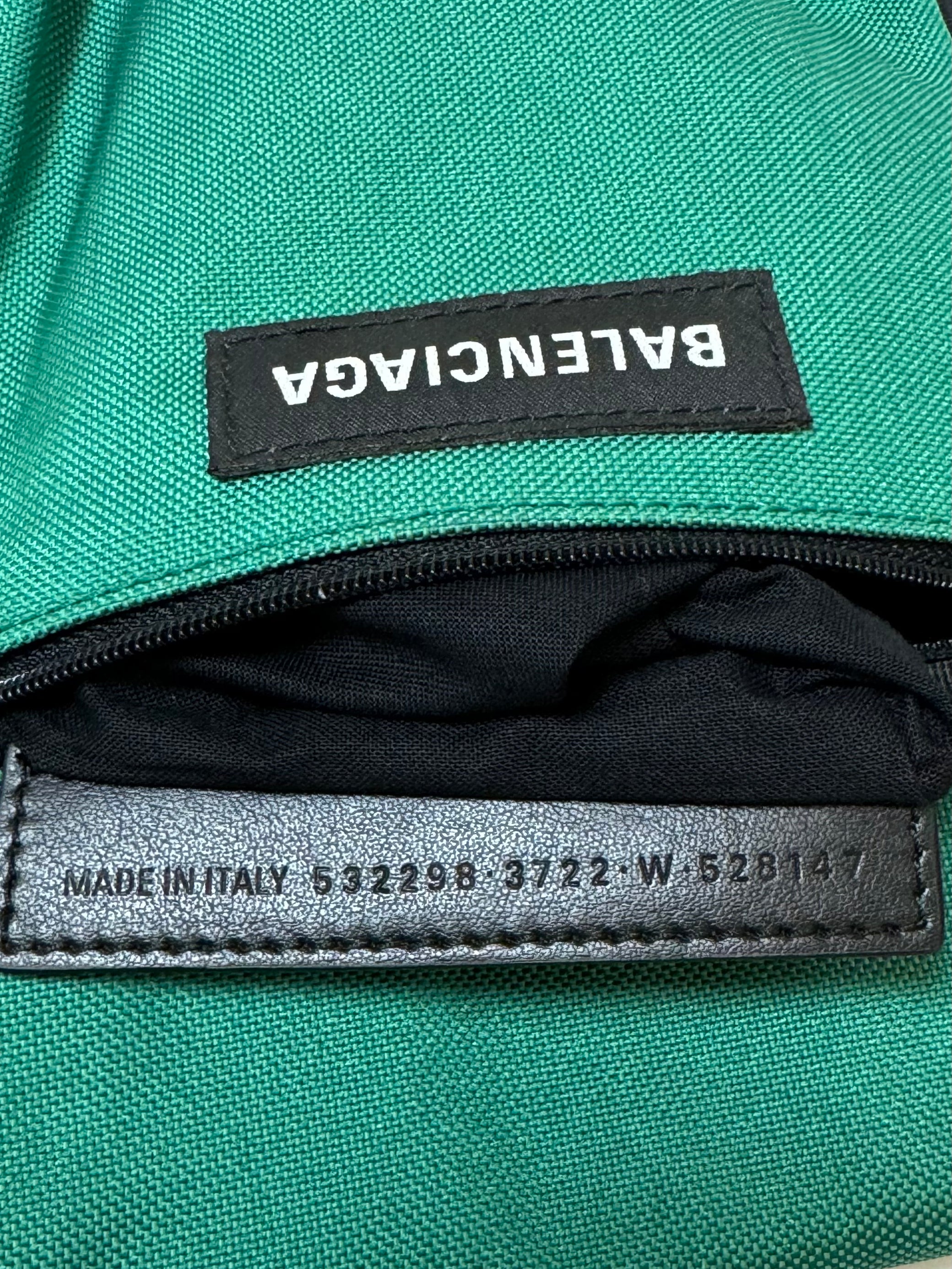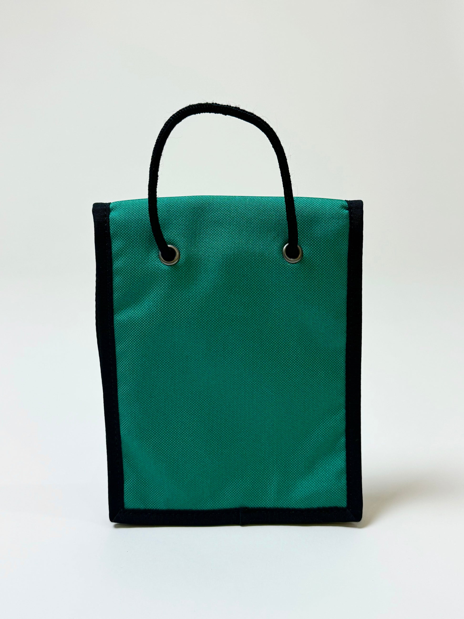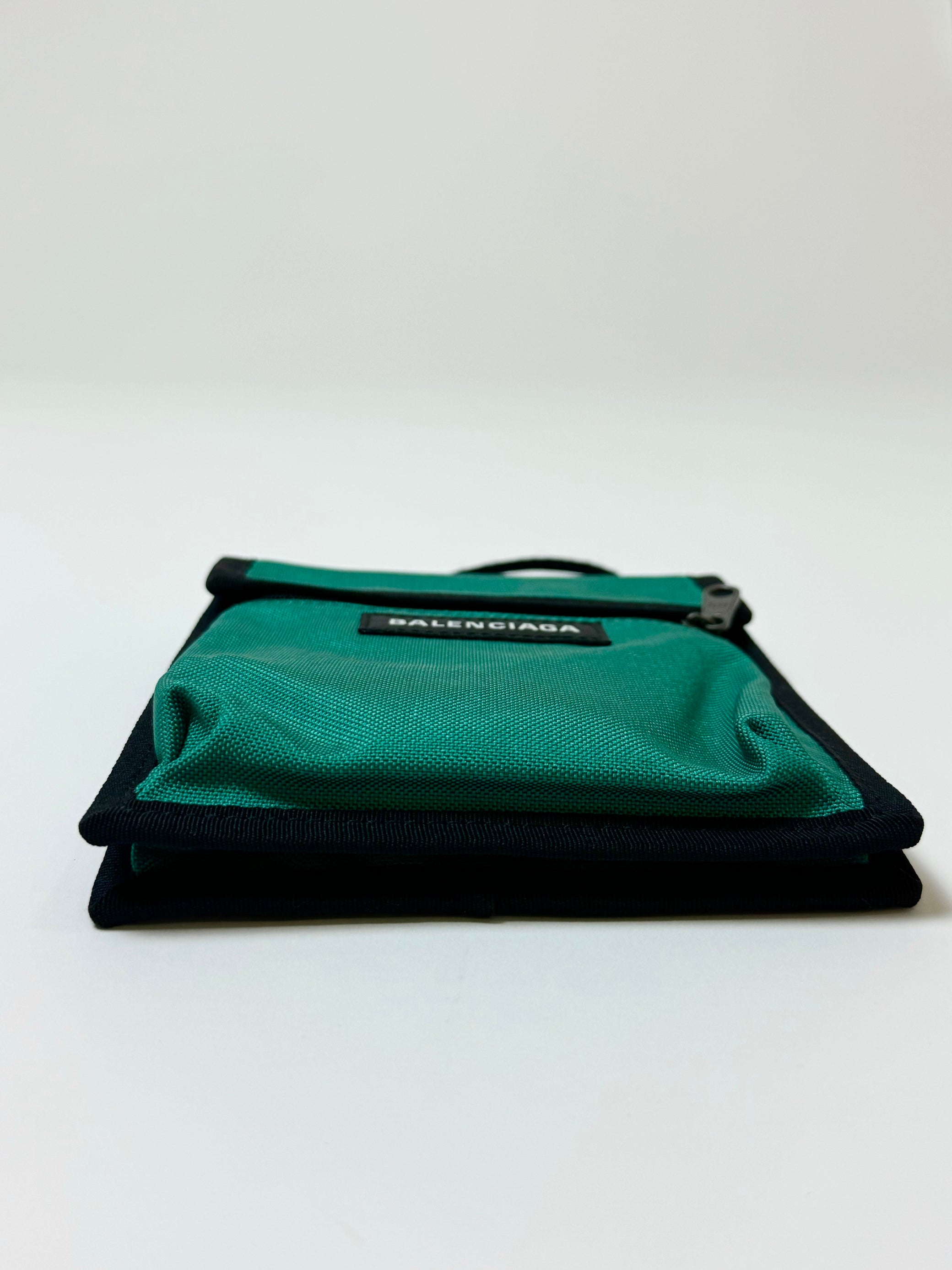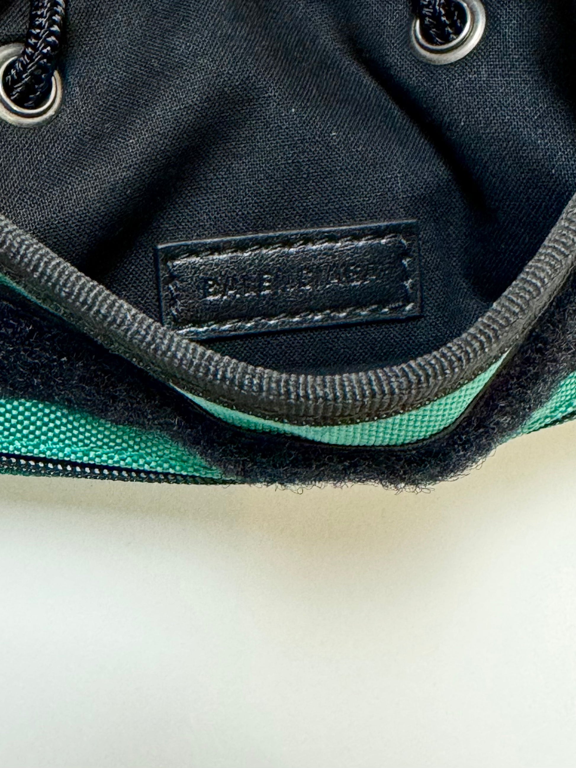 Nylon canvas pouch in green. Grosgrain trim in black throughout. Drawstring shoulder strap. Textile logo patch and zippered pocket at face.