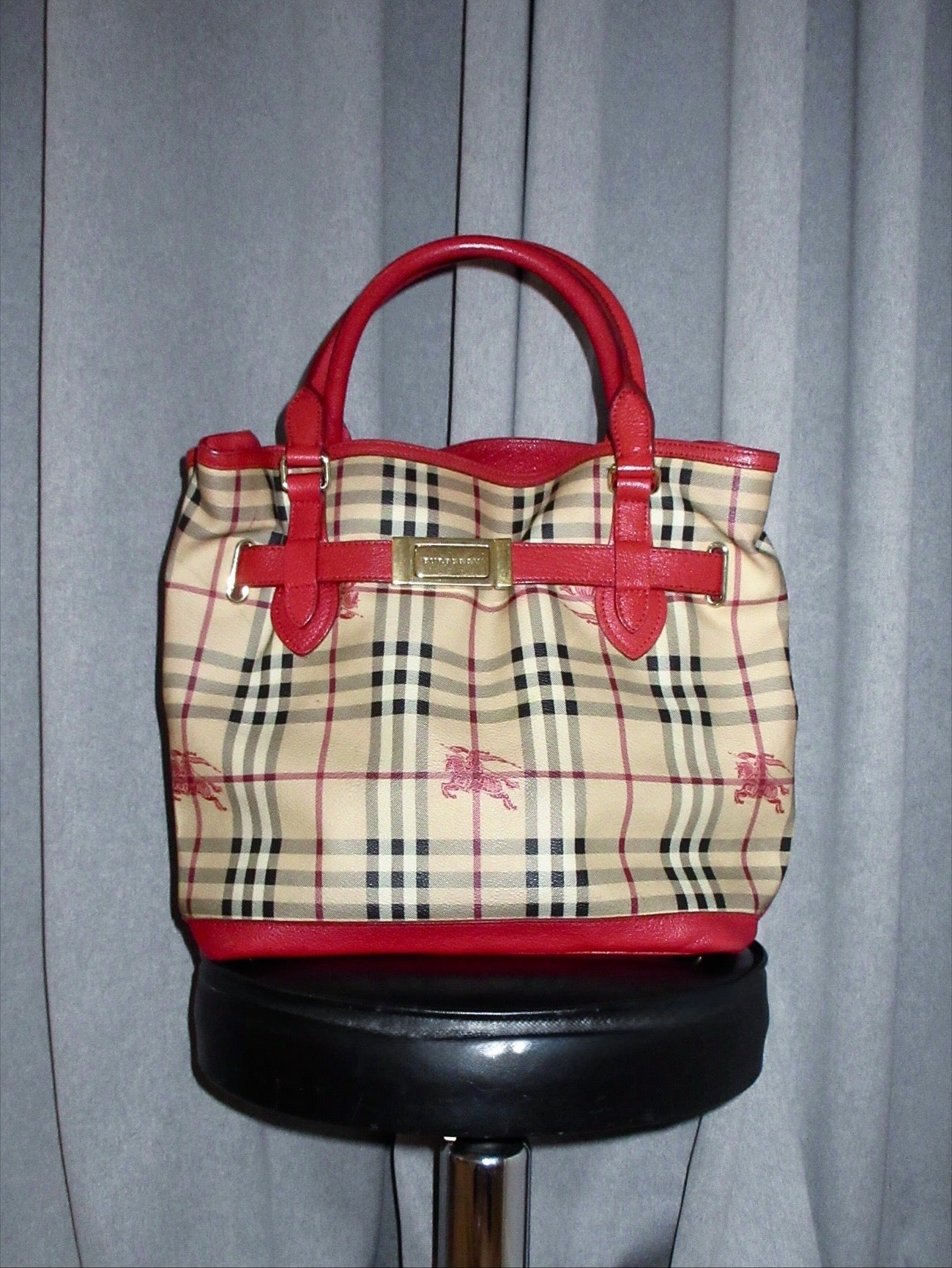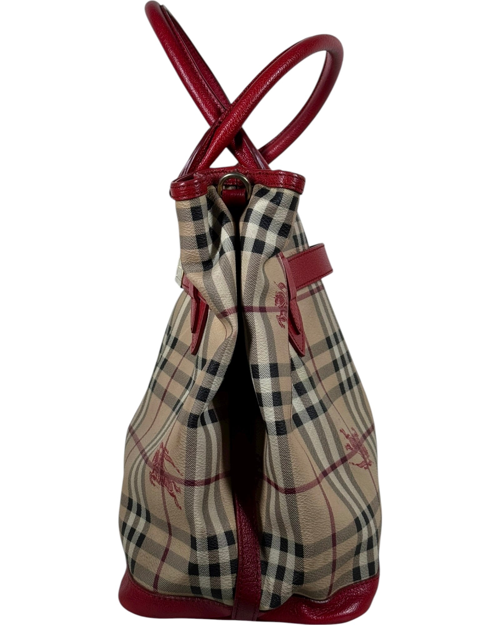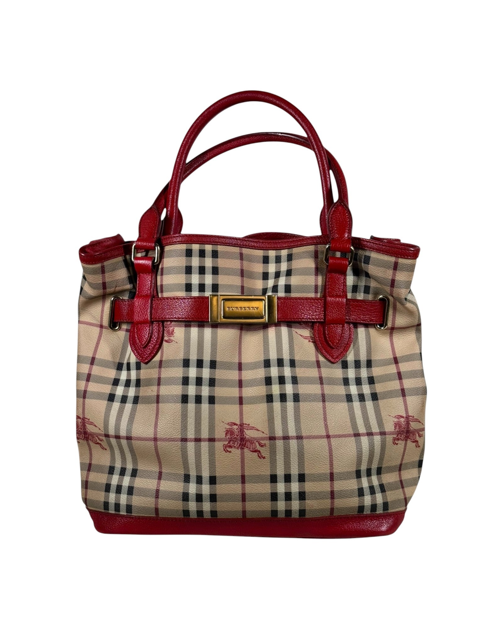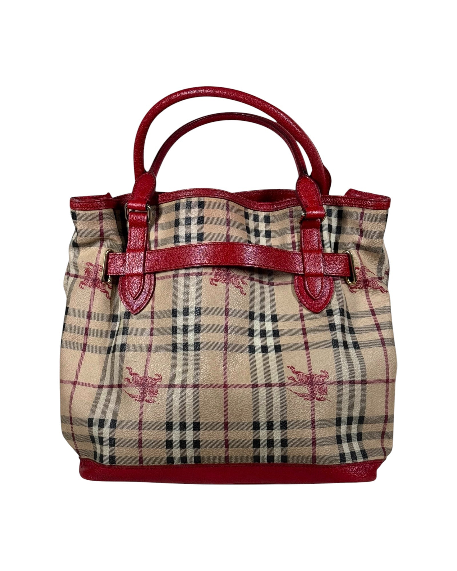 Structured Burberry Prorsum line tote, crafted in Haymarket print with tonal equestrian knight motifs and red leather detailing. Finished with gold-tone hardware and protective base studs.
