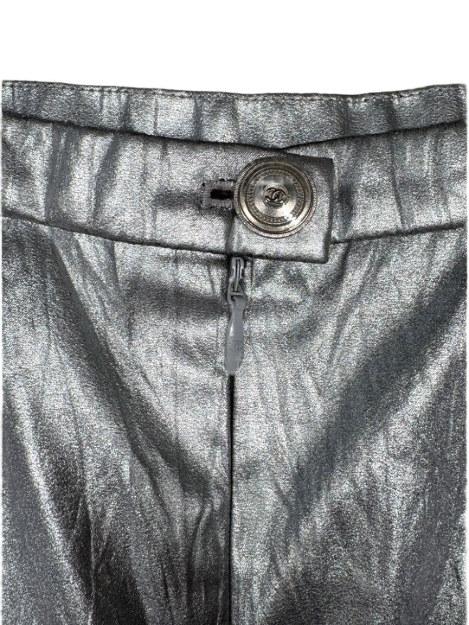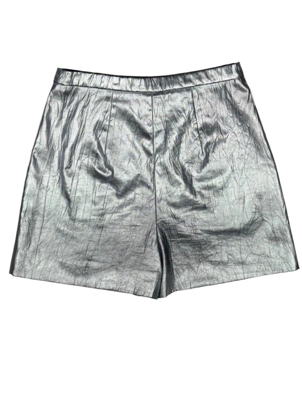 + FW13 RTW (estimate) faux leather high wasted shorts. "CC" logo button at front zipper closure. Satin lining. Composition: 100% polyester.