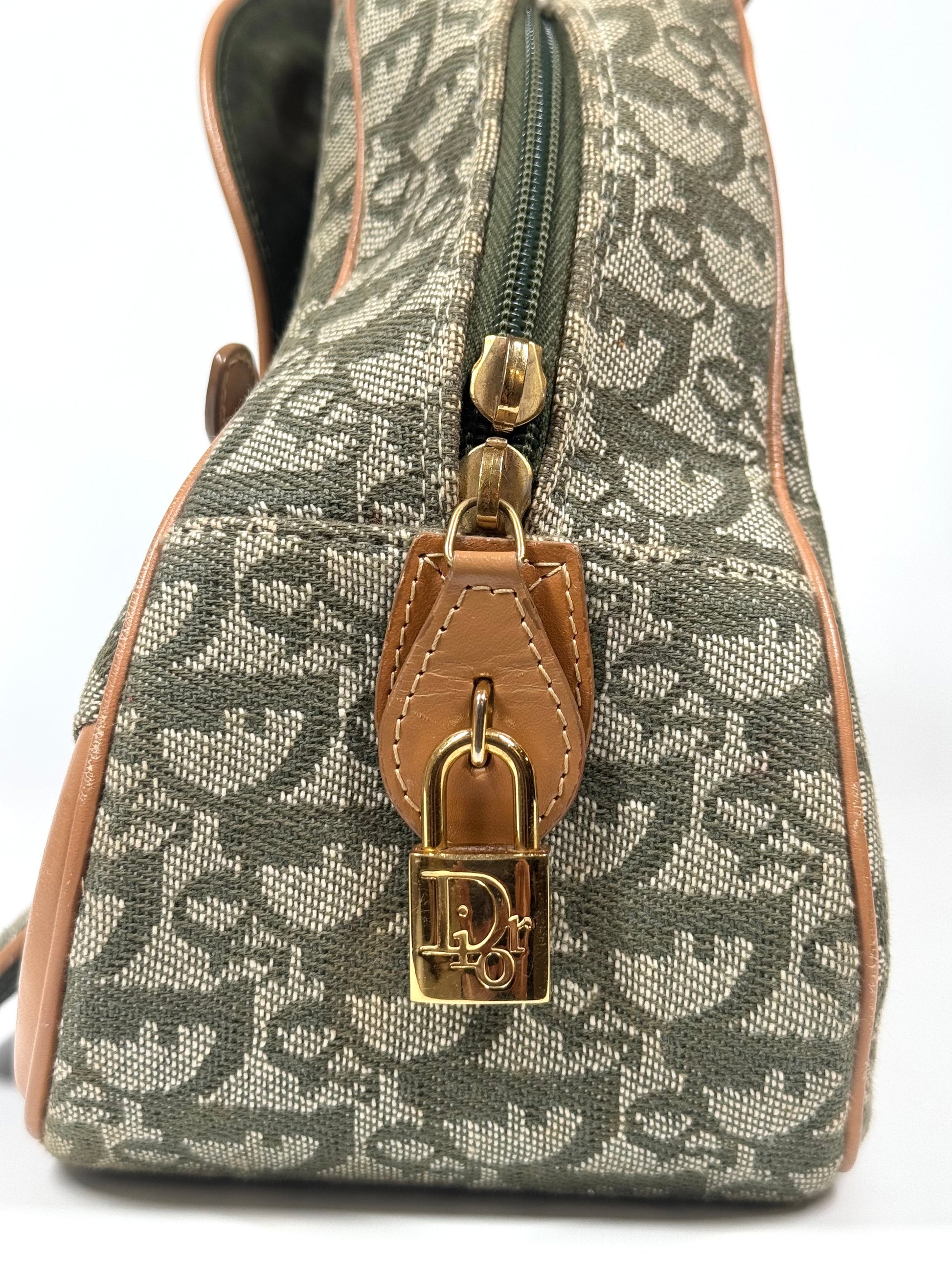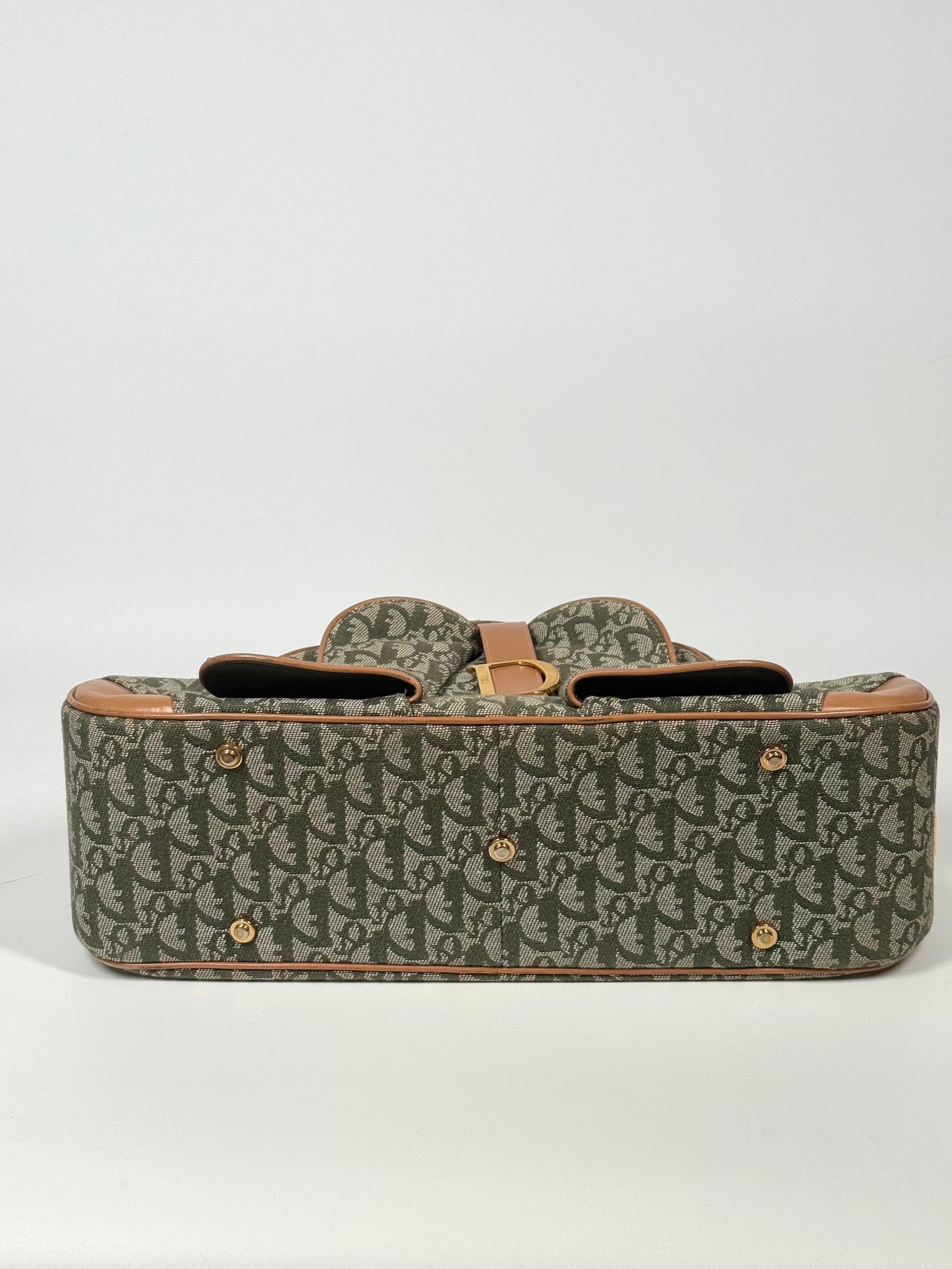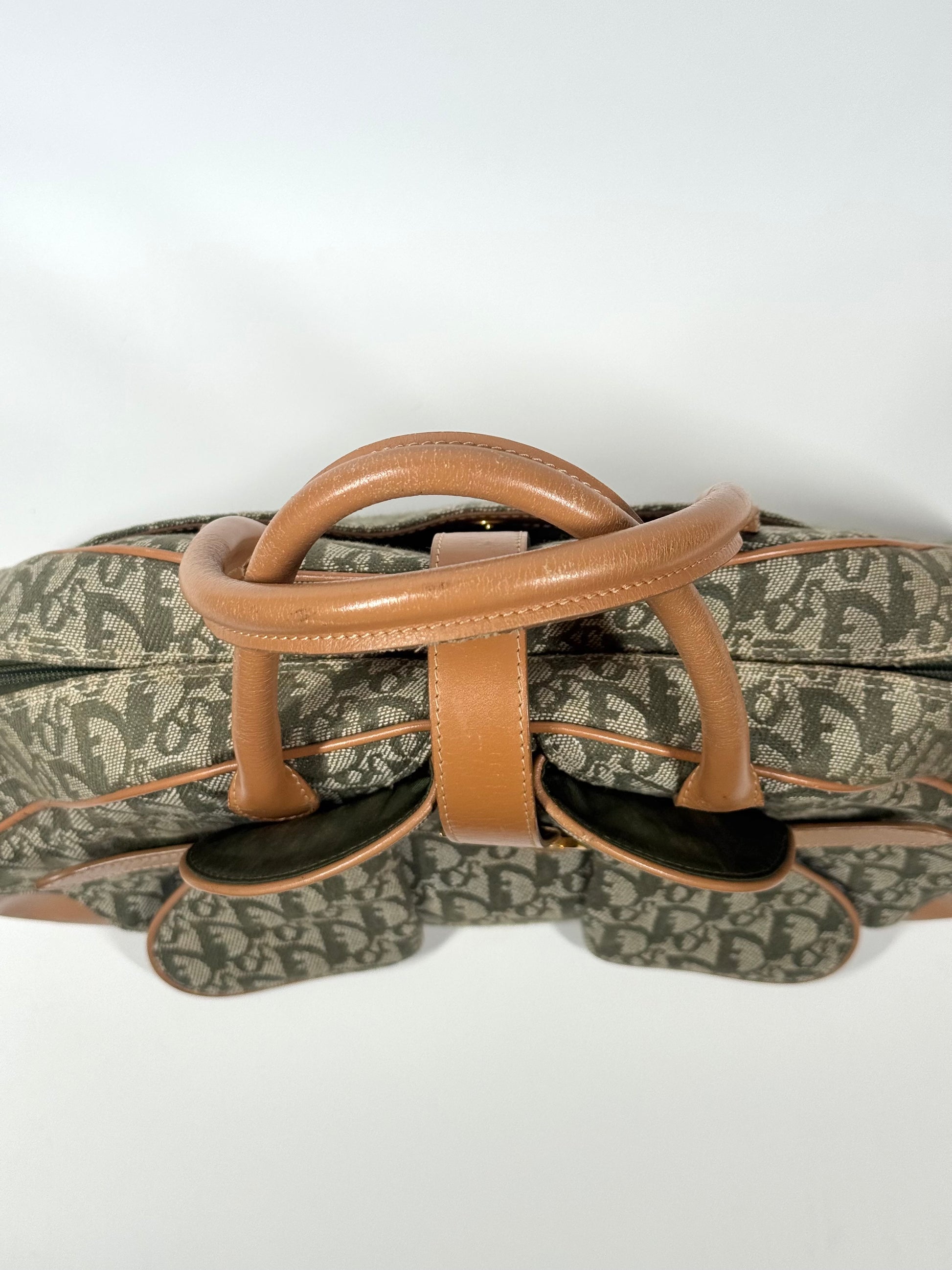 A standout from Dior’s early 2000s era, this rare Trotter duffle bag features an exaggerated double saddle silhouette, trimmed in smooth tan leather and finished with the signature oversized ‘D’ charm. The khaki Dior monogram canvas offers a neutral yet iconic aesthetic, ideal for collectors or everyday styling.