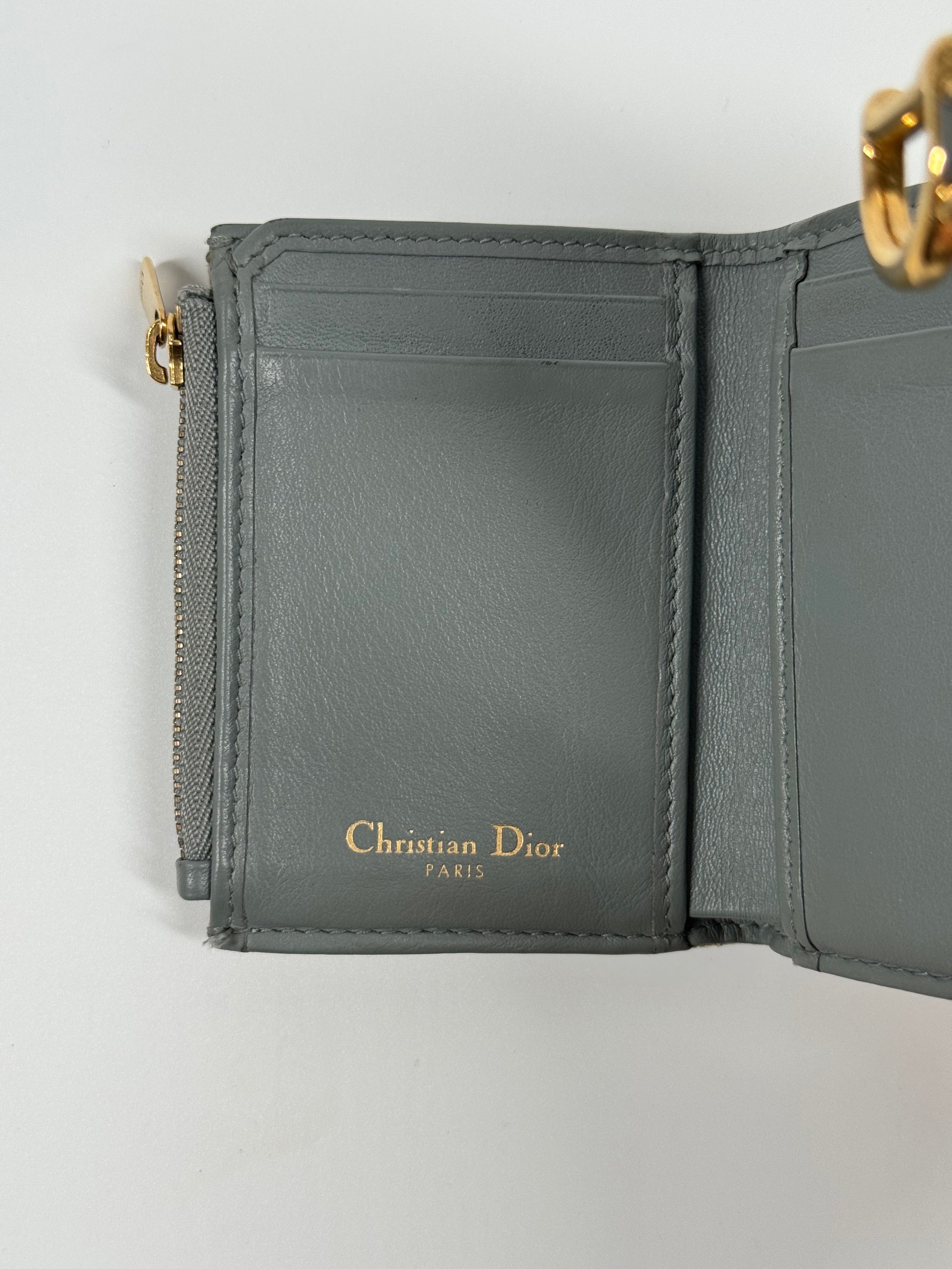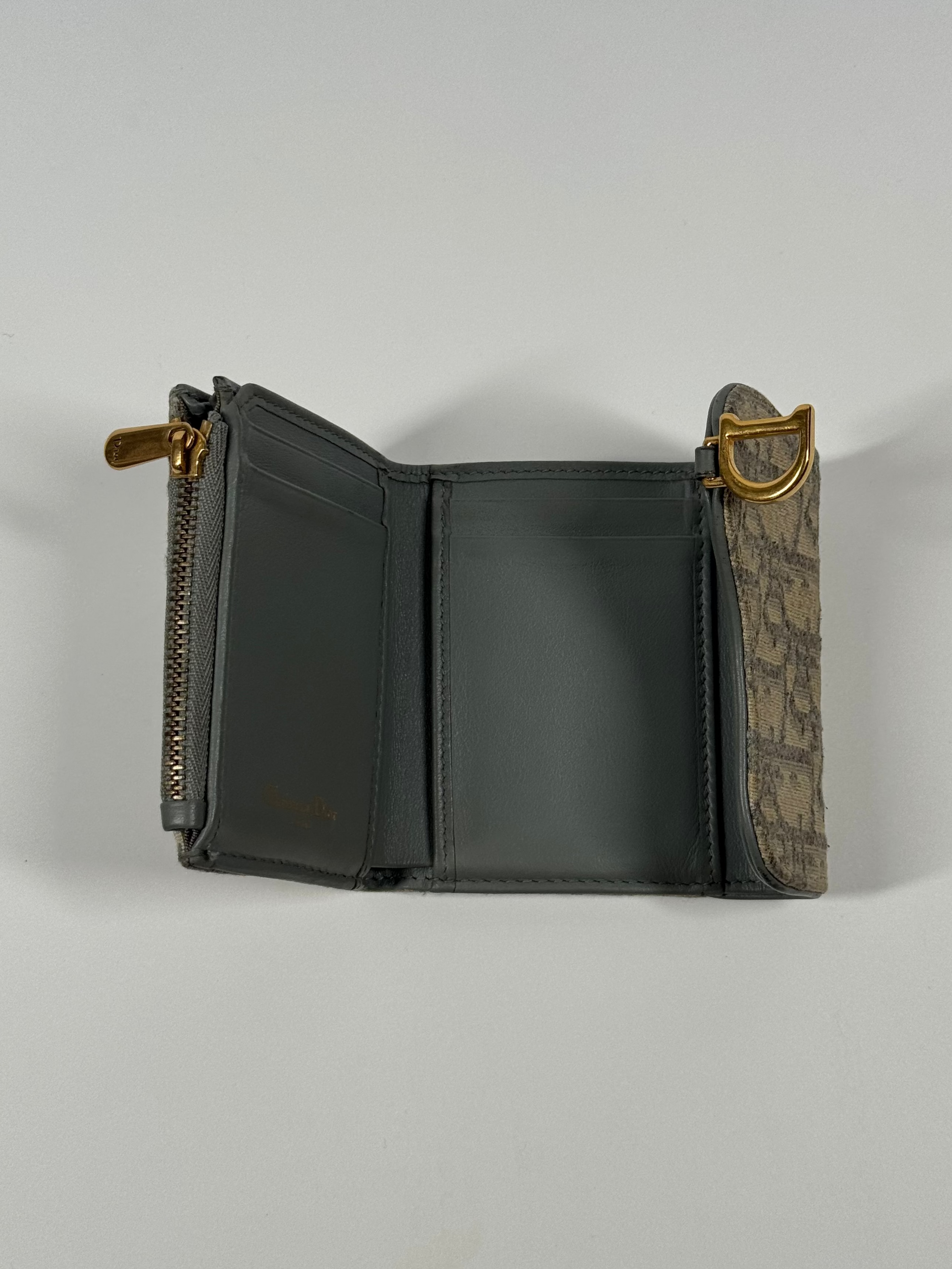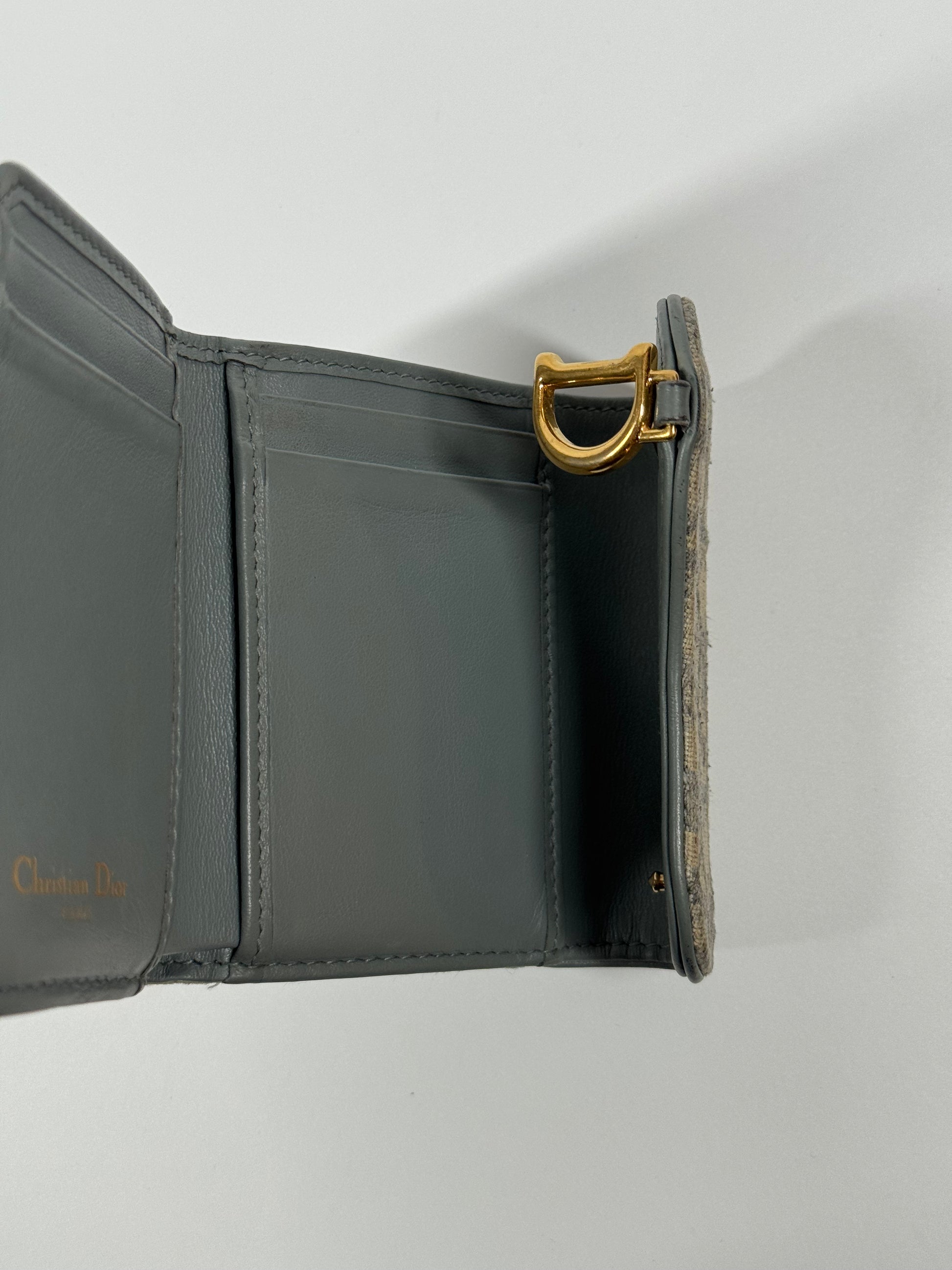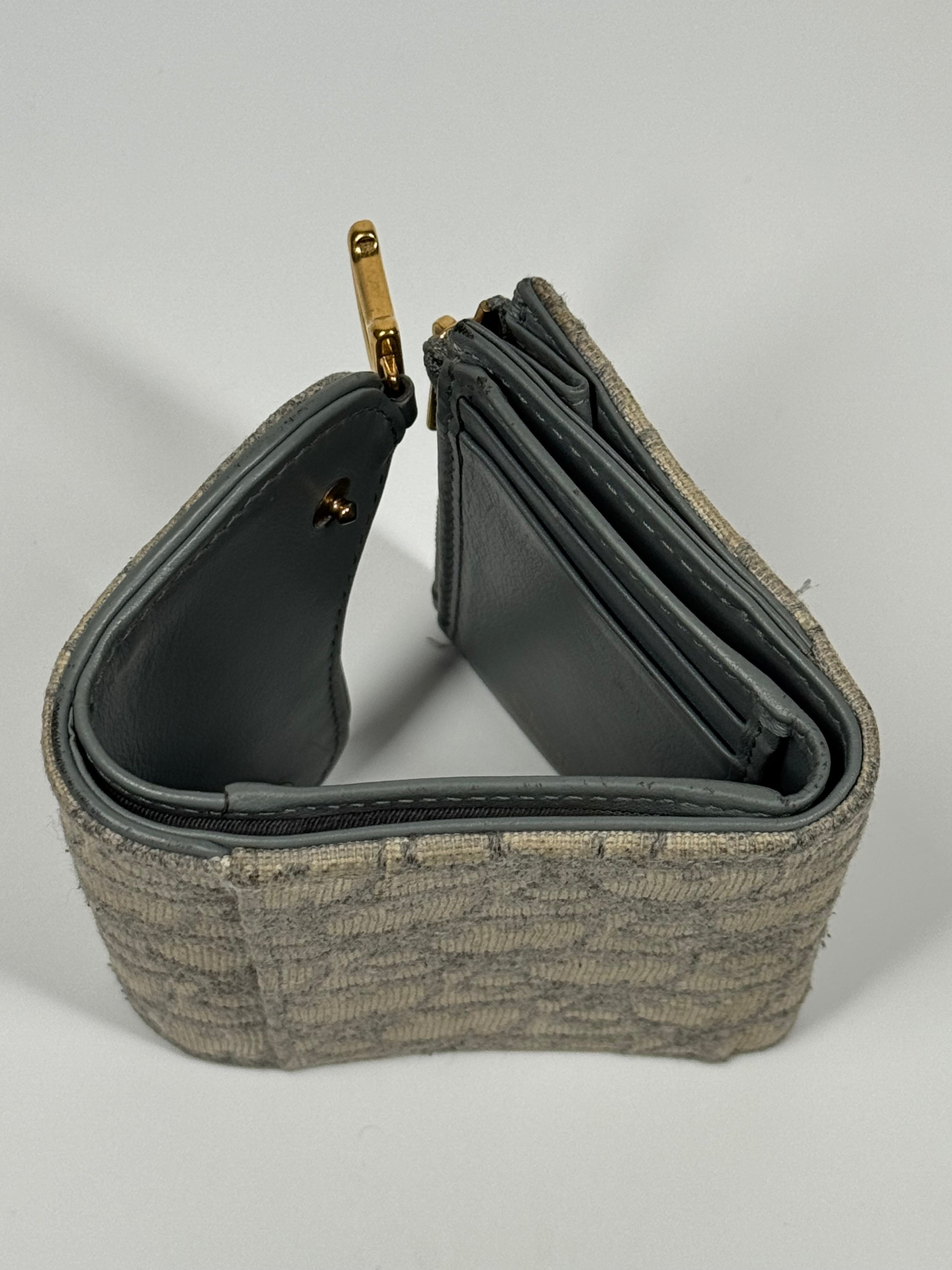 From Dior's early 2000's "Saddle" collection by John Galliano, the wallet is crafted from Dior’s iconic monogram "Oblique" canvas paired with smooth grey leather, featuring gold-tone “D” hardware and a practical interior with card slots and a coin pocket.