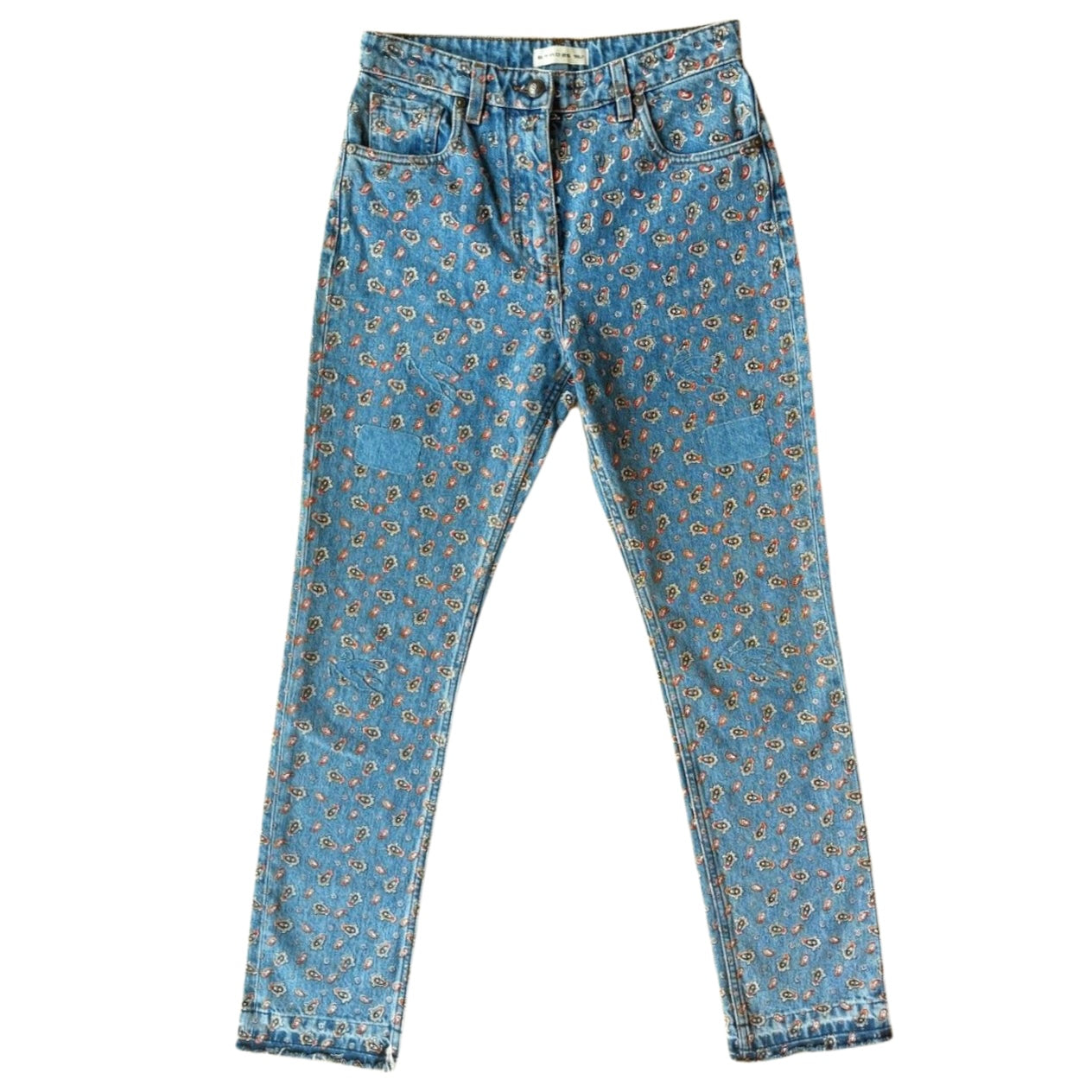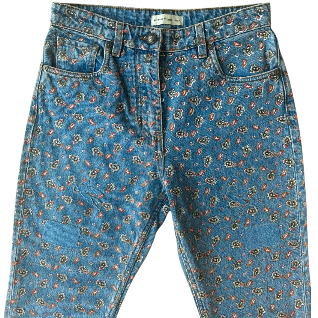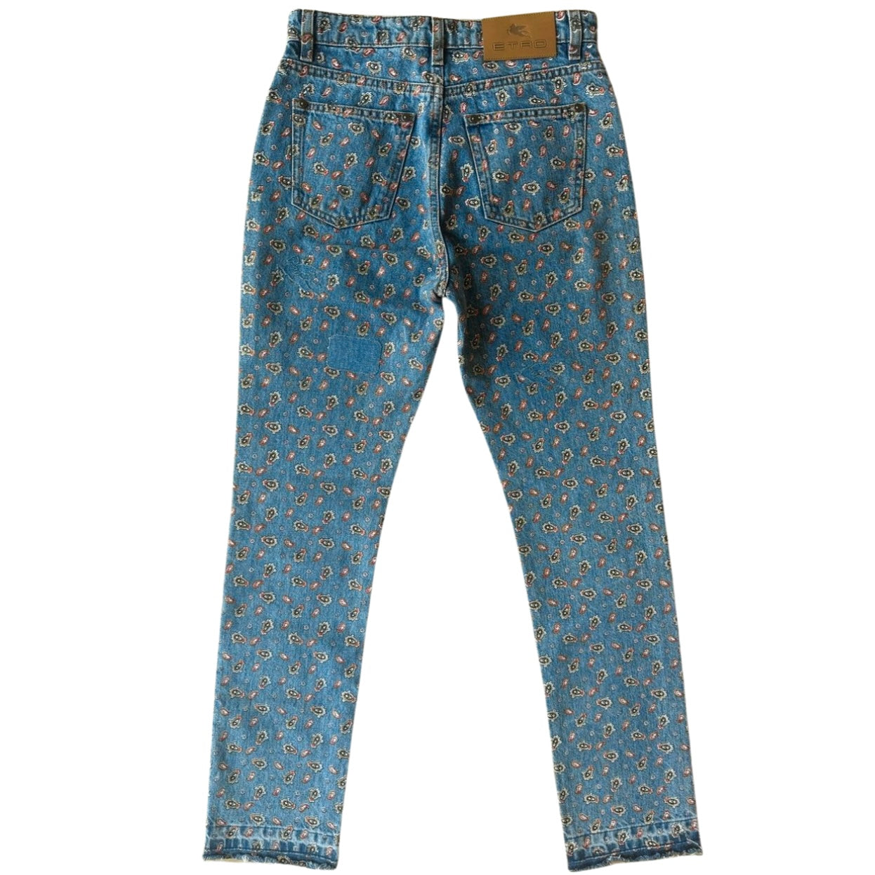Paisley 5 pocket denim jeans featuring patchwork and distressed hems and Etro logo patch at back.