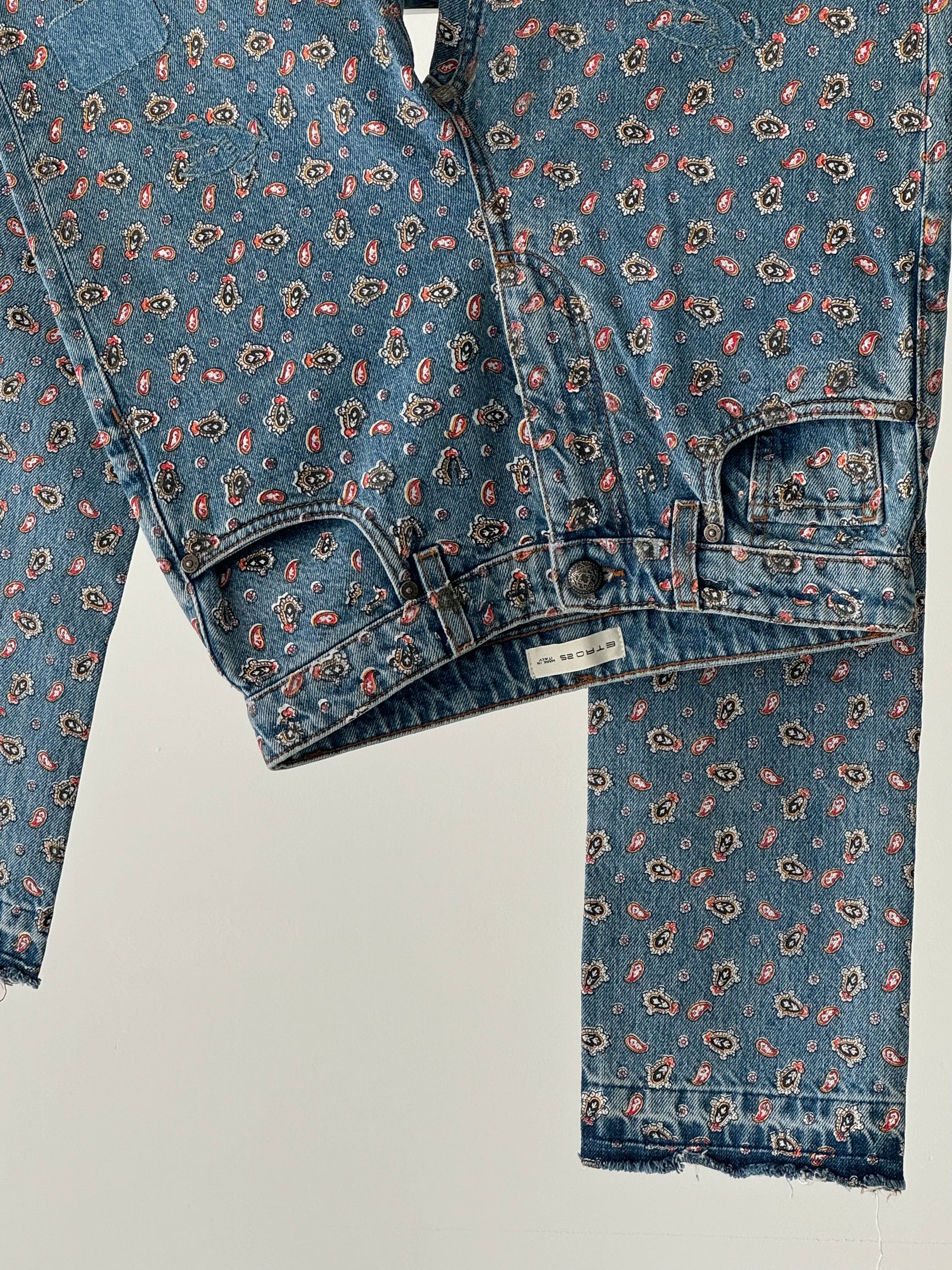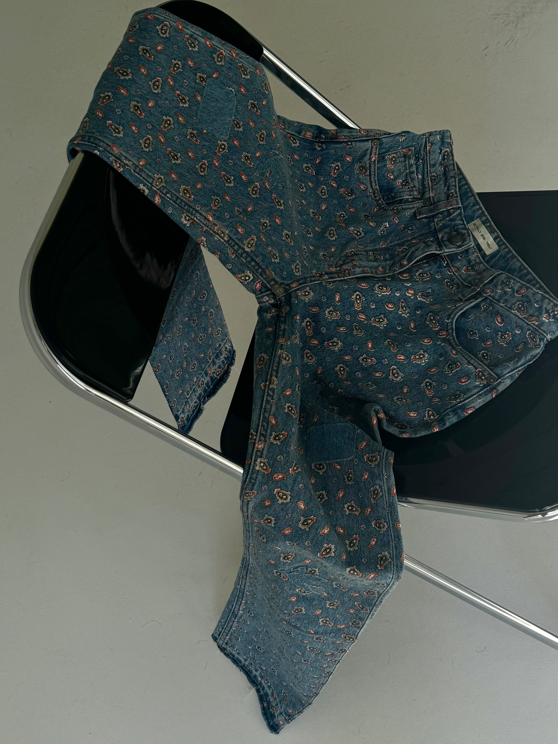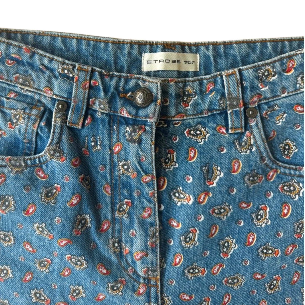 Paisley 5 pocket denim jeans featuring patchwork and distressed hems and Etro logo patch at back.