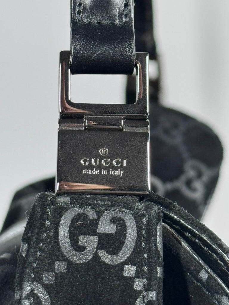 A black GG monogram shoulder bag from Gucci, produced during the late 1990s to early 2000s period. This model reflects the understated, logo-forward accessories language associated with the Tom Ford–era Gucci accessories output—focused on streamlined silhouettes, tonal monogramming, and functional hardware. Designed as a medium shoulder bag with a soft structure and secure clasp closure, intended for everyday wear.