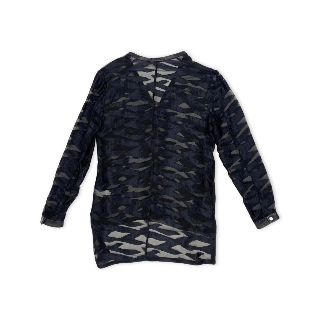 + Long sleeve, printed with mesh accents, button closure at front, leather trim.